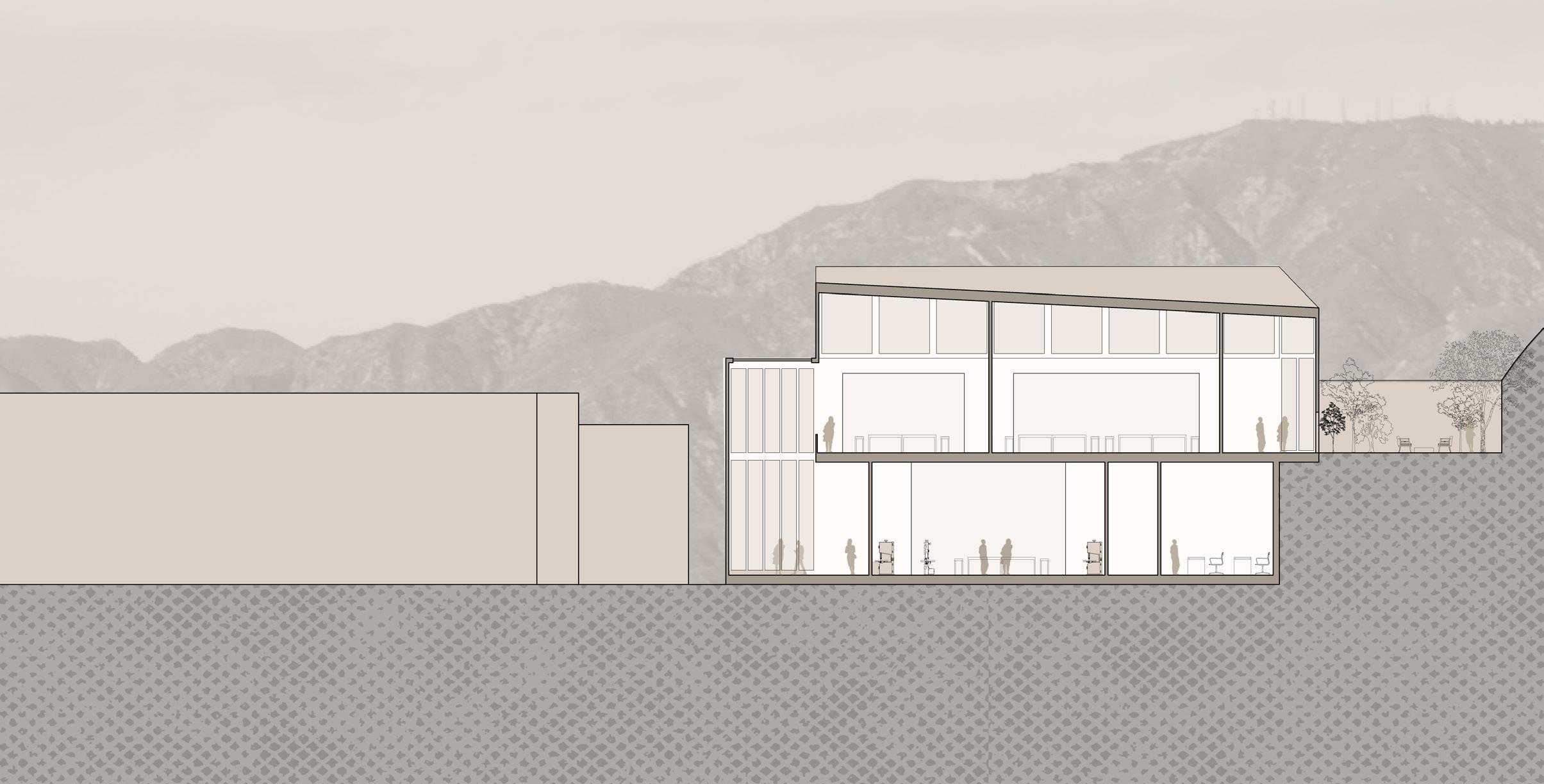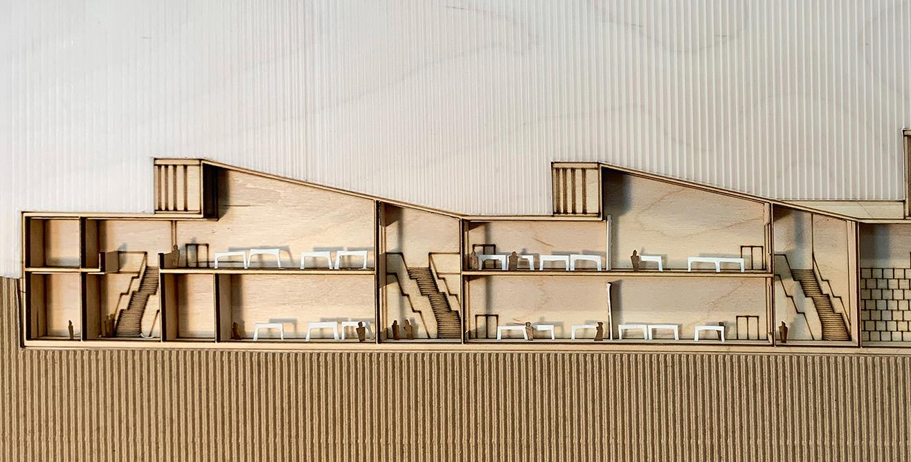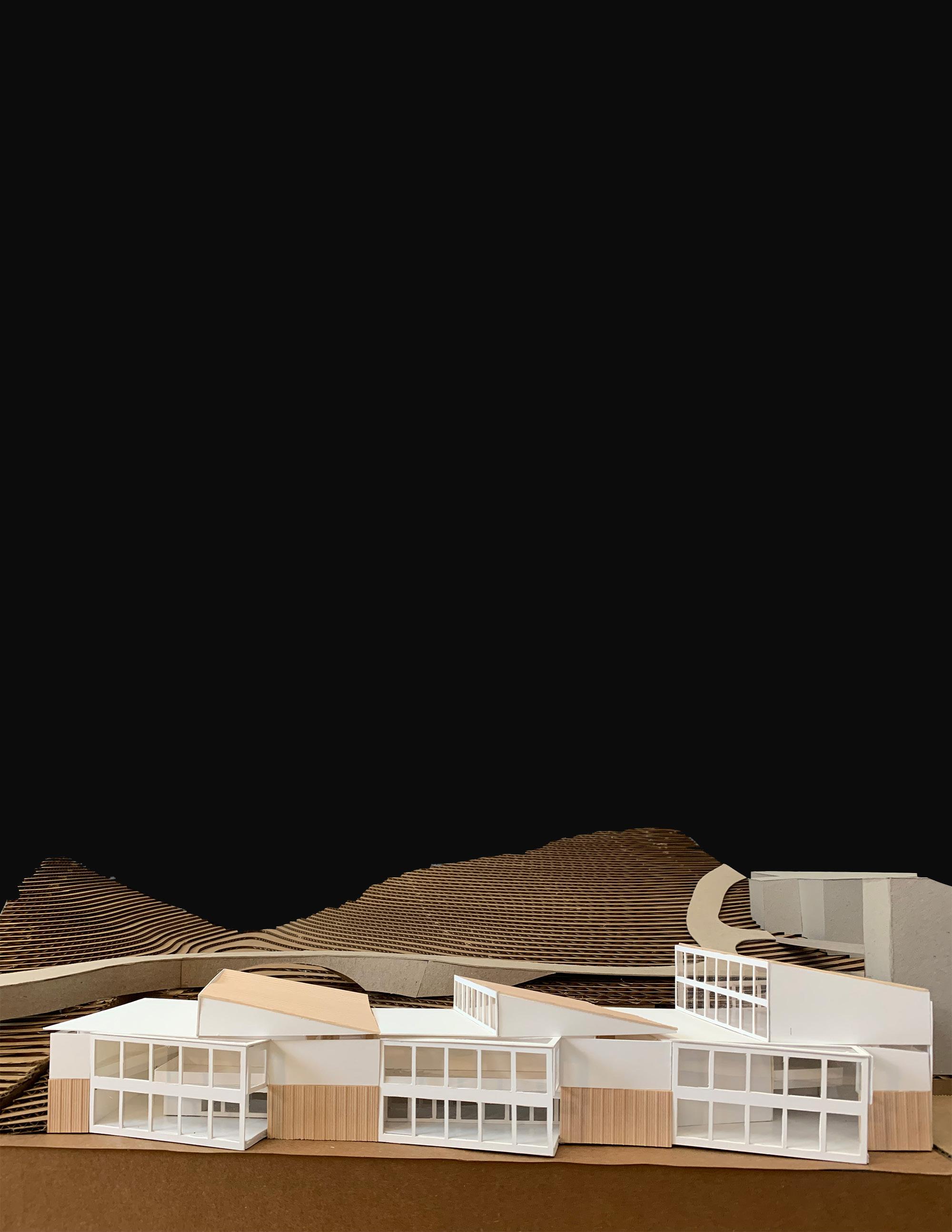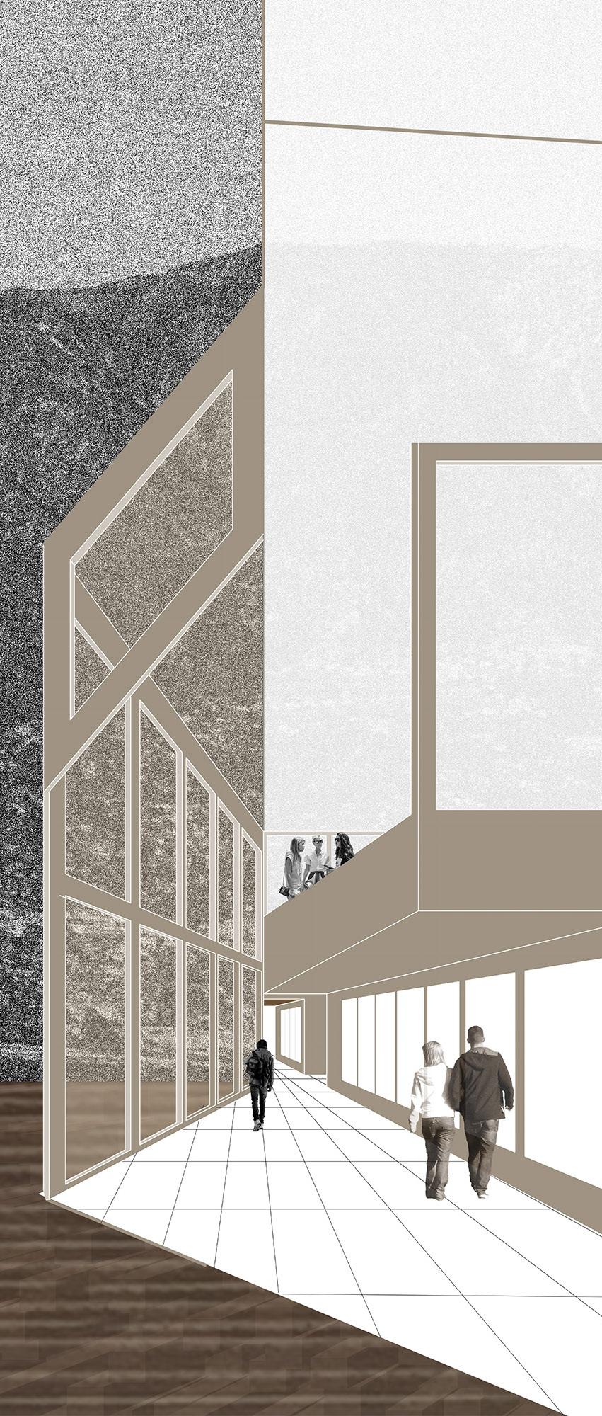 One of the ways the building addresses the site is the openings throughout the building. There are four total, three on the first floor, one on the second. The concept behind this was to have people trickle into the building depending on what class they needed to go to. All facing south, they accommodate students who will mainly be coming from the south side of campus. This angled opening is seen again as the roof. These sawtooth skylights face true north, so a soft light enters the different studio rooms. These angled roofs almost mimic the nature of the surrounding topography and slopes.