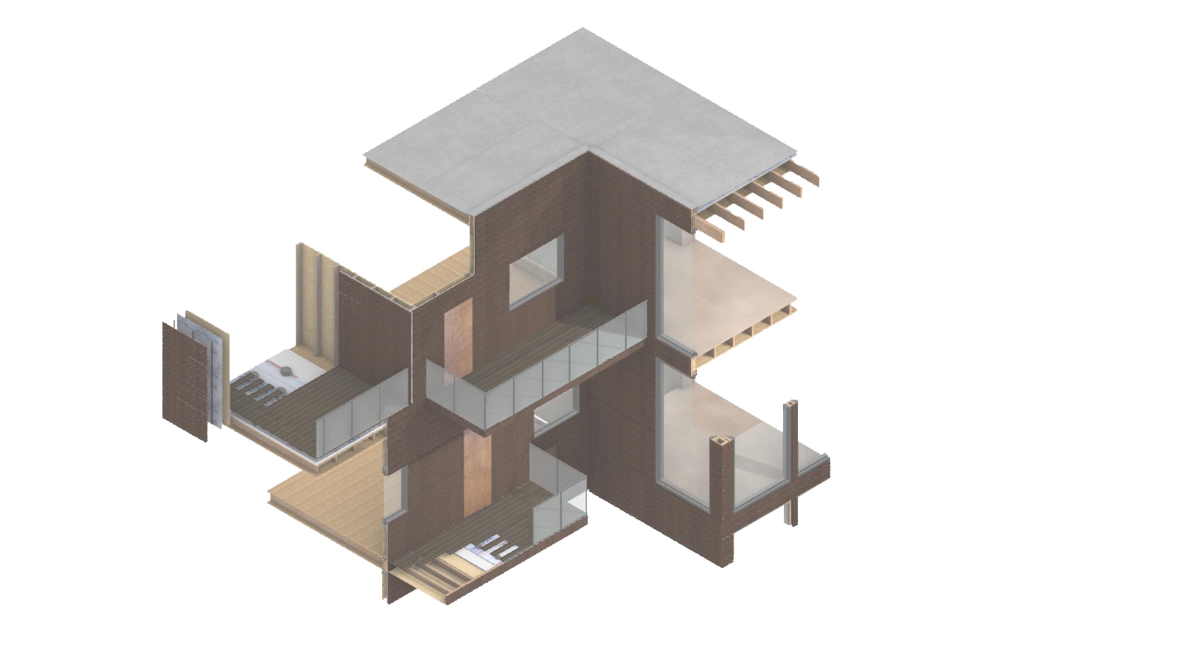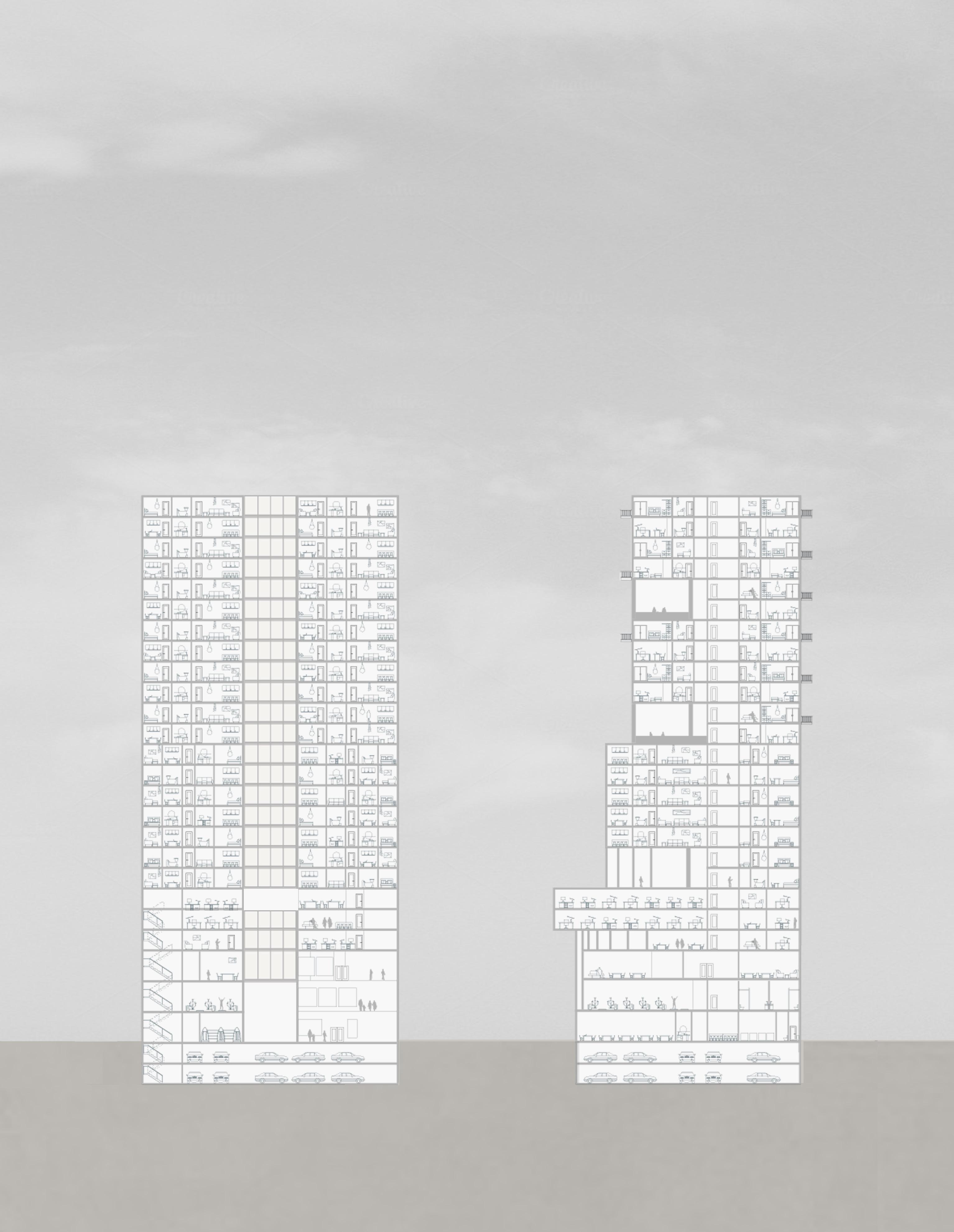 This housing unit is designed for adults and young adults starting and in the middle of their careers. It has 15 Studios and 18 One Bedrooms, as well as 8 Two Bedrooms and 4 Townhouses. The two bedrooms and townhouses are to be used by roommates, not particularly famlilies. On the first floor is a cafe, restaurant, gym, as well as retail space. The layout is one ring on the first residential floor, and then a larger stacked tower on the south side contaning the majority of the units. This layout allows for a large courtyard on the first floor, a roof garden, and an interior atrium with communal spaces, where one can walk over to the large windows overlooking the view. The facade is made of thin horizontal stripes of wood.