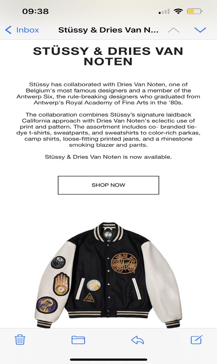 For instance, when looking into the marketing communication mix, it is clear that Stussy utilises many forms of media to connect with their consumers, the use of direct marketing with their digital newsletter, informs consumers of collection drops and brand news. This establishes communication to target a specific audience. From a consumers perspective, this may serve as a way for the brand to bond with their audience as they are offering insights to the brands releases before the general public get to see, making those recieving the newsletter feel more included.