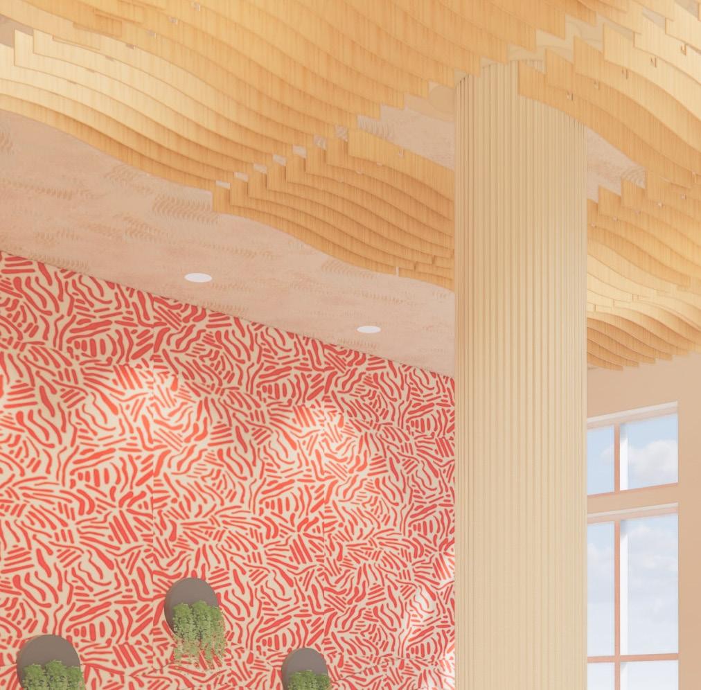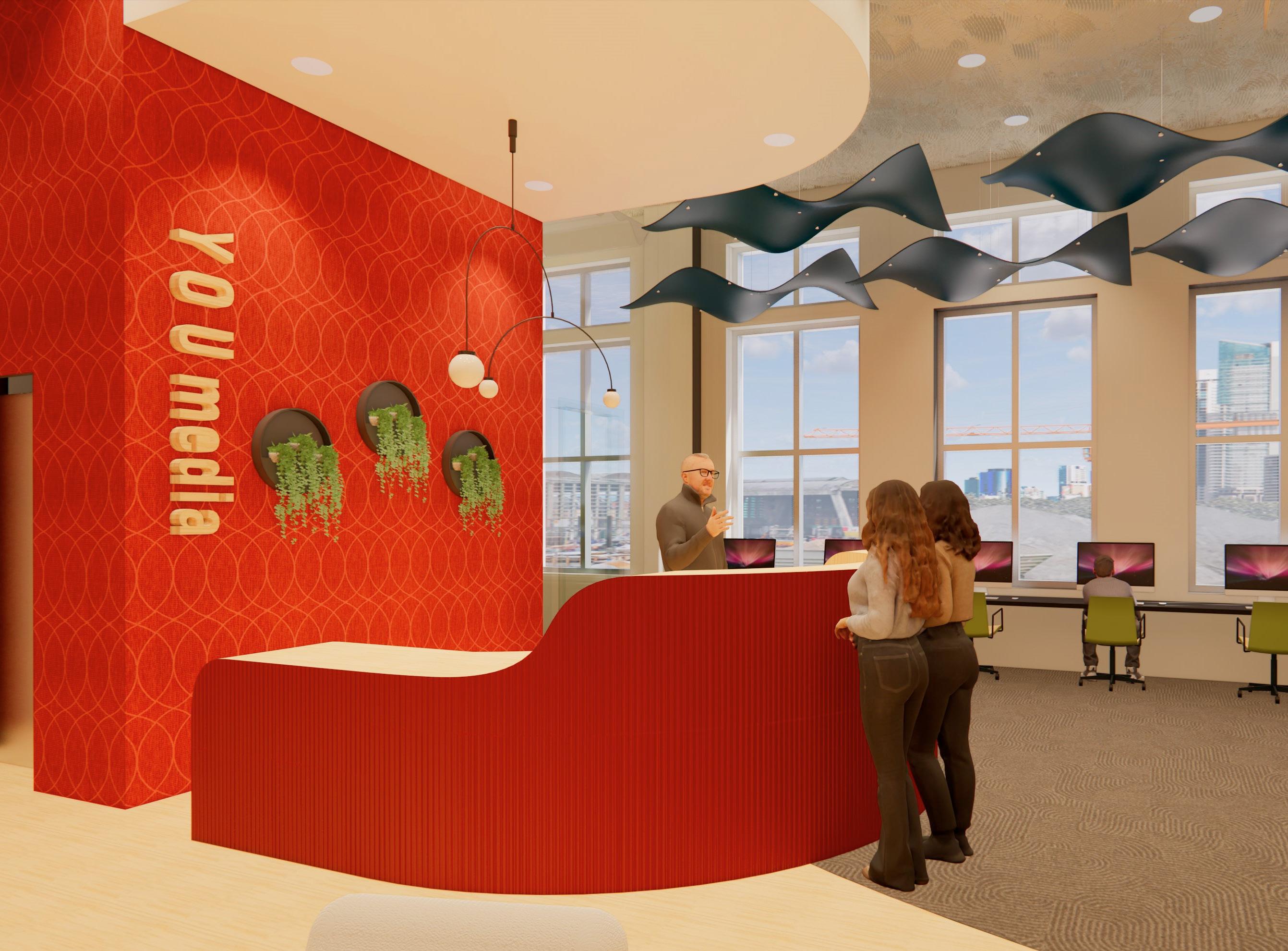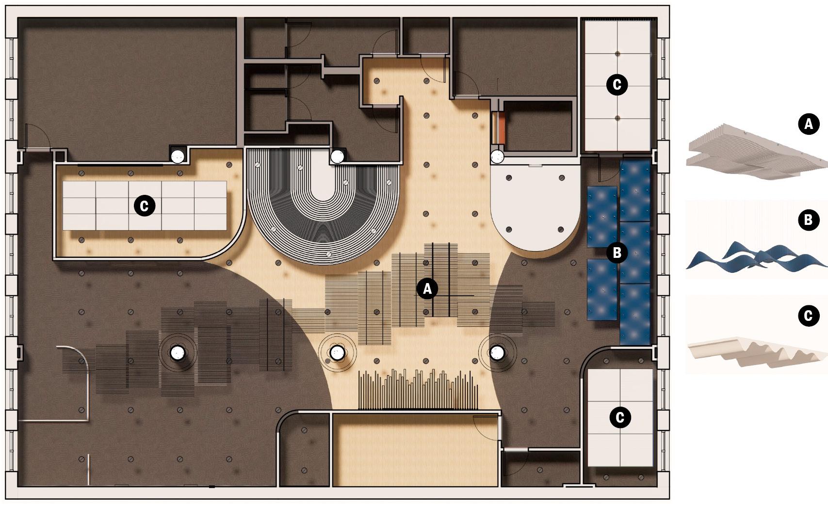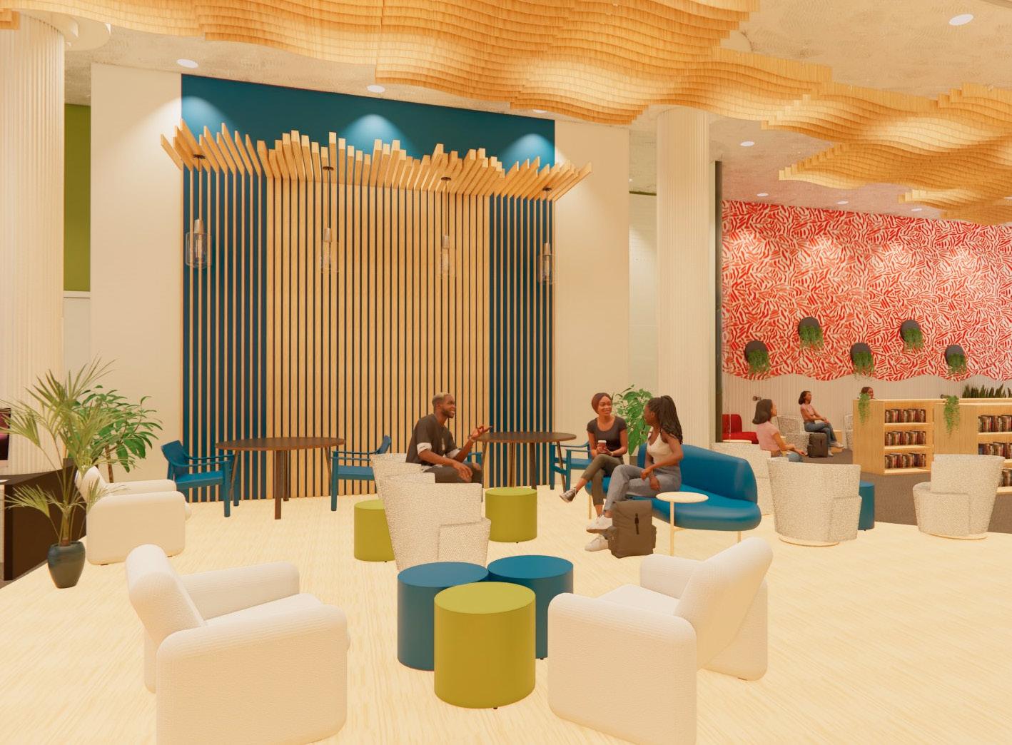 Emulating the energy and movement of sound waves, the space becomes vibrant and immersive. Fluid lines mirror the many unique interests and voices of the community.