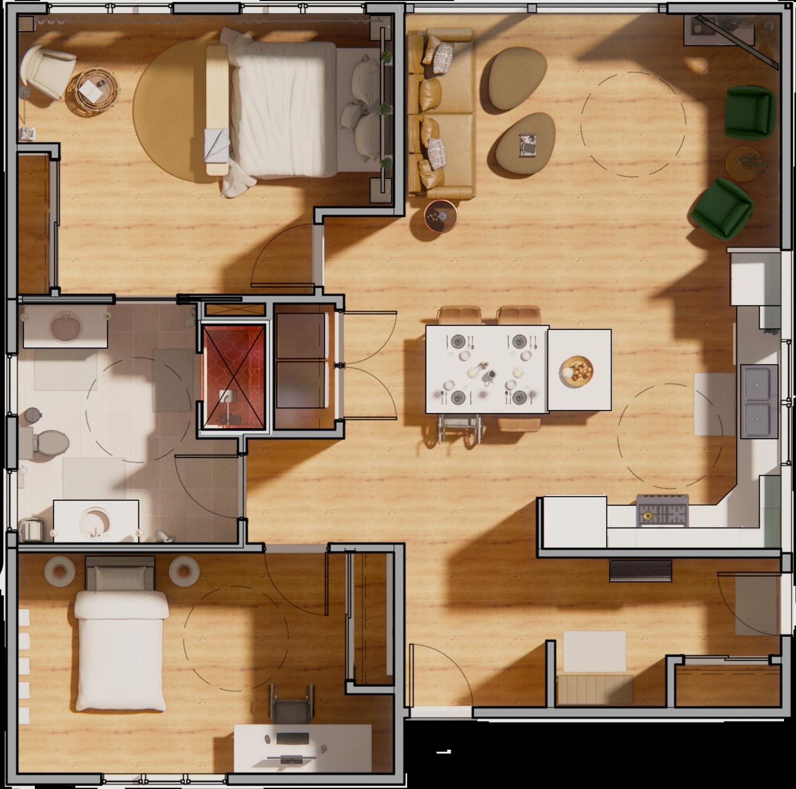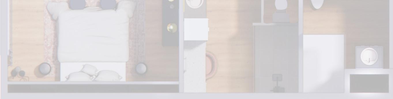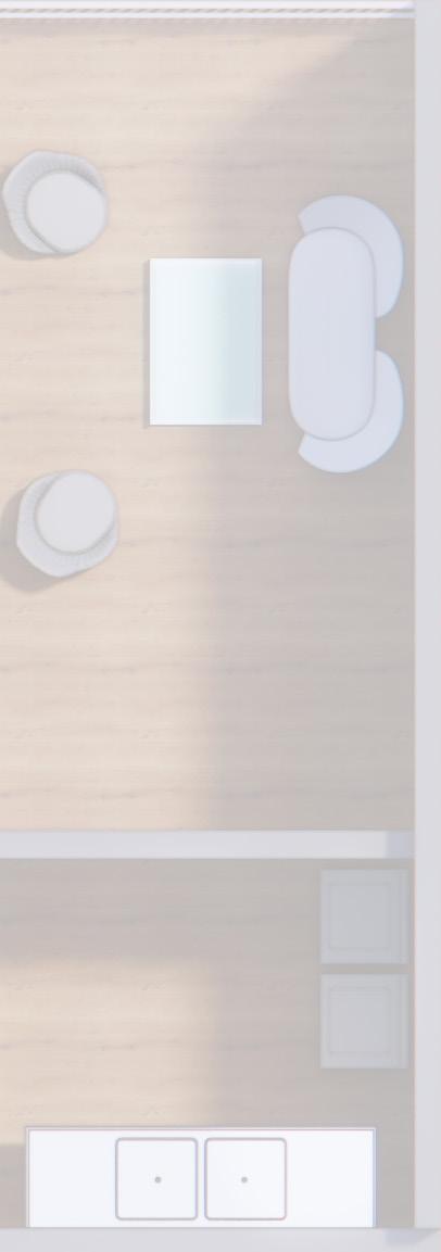 1 Pocket doors for easier maneuvering in a wheelchair 2 ADA compliant bathroom with shower seating 3 Accessible side by side-oriented washer and dryer 4 Accessible kitchen with 5’ turning radius for wheelchair use 5 Custom kitchen table and island combination 6 Access to the shared bathroom from the owner’s suite 7 Two separate vanities in the shared bathroom for individual use