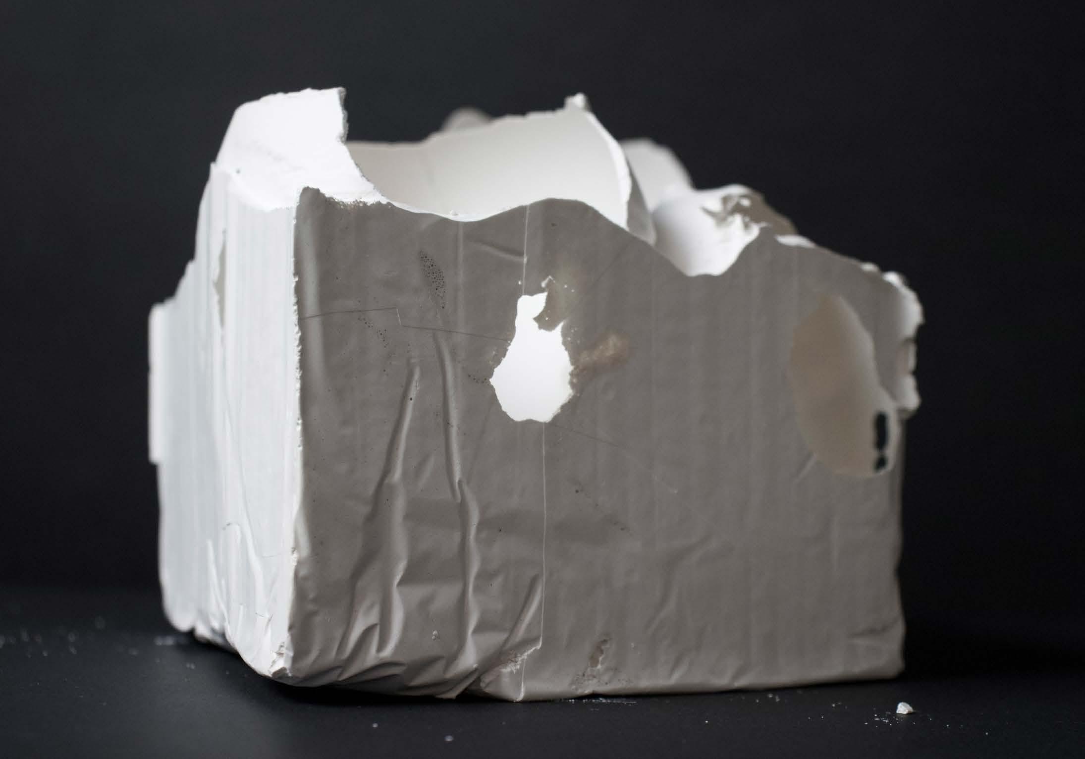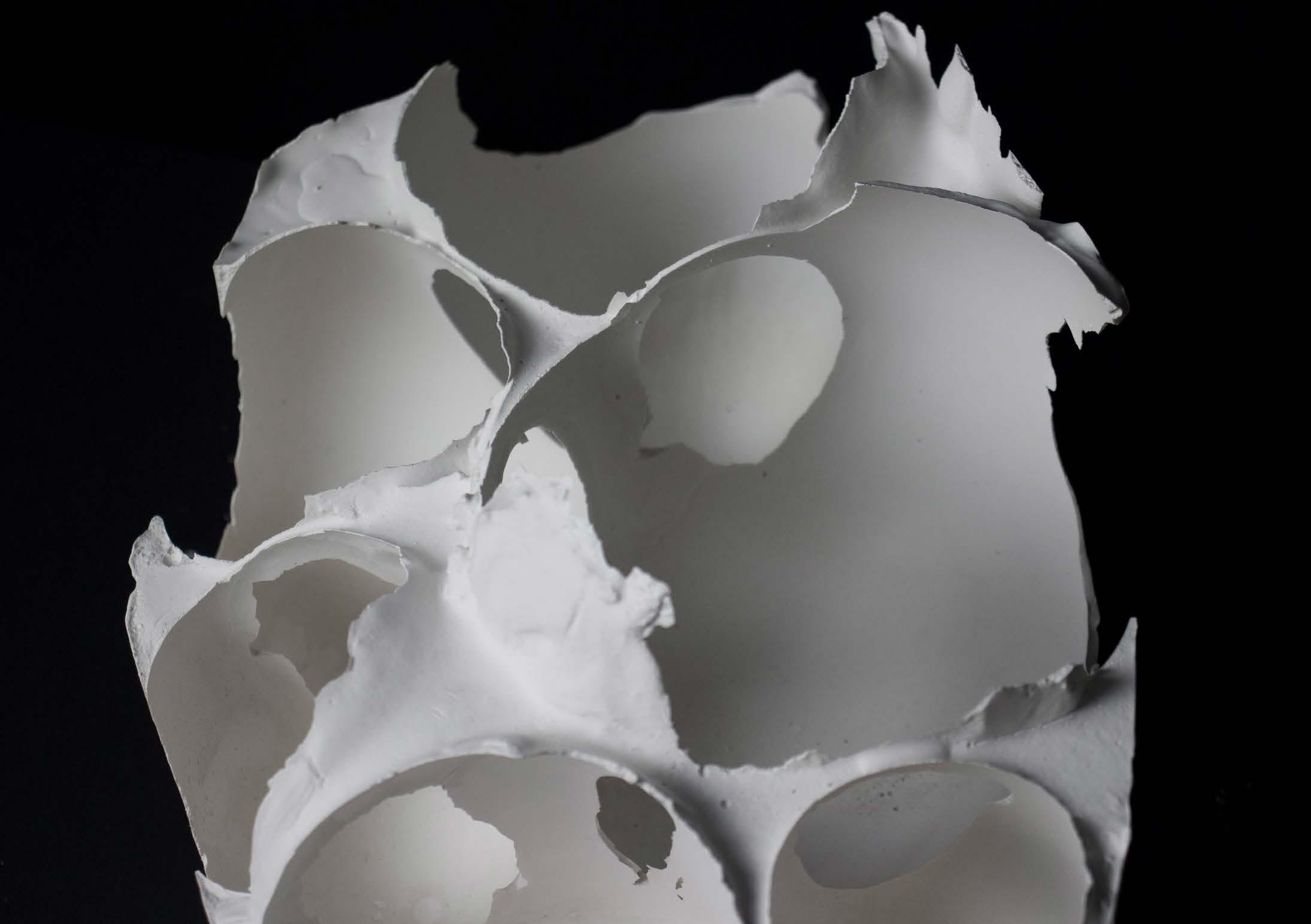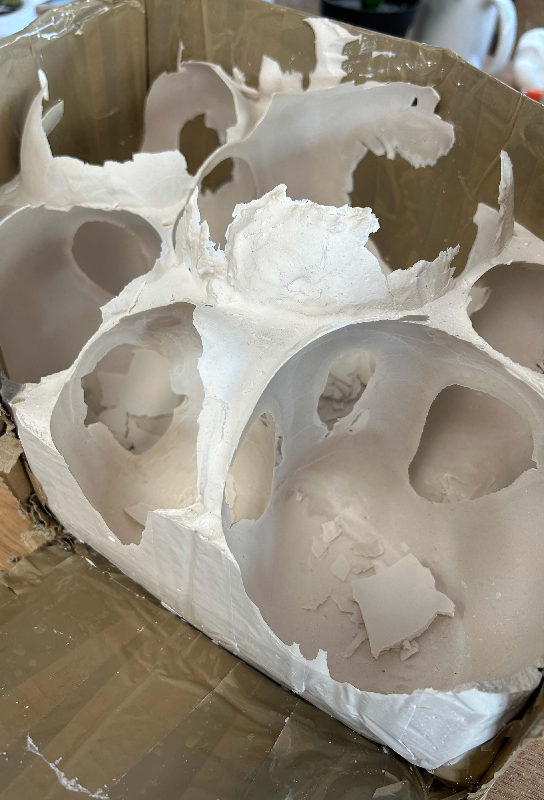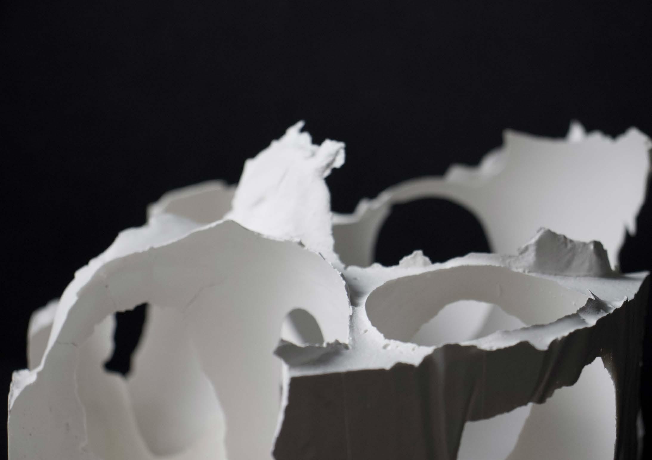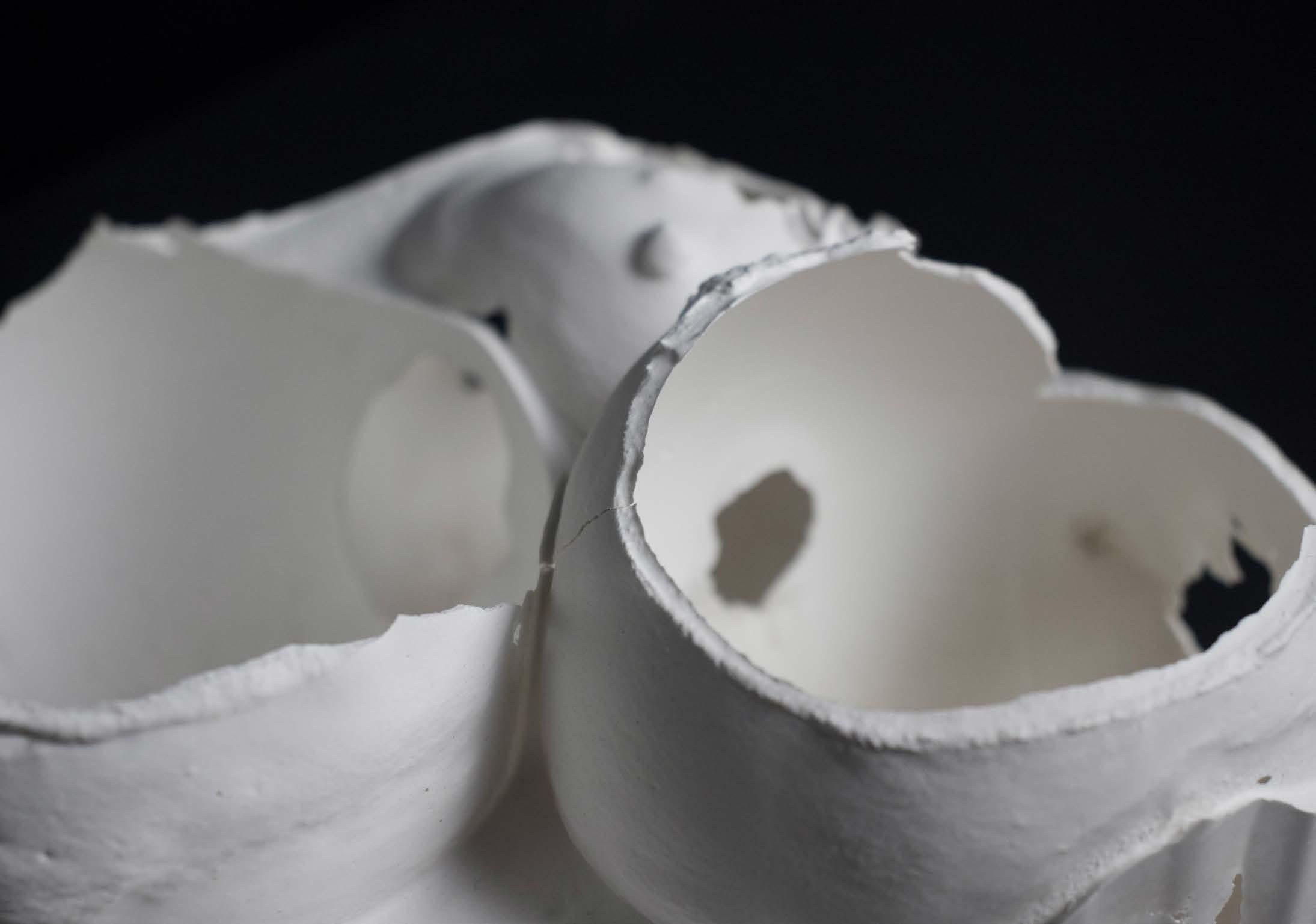 I also created a sculpture by constructing a box using cardboard and tape, ensuring any gaps were completely sealed, to prevent the plaster from seeping out. I then placed balloons inside of the box and held them down, whilst filling the box with plaster. Once set, I carefully pierced the balloons, allowing them to deflated and be easily removed from the box, leaving behind a sculpture with concave shapes. This also left me with some very delicate layers of plaster, which I took out of the handmade box, by cutting it up and peeling it away. The photographs captured show the intricate details of the plaster and how delicate the plaster really is.