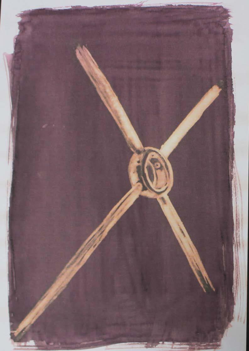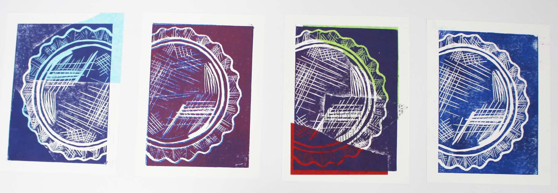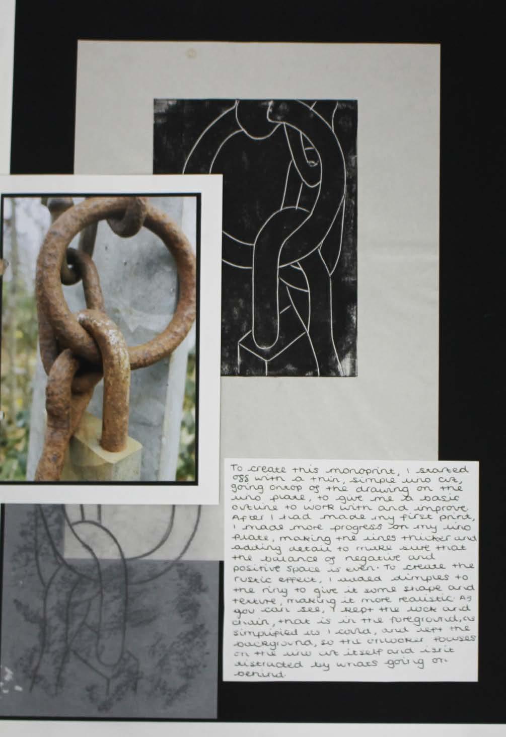 The inspiration for this project was the word ‘stacked’. The objects used and therefore the theme created throughout was mechanical. On the left are copies of lino prints I produced onto coloured card and tissue paper, of a chain and padlock. The overlapping and use of different paint to print was effective as it created a shadow effect, posing an interesting image.