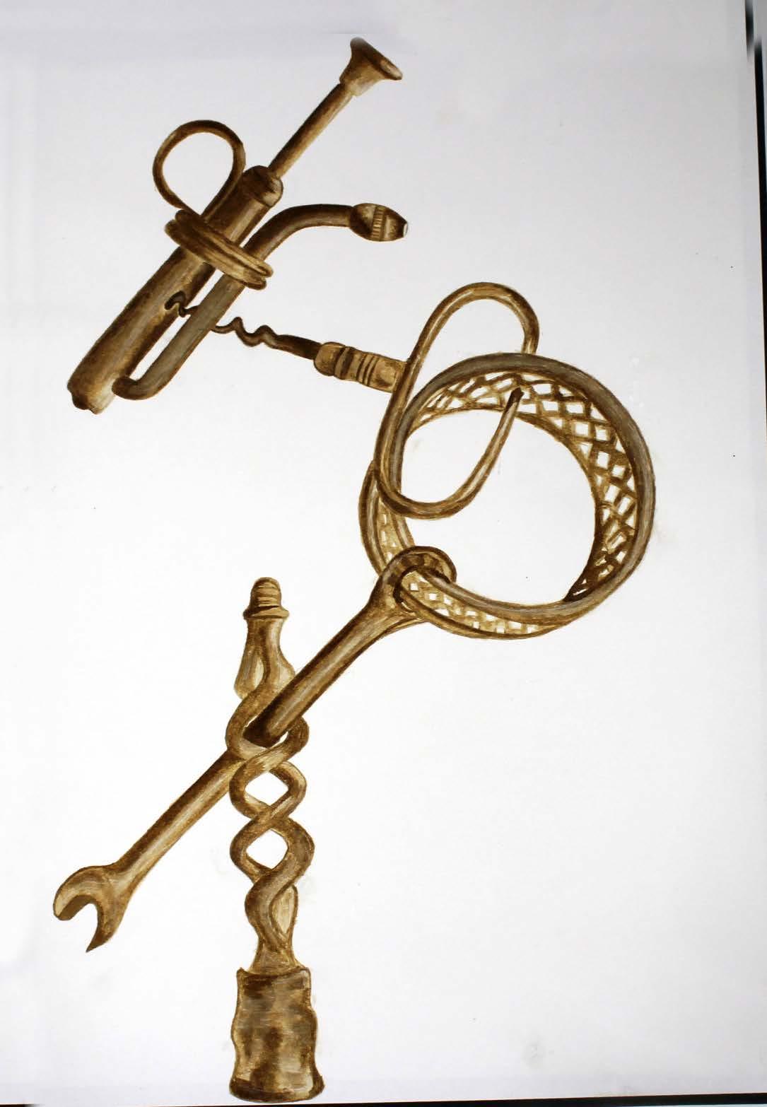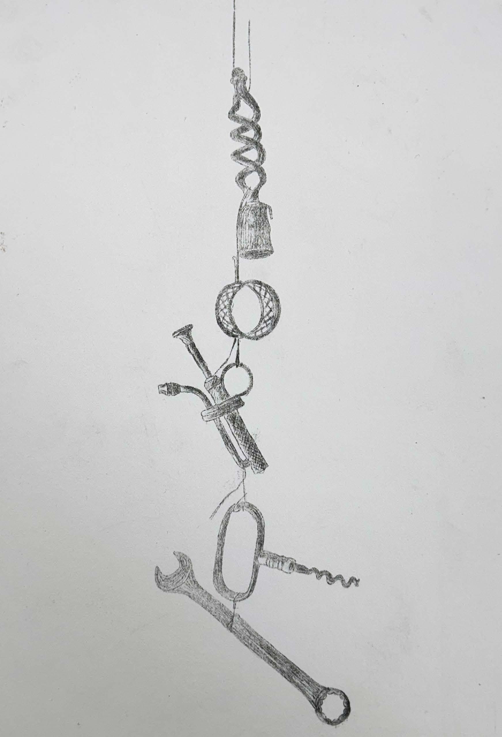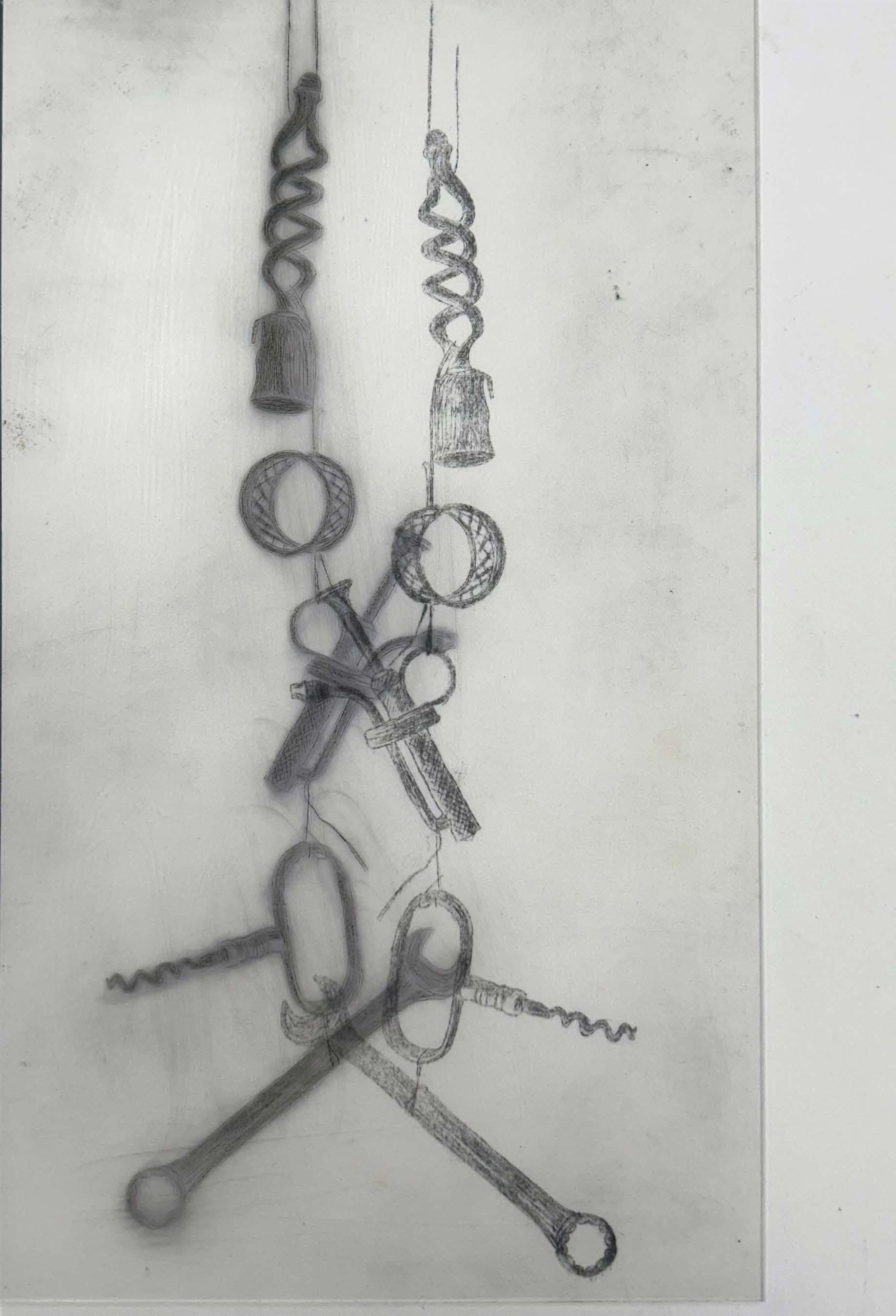 Staying on the mechanical path, I combined many metal and handheld items together, to create a 3D hanging piece, in which I turned into a drypoint etching. This was effective as I managed to capture the intricate details of each item, making them realistic and intriguing. The composition of this piece also took a lot of thought. For example, the spanner had to be hung in a certain way because if not, it would slide through the piece of string or affect the hanging piece overall, by knocking the others out of place.