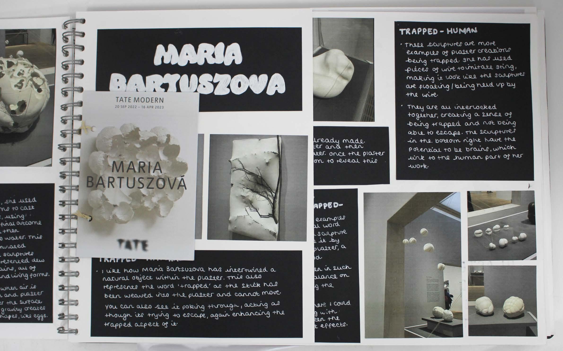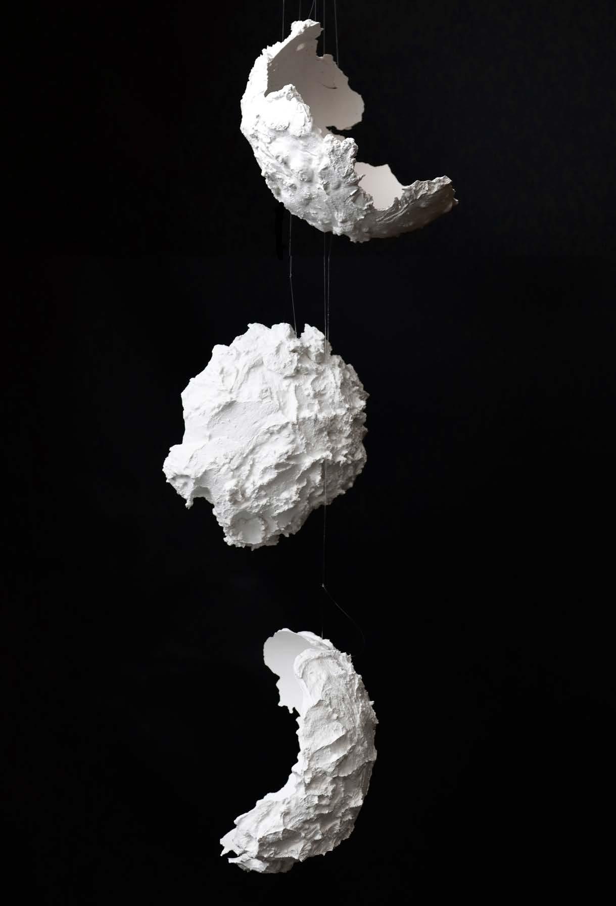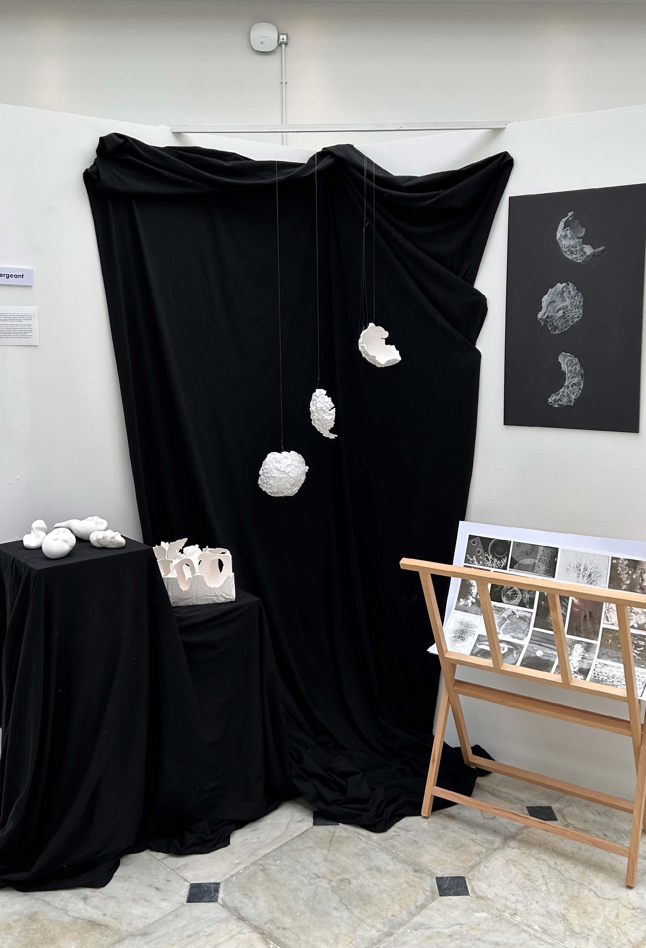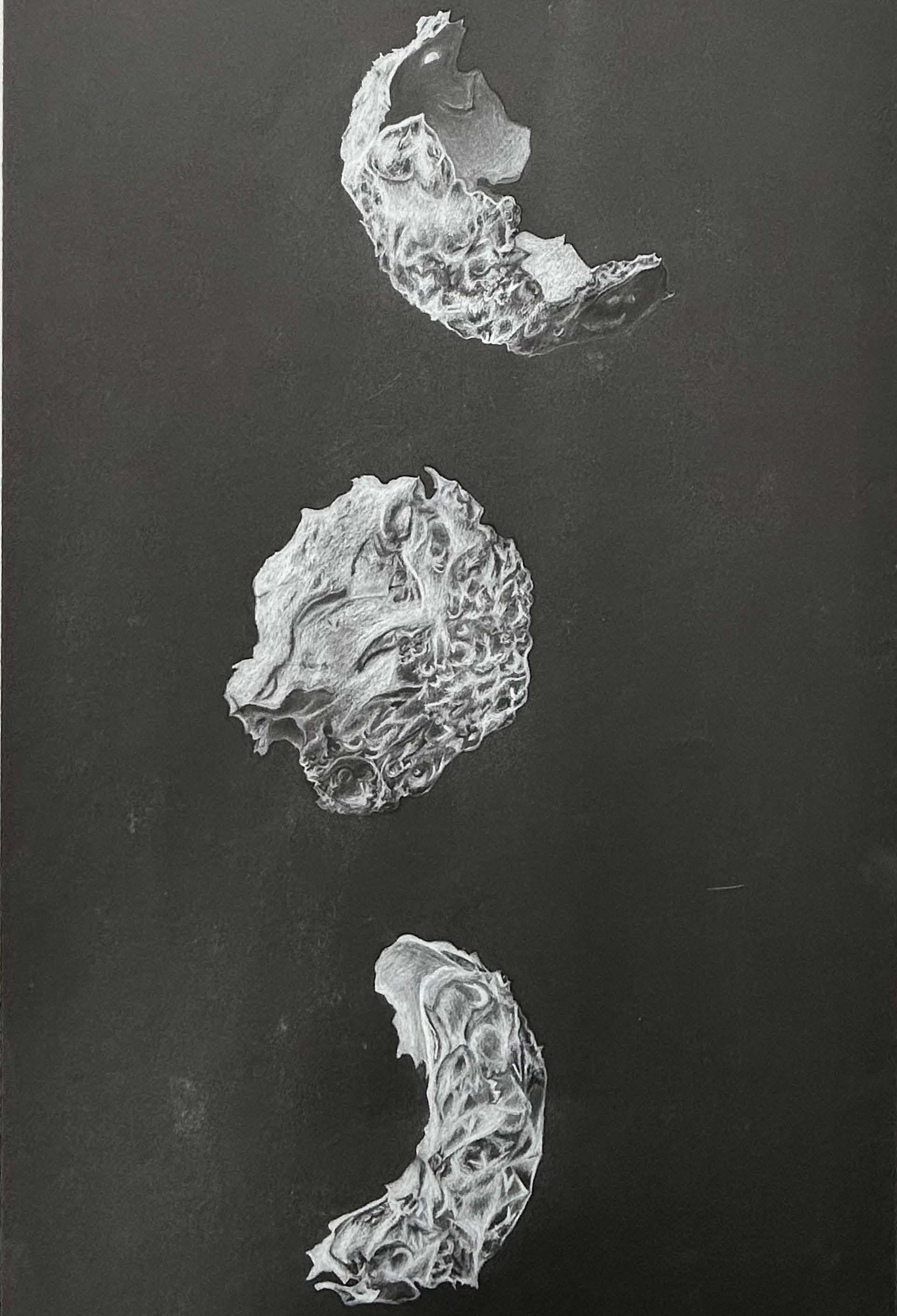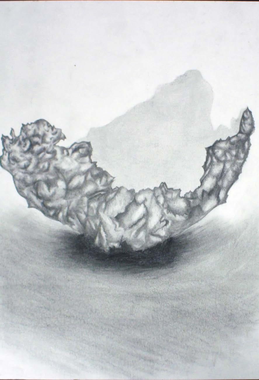 Pictured on the right is an A3 white pencil and charcoal drawing on black paper. One of the final pieces of the project, which was initially inspired by Maria Bartuszova, whose work I enjoyed at The Tate Modern. She created plaster sculptures, by filling balloons, which then left her with an interesting mould of the item she decided to recreate. Reversing her process, I decided to cover balloons in plaster, layering it on, after I let it go off and become more of a paste than a liquid. This allowed me to create ‘bowl’ shapes in which I then hung and photographed (overleaf).