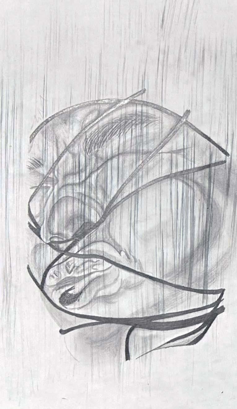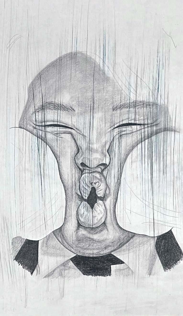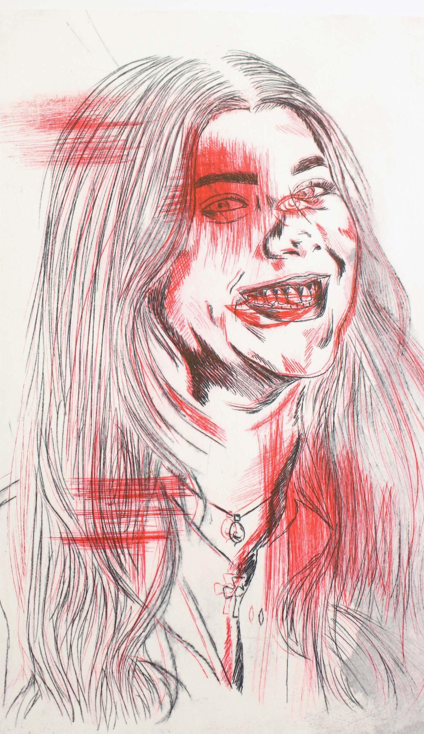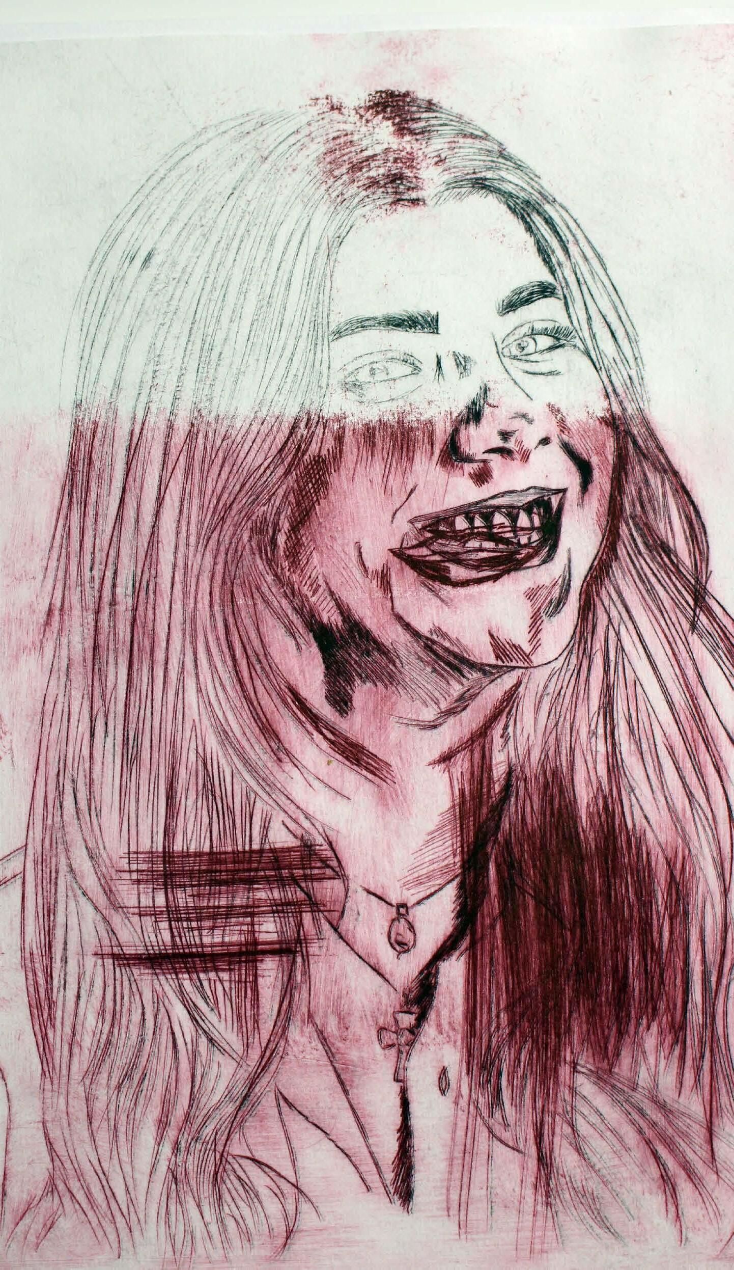 Moving on from linear and reductive drawings, the next artist through which inspiration was sought was Francis Bacon, who had a distinct style to his work. A common theme that occurs throughout his work is the distortion and graphic take on portraiture and human bodies. Delving deeper into his work and exploring the themes he used, the aspect that captured me was the use of triptych, as it almost displays a sense of movement throughout the three pieces. To incorporate Bacon’s work into my own and practice his style, I completed a photoshoot, in which I then used to experiment with different mediums. An example of this was the drypoint etching. This was chosen because the linear style created could convey a harsh, realistic portrait. Having experimented with different colours of ink, it was evident that brown and red mixed together portrayed the style of Francis Bacon well throughout the pieces, along with the scratches and cross-hatching over the piece, displaying a sense of morbidity and adding a grotesque feel. Again, to explore dysmorphia within the human face, the idea of collages was favourable, as this enabled me to distort the face by hand, mixing different photographs that were pulling different expressions, much like Francis Bacon’s work.