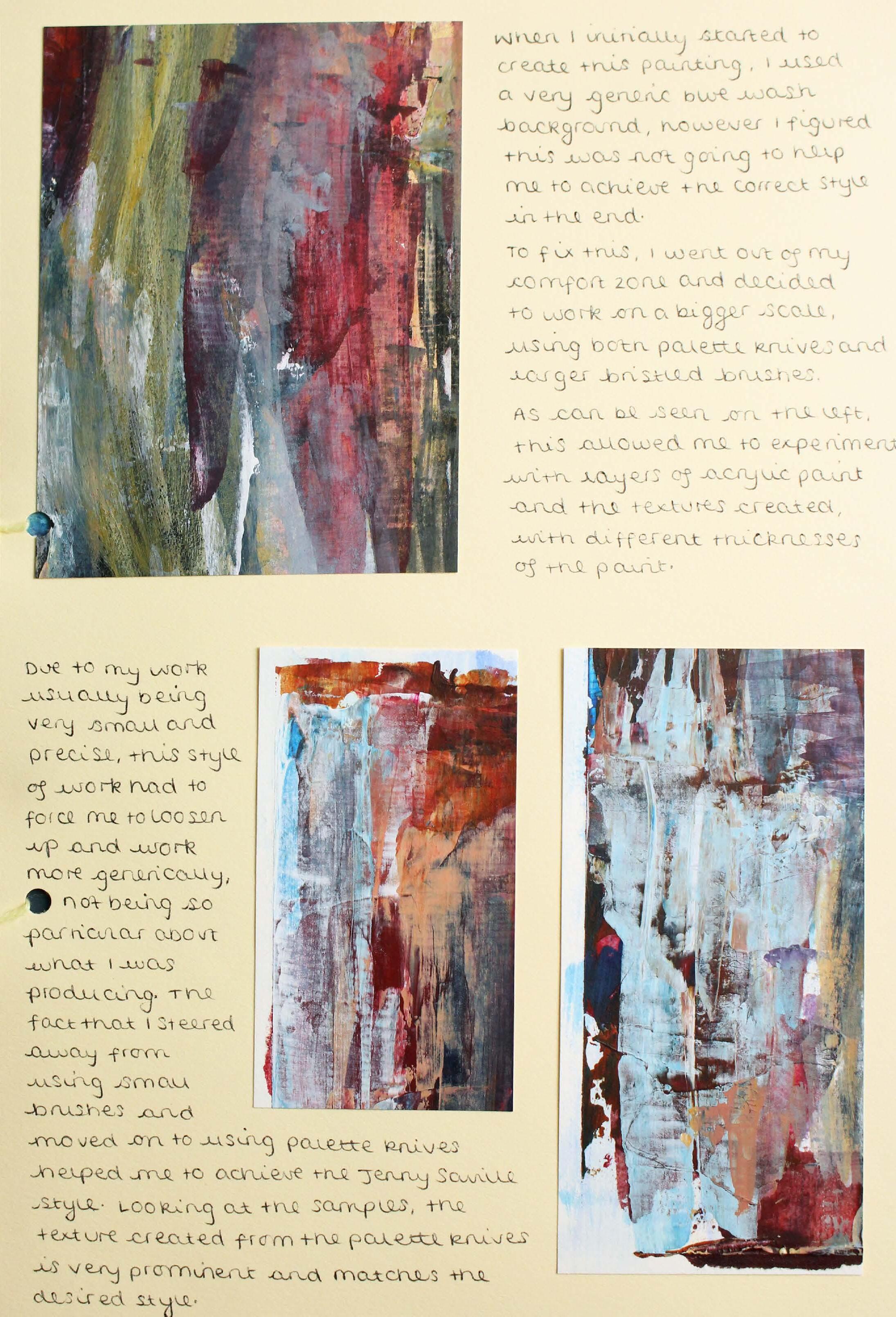 The third and final artist explored within this project was Jenny Saville. She was chosen because of her use of oil paint and what she created as a result. This also allowed me to extend my comfort zone and experiment with a different medium. More so because she does not use oil paint in the traditional way, instead she uses a palette knife to apply paint to the canvas, enhancing the texture created within the work. Not only this, but her use of colour captivated me as going back to the beginning of the project, I incorporated colour into the continuous line drawings as I felt as though this enhanced the sensory aspect. As we can see from her work, she uses both bright colours and human faces within her illustration, making her the perfect artist to study.