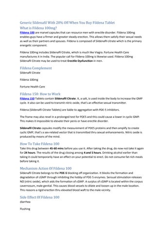 Fildena 150 online is an FDA-approved medication used to treat erectile dysfunction problems in men. This tablet is a Phosphodiesterase 5 (PDE5) inhibitor used for the treatment of impotence (ED).it is also called "Weekend Pills" because it helps achieve an erection at 24 to 36 hours if you are sexually stimulated.