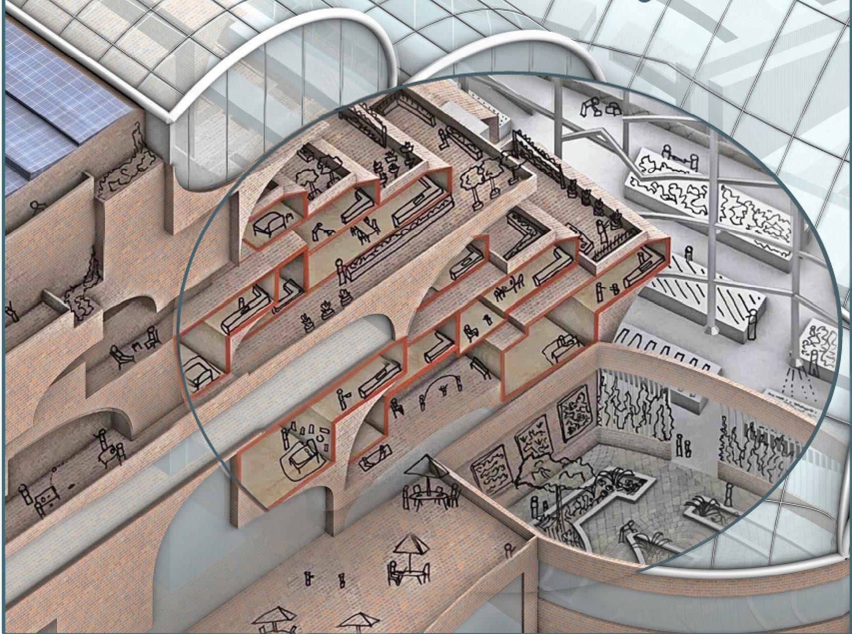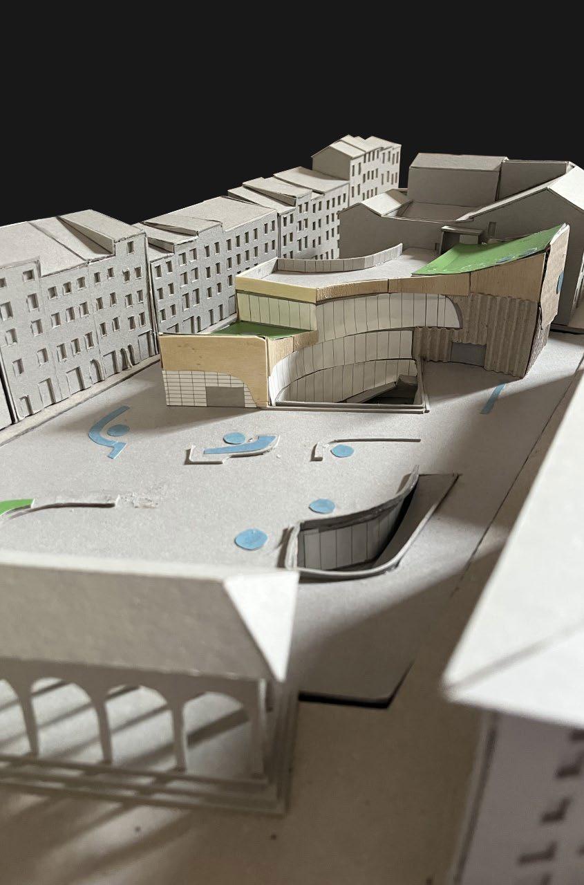 To further incorporate into the historic context, the conceptual design employs repurposed materials to craft facade fenestrations and material details. Furthermore, the physical model mirrors this commitment by being constructed from recycled materials found in and around Florence.