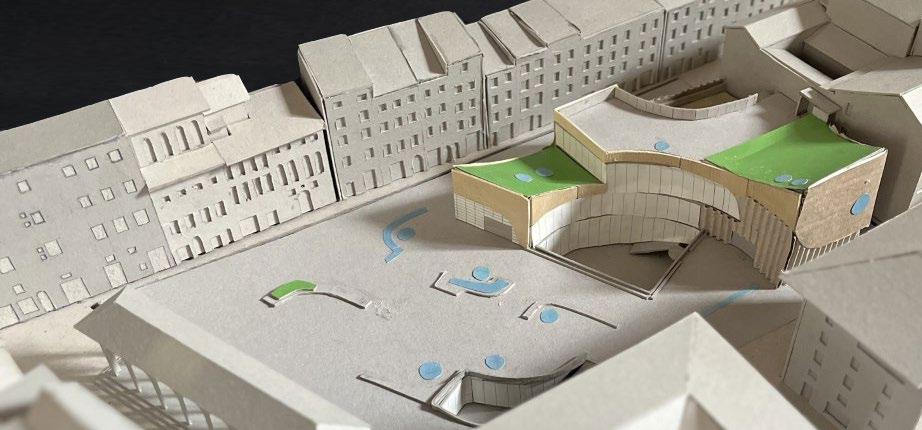 Designing a contemporary building in Florence’s historic Piazza dei Ciompi explores how to seamlessly blend new and old to meet evolving local needs. The hybrid kindergarten and public library design preserves crucial public plaza space while introducing new uses for the site. Inspired by the site’s historic, yet aged pine trees, the library roots itself into the ground, maintaining public access to the plaza above, while the kindergarten grows upwards with a series of terraced green roofs as mementos of the pine needles. The design studies the complex urban fabric surrounding the historic site to harmoniously cater to the shifting needs of the local community.