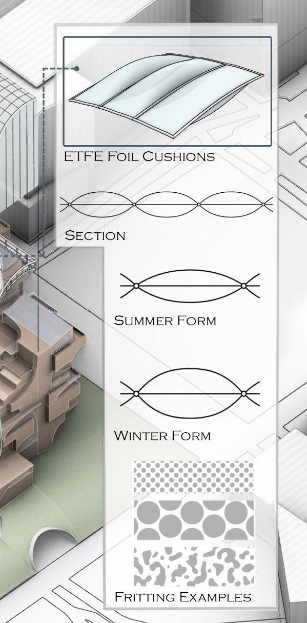 To counteract overheating in the South-facing interior, the foil cushions exhibit a dynamic capability to inflate or deflate. During summer, they deflate to minimize insulation and align the printed fritting on the interior ETFE sheet to reflect more sunlight. Conversely, in winter, the foil cushions inflate to enhance insulation and deliberately misalign the fritting, maximizing sunlight exposure. This thoughtful mechanism provides an economical solution, ensuring an ideal, efficient year-round climate for sustainable food production.