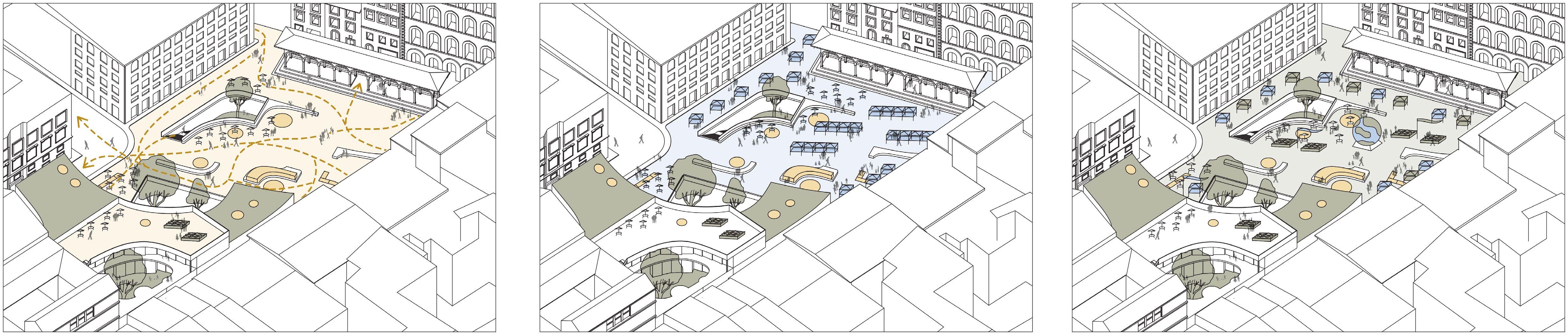 To maintain a majority of the public piazza space and provide refuge from the busy urban environment, the form delves underground. Two terraced forms grow upwards and are carved to correspond to the site’s pedestrian traffic. Sunken courtyards and skylights reintroduce green space and light to the below ground program. They also provide secondary pathways into and out of the library to connect to the activity above. Permanent seating and planters guide pedestrians through the site and engage various community uses for the public piazza.