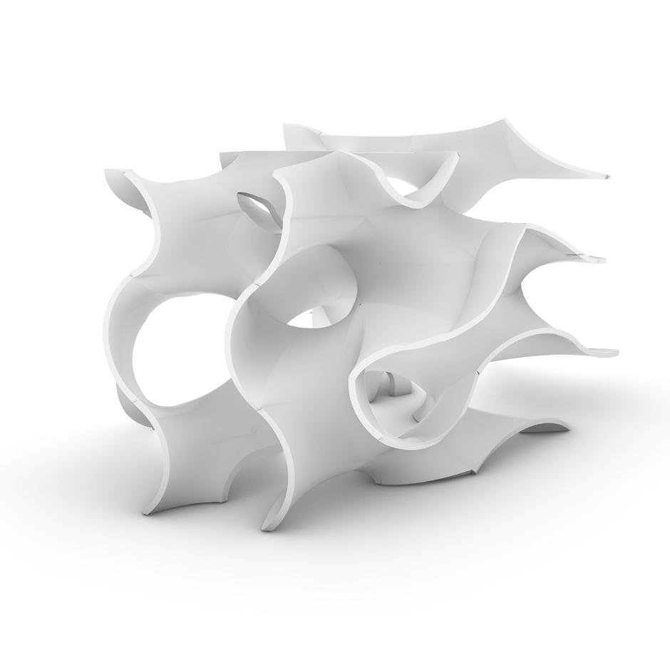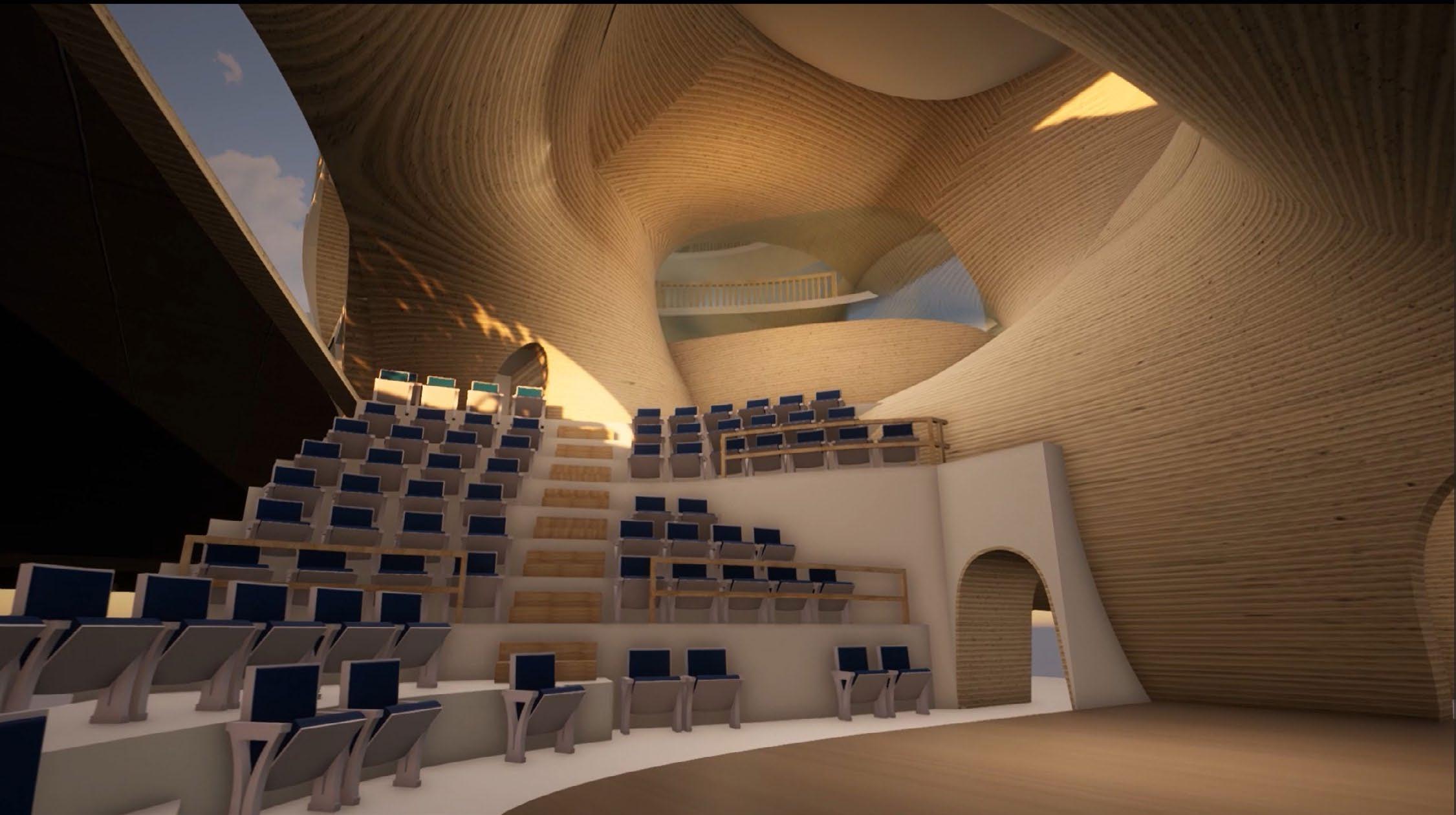 By employing the single-surface 3D print infill geometry known as the gyroid, the entire structure has the potential to be inherently self-supporting, reducing the need for excessive material. The infinitely interconnected gyroid geometry not only presents a visually captivating form, but also facilitates the creation of fascinating, intertwined interior spaces. As the structural form seamlessly weaves among itself, openings and overlooks emerge, providing an innovative means to link and integrate various media-related interior programs. As the gyroid form has no inherent beginning or end, the program linkage occurs horizontally and vertically over multiple levels. To create program spaces without impeding on the geometry of the gyroid, floor plates extend from peaks and valleys, typically ending in cantilevers to avoid typical stacked floors.