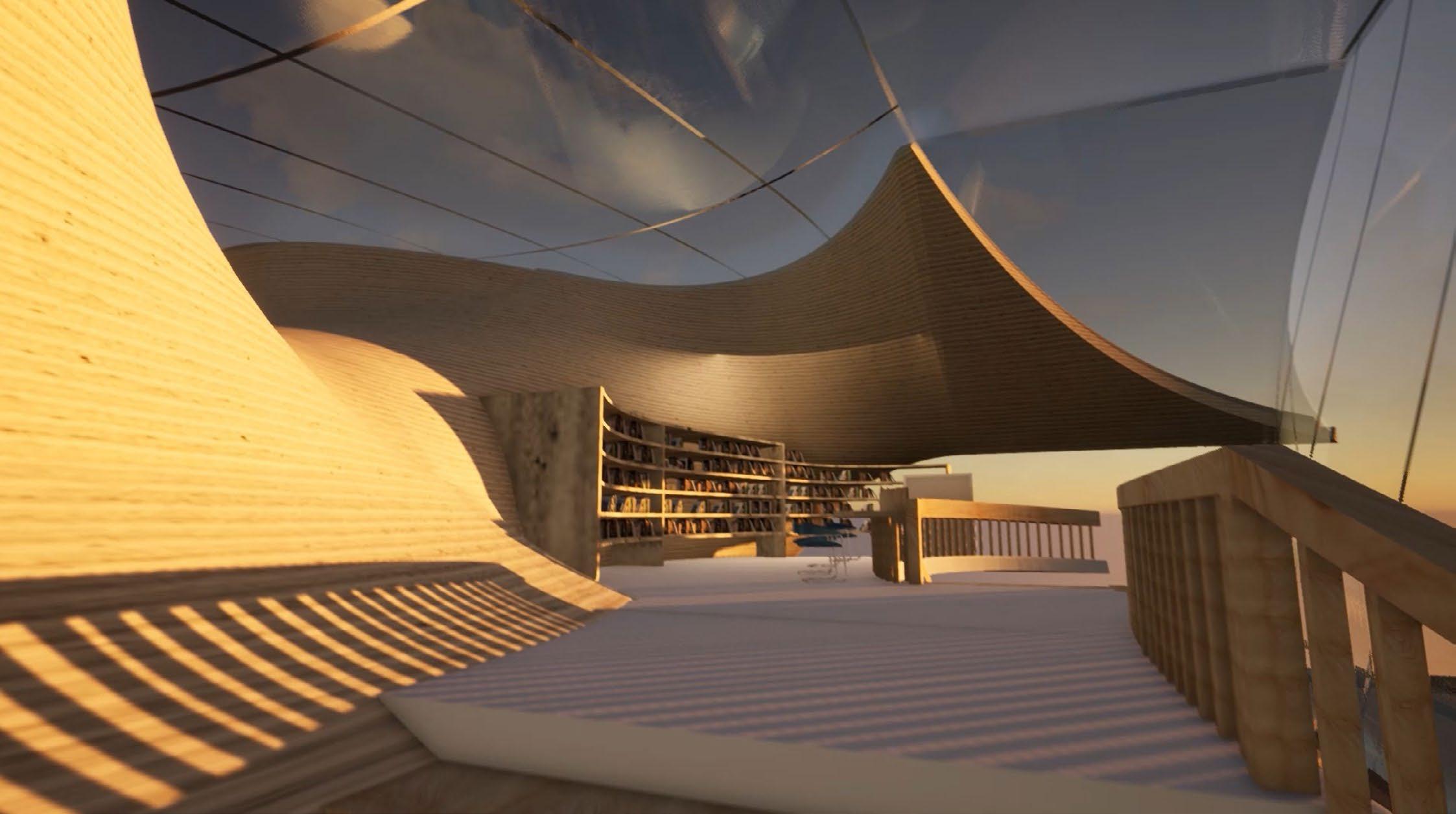 As the understanding of media evolves to encompass innovative technologies, emerging scientific disciplines, and bold artistic endeavors, the need for an interdisciplinary center becomes imperative. The ADA Media House design merges the innovative construction methodology of 3D Printing with sustainability to establish a public space dedicated to the study of art and media technologies. Employing a manipulated gyroid single surface form, the design seamlessly interconnects programs through a network of overlooks and openings, thus creating a dynamic and infinite spatial experience.