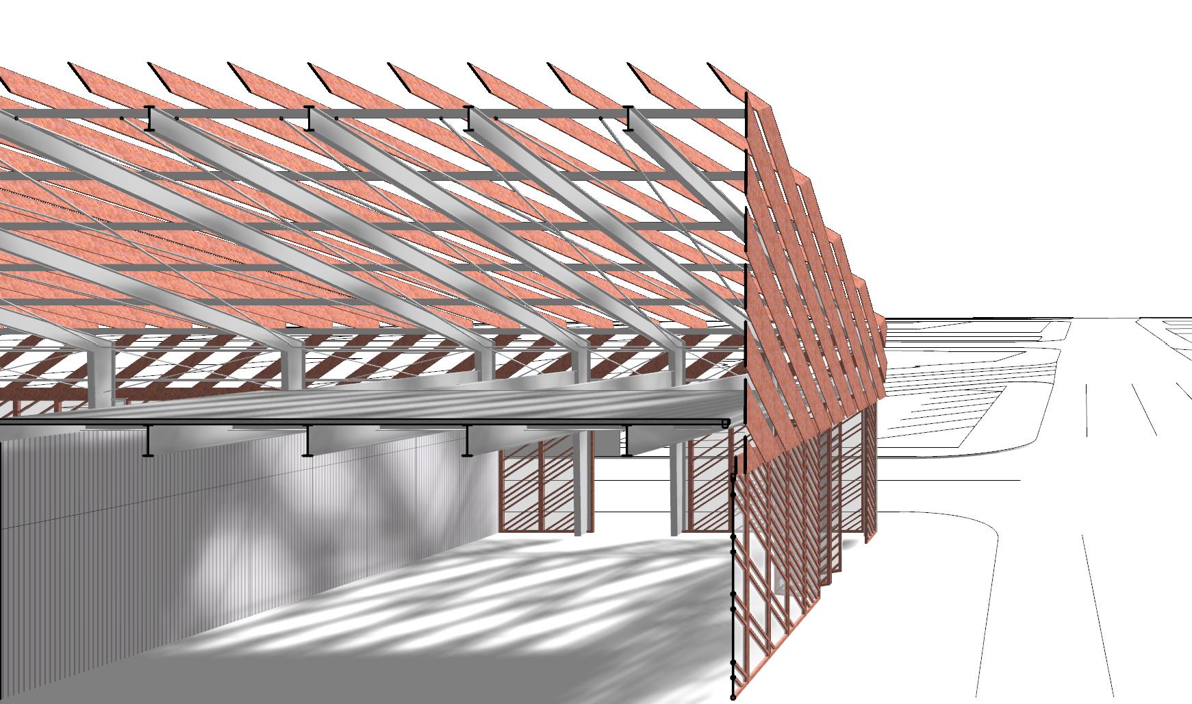 The division between flexible and rigid program primarily occurs through the thermal systems. Specifically, to create a more permeable connection between the shorter volume and the surrounding city, the space is thermally untreated to allow for more open community-based uses and full programmatic flexibility. The taller building is thermally conditioned as it hosts the more permanent and defined sporting and service programs. Although under a cohesive Corten Steel louver envelope both buildings are thermally
