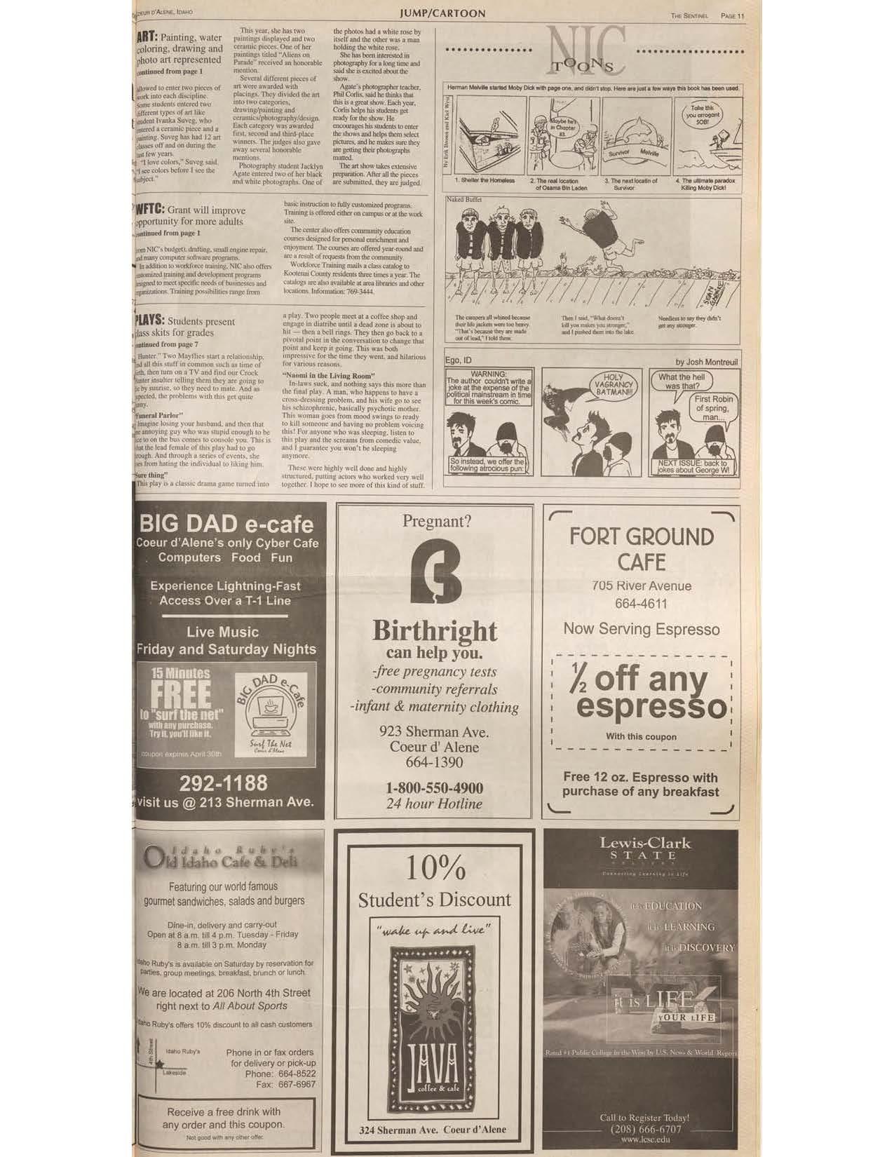 whtt v.a1. ilcrpin1, ll41.:n m lhi" rl•Y ao.J the K'~ from comedic v11uc. .anJ I gu.n-nlcc you •11t1'1 he i.lccp1111 anymore Tbc:,c \tot~ b1ghly ,,.,di done .md hl&hl~ ,nu1,,u,11~d. PJlhnr 111t1or, who ,,.,.urk,ed \"Cf> w-dl u,~. I hope 10 llC'C. mC1tt o r thb kind ol a.u.1fl. fhocarap,t11•II•-'~ •11r..----. v,, "11-'1bccamll_,.lff OU10lluJ,;• 1,o1111,Pregnant? B Birthright can help you. -free pregnancy tests Featuring our world famo us gourmet sandwiches, salads and burgers Dine-in delivery and car~t Open al 8 a m. hll 4 p.m Tuesday· Friday 8am. hl13pm Monday Ruby's II ava,lsble on Sa1urday by """,vat,on for Jllrbeg_ g1oop meehngs. bf..,ldasl. brunch or luncn We are located at 206 North 4th Street right next lo All About Sports Rllby'o o""" 10% d"'counl lo all caslt C01i!Omenl L•.flld• Phone In or fax orders for delivery or pick.up Phone 664--8522 Fax: 667-6967 Receive a free drink with any order and this coupon. Moegc.iod •"? ott., -community referrals -infant & maternity clothing 923 Shennan Ave. Coeur d'Alene 664-1390 1-800-550-4900 24 hour Hotline 10% Student' s Discount 324 Sherm an Ave. Coeur d'A lene tliailwid.~~·· ,,11~~,...MJU1.811'.I) .,.,(' lrilee:btaao-,-,.Mt.'l .....,FORT GROUND CAFE 705 River Avenue 664-4611 Now Serving Espresso Xoff any : espresso: With this coupon Free 12 oz. Espresso with purchase of any breakfast I '- __J