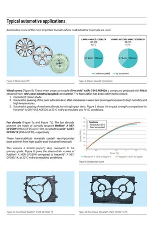 Wheel covers (Figure 5). These wheel covers are made of Heramid® A GRI 7645 AGF020, a compound produced with PA6.6 obtained from 100% post-industrial recycled raw material. The formulation has been optimized to ensure: 1. Consistent colour shade. 2. Successful passing of the paint adhesion test, after immersion in water and prolonged exposure to high humidity and high temperatures. 3. Successful passing of mechanical tests, including impact tests. Figure 6 shows the impact strengths comparison for Heramid® A GRI 7645 AGF020 at 23°C in dry-as-moulded and RH50 conditions. 160