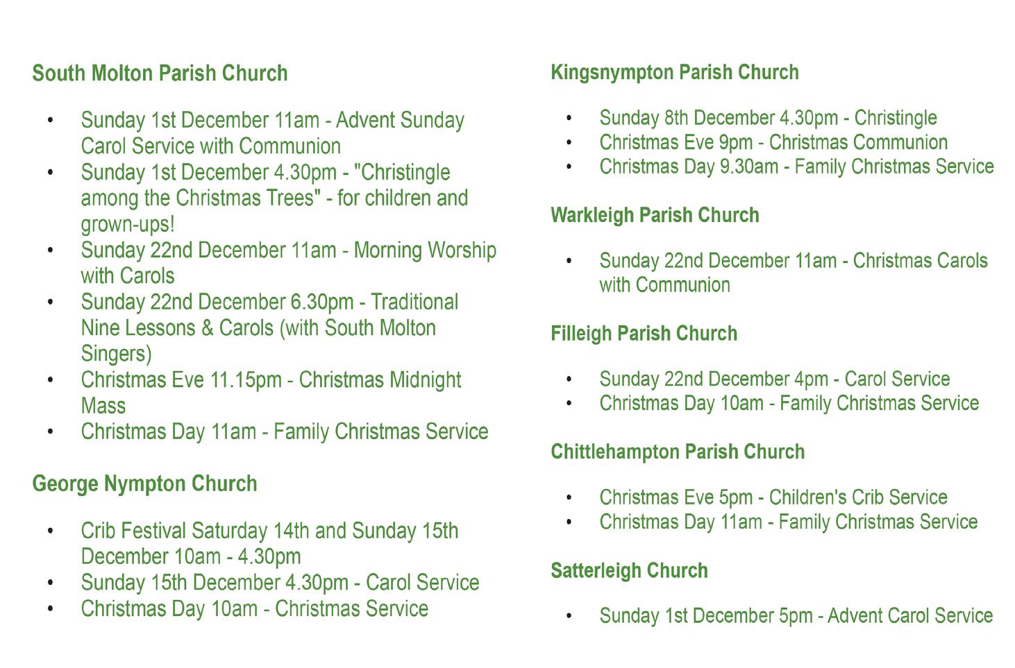 22nd - 6pm Carol Service at the Church of St Mary, Bishops Nympton (advert page 16)