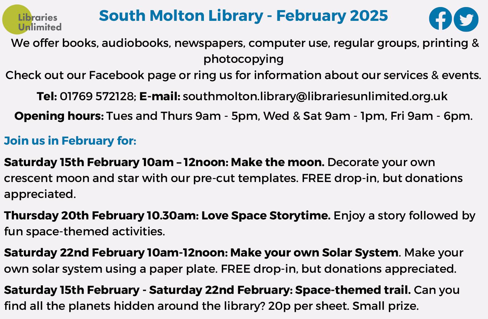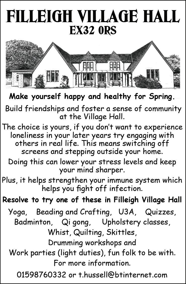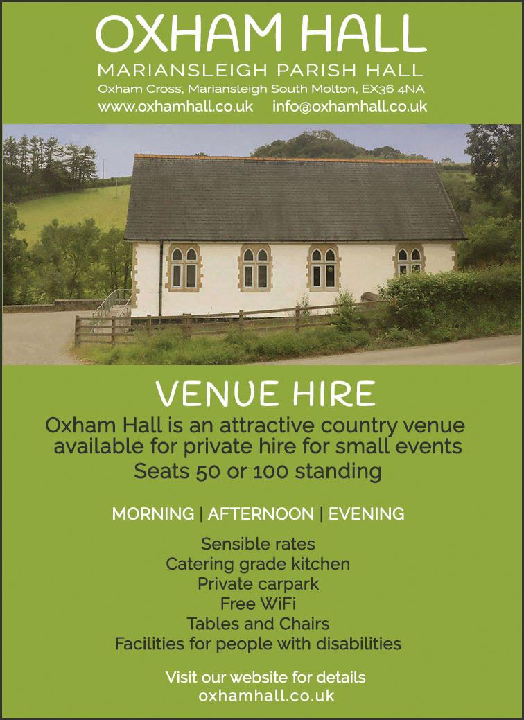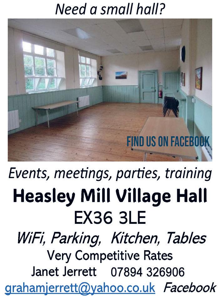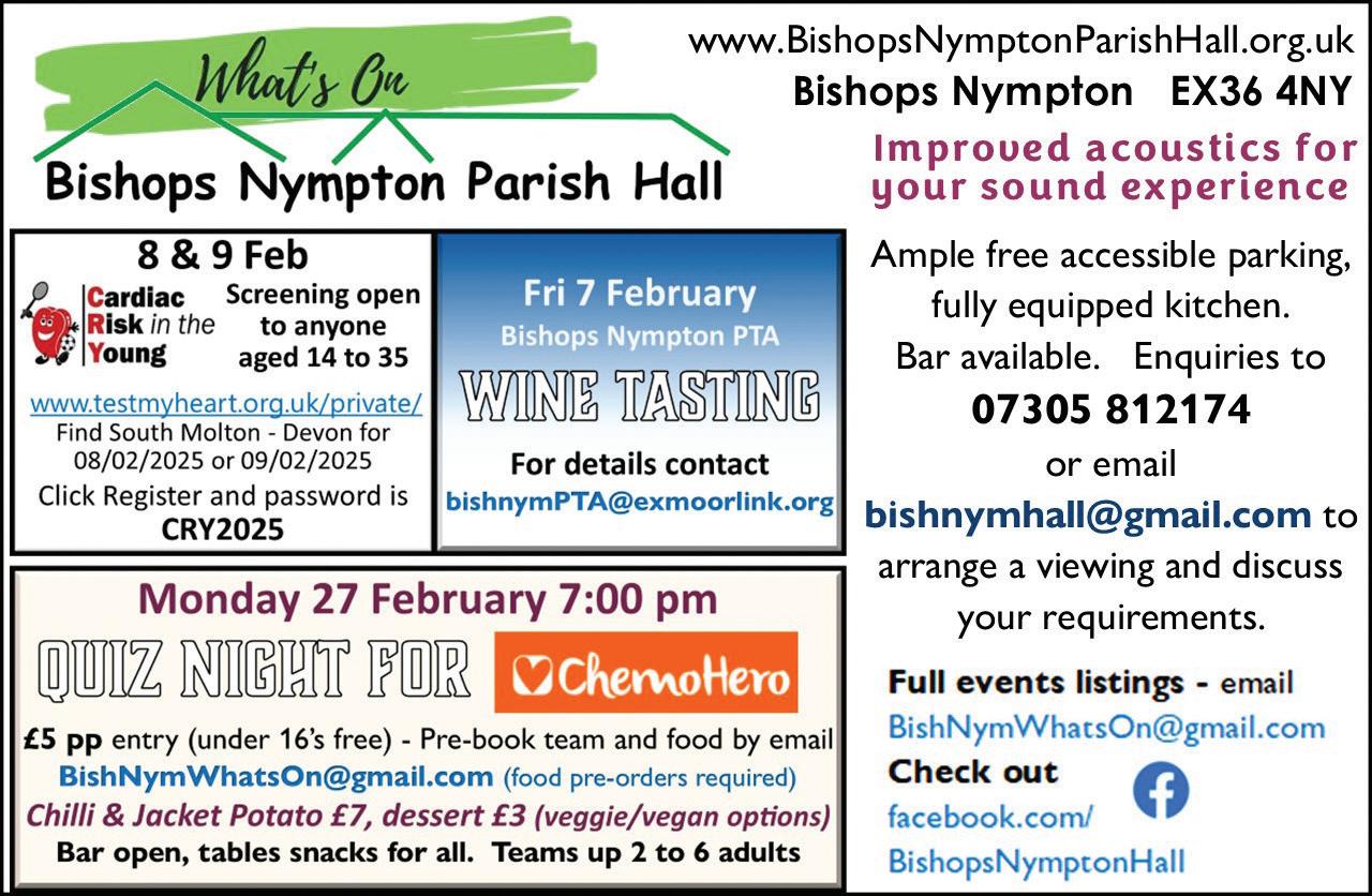 Bishops Nympton Parish Hall - events page 12; South Molton Library - events page 12 Filleigh, Oxham and Heasley Mill Village Halls - adverts page 60
