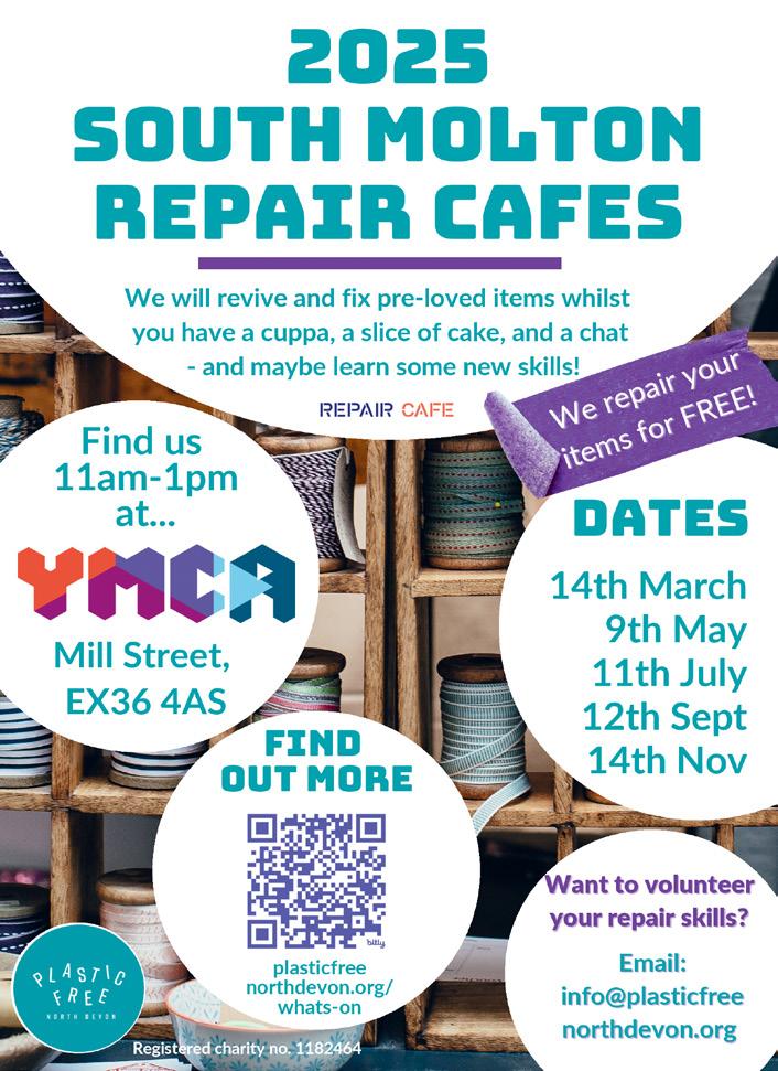 Police drop-in: 10am-12pm 10th Chulmleigh Town Hall; 9am-1pm 1st South Molton Pannier Market Scrapstore YMCA South Molton Drop-in Craft Sessions; 10.30am -1.30pm 14th & 28th; £2 donation requested. Scrapstore open on Tuesdays 9.30am - 12.30pm.
