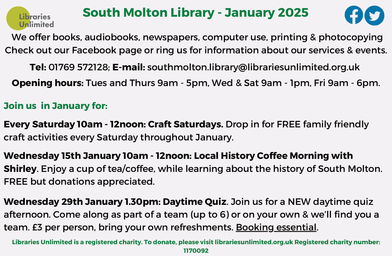 14th - 10am South Molton u3a presents ‘Animals at War’ at Filleigh Village Hall (members only; £12 p.a.) 14th - 10am CommuniTEA drop-in sessions with One South Molton at the town library (ends 11.30am)
