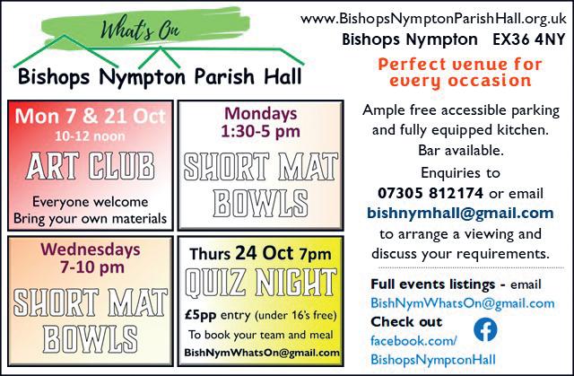 4th - 8pm First Friday Jazz presents the North Coast Joymakers at Swimbridge Jubilee Hall (advert p14) 5th - 7.30pm Autumn Disco - play area fundraiser at Umberleigh Village Hall: 07737 346500/07540 223498