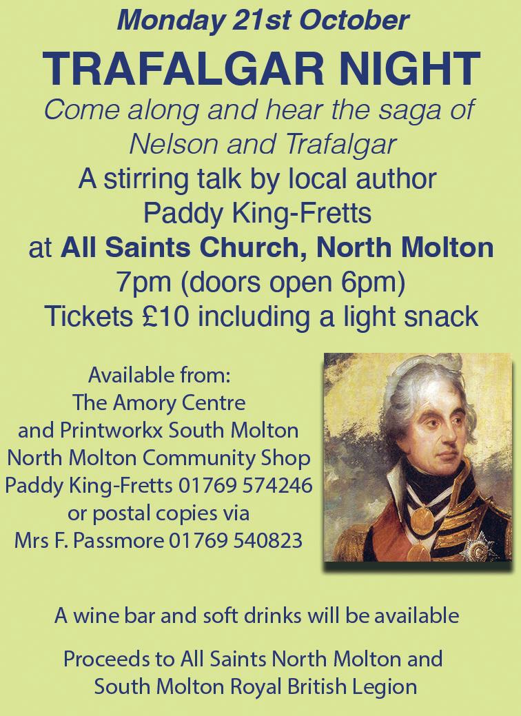21st - 7pm Trafalgar Night - charity talk about Nelson at All Saints Church, North Molton (advert page 16) 21st - 7pm South Molton Sisters W.I. monthly meeting at the YMCA - fun, tea and nibbles (ends 9pm)
