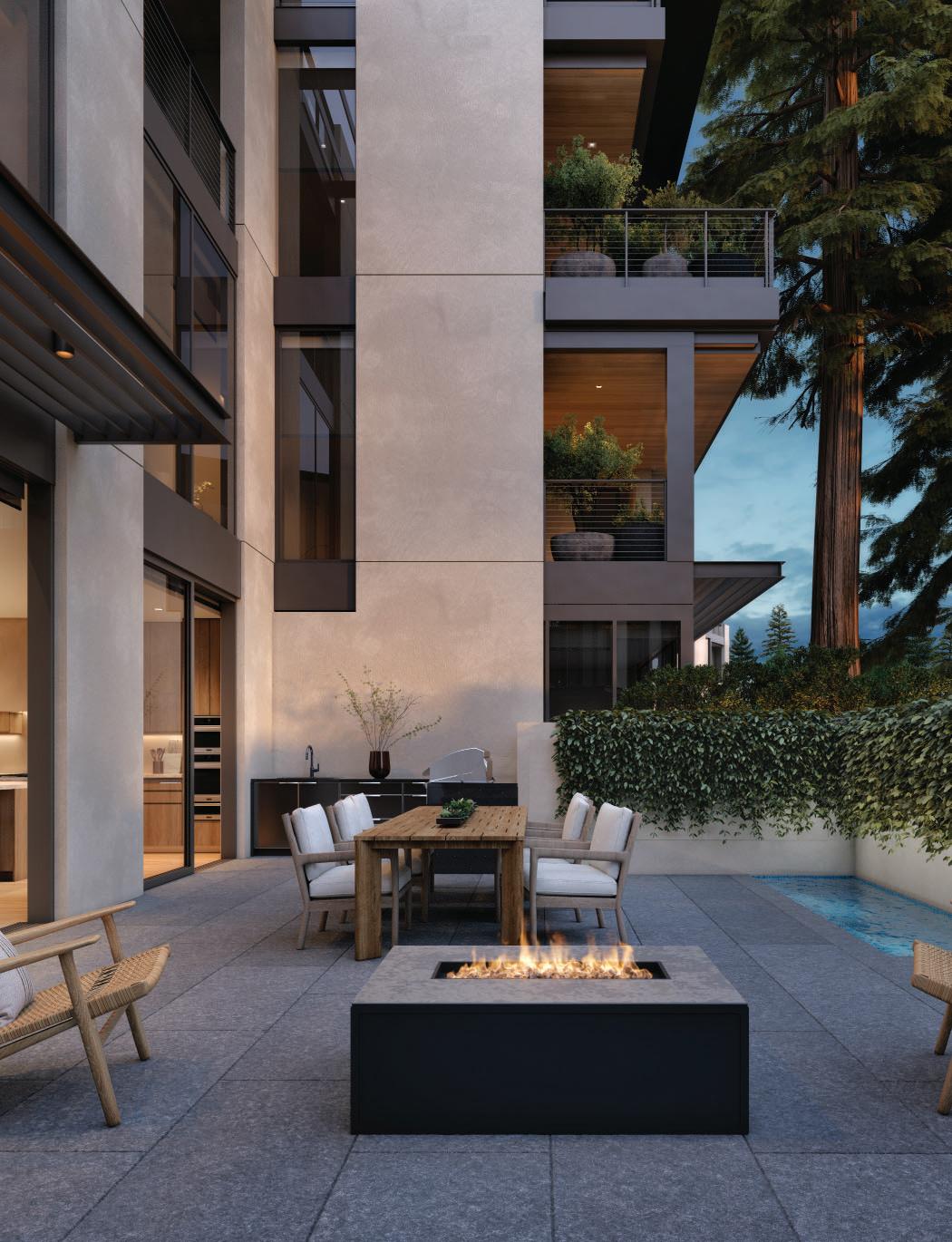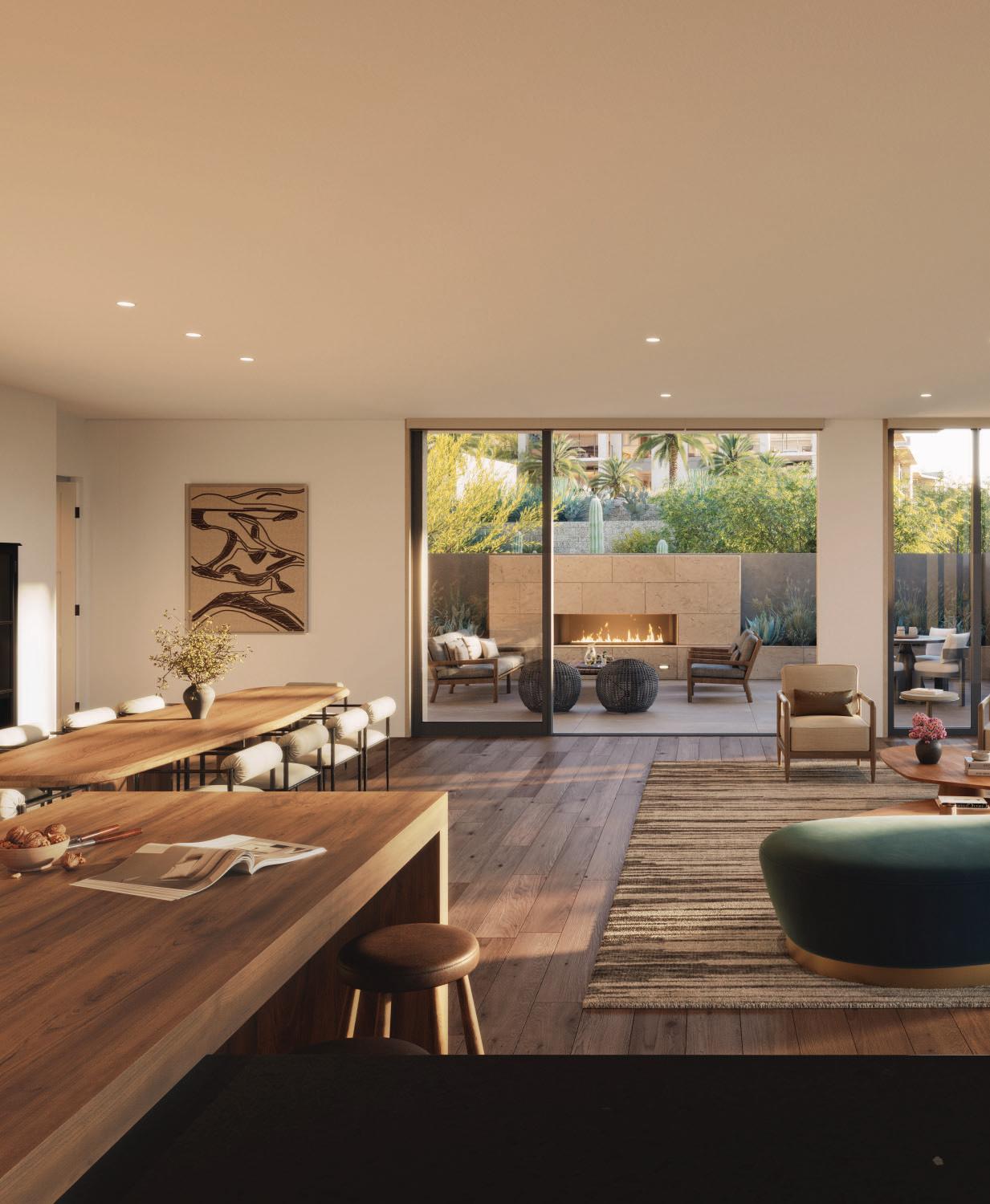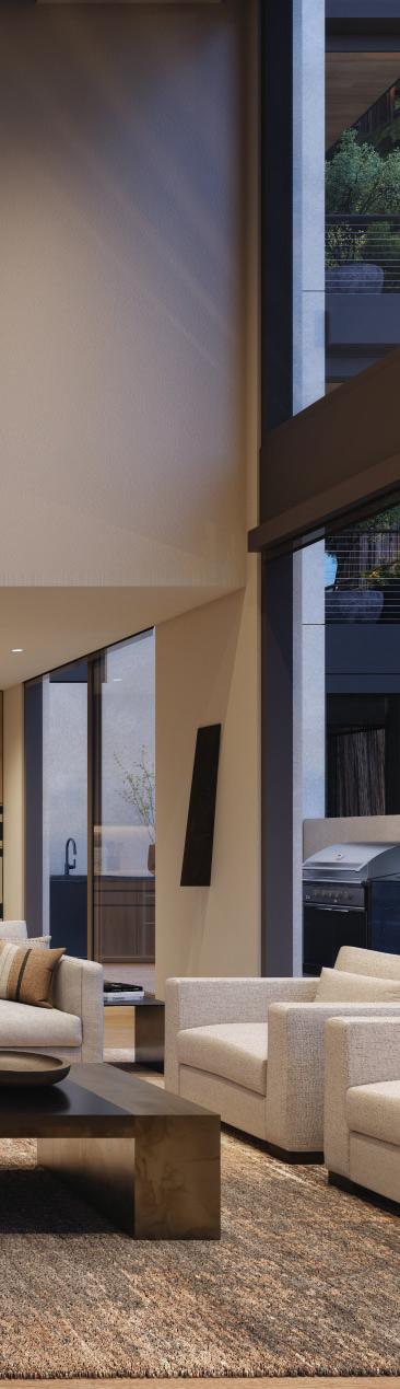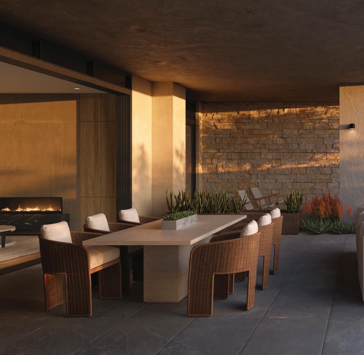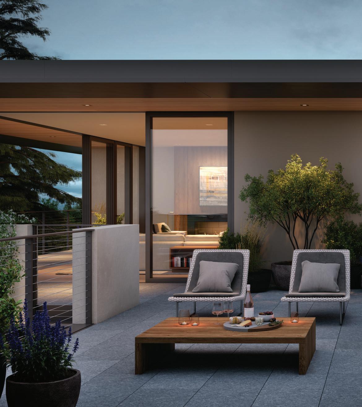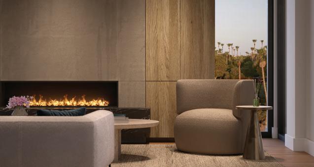 Outdoor fireplaces, private patio gardens and large sliding doors connect the indoor and outdoor spaces and encourage a seamless flow for residents. We create layers of furniture, accessories and light to enliven the spaces, providing good spacial sequencing and suggestion of how the spaces should live and feel.