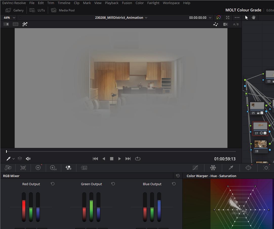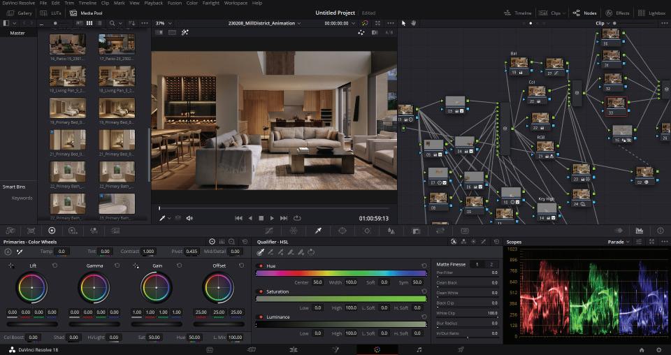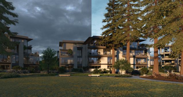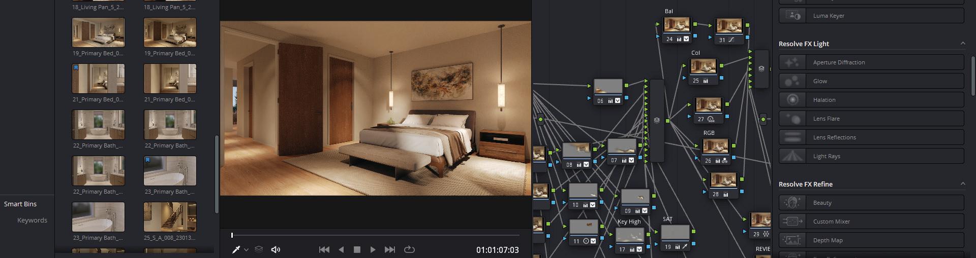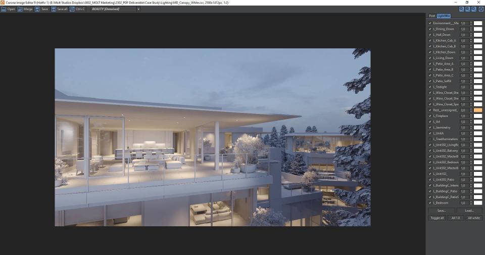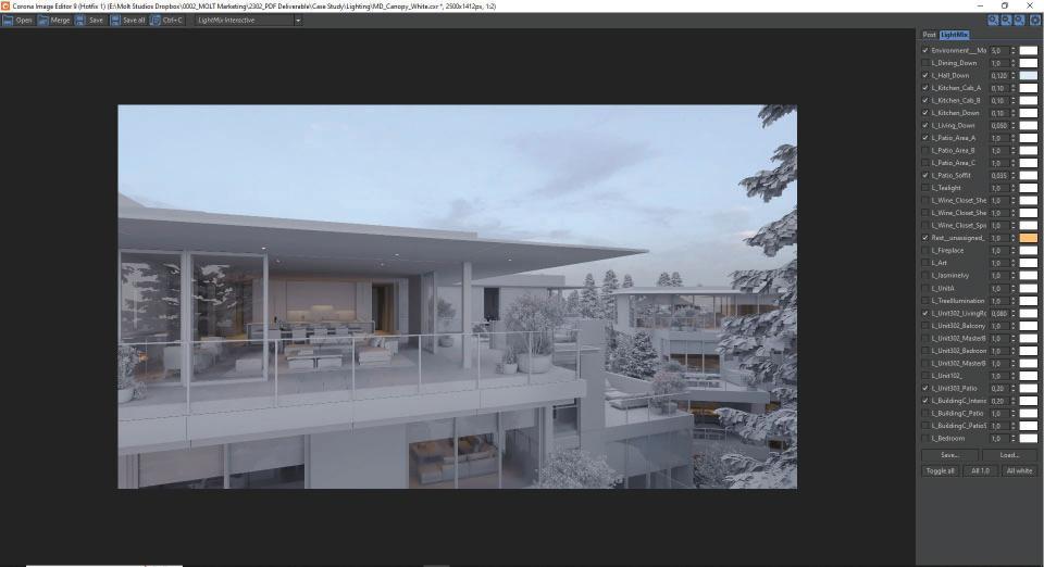 Once an image is rendered in its raw state, the Corona Image Editor (CIE) enables massive flexibility in the final light levels, affording us an opportunity to provide either a variety of lighting solutions or to pull the light levels down to the LOG profile. The second ensures ultimate latitude in our color grading environment, DaVinci Resolve. We often jump on a video conference with the project team to explore lighting refinement in real time, accelerating the process by way of eliminating the need to another email thread discussing the importance of key to fill and color temperature.