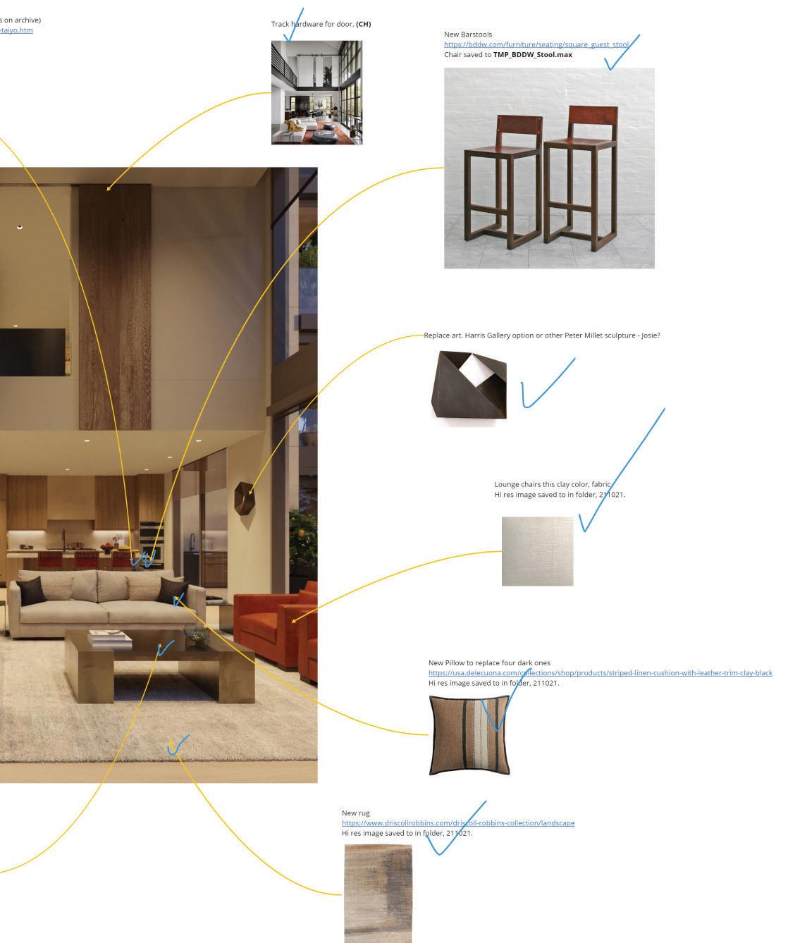 Prior to the initial meeting we’ll send a request for information including material specs, drawings, 3d models, and inspirational imagery. Our team pours over the information, familiarizing ourselves with the project documents and forming some initial thoughts on the trajectory of the production pipeline - phasing, priorities, missing information and precedents