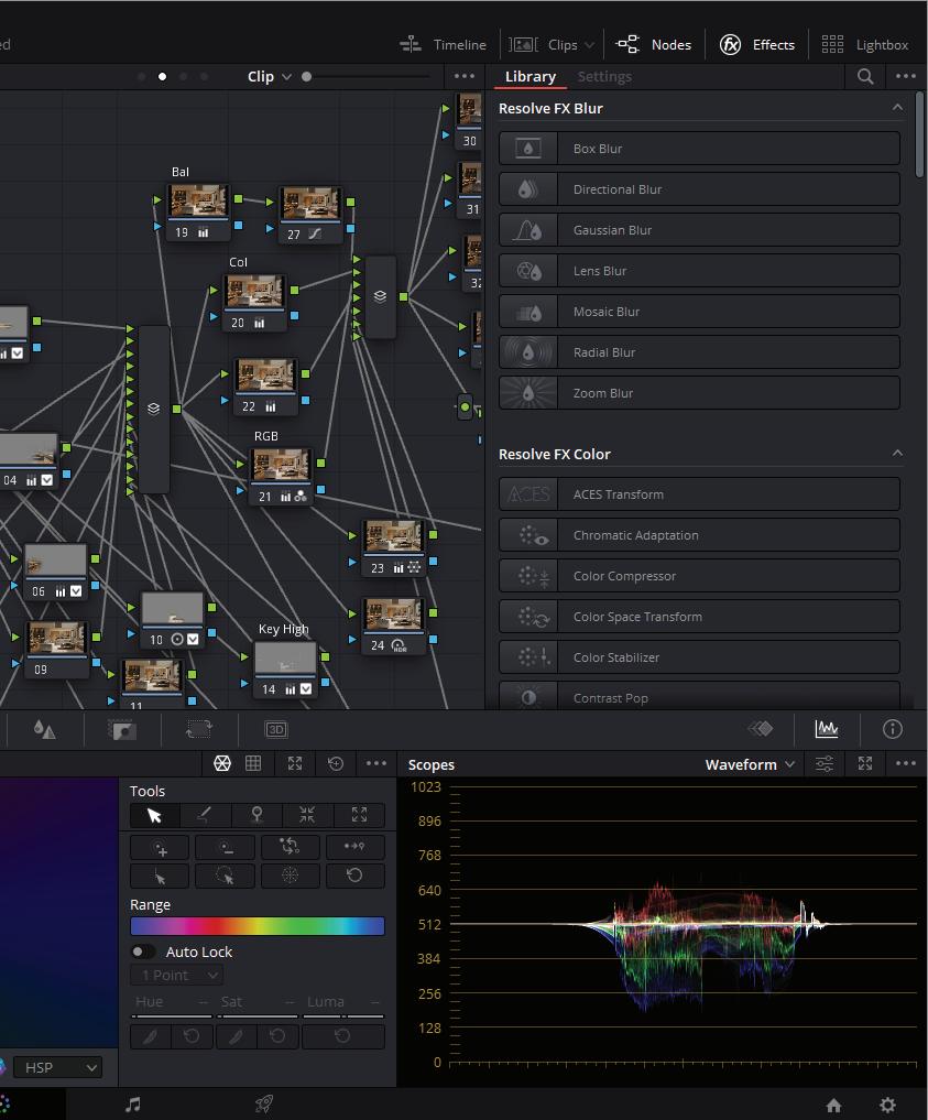 Upper: DaVinci Resolve color panel/masking cabinets