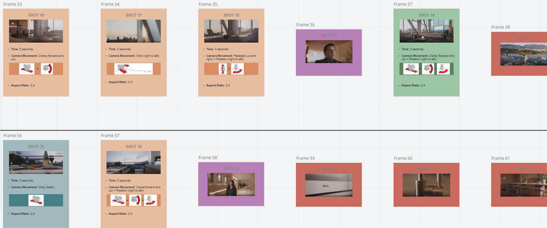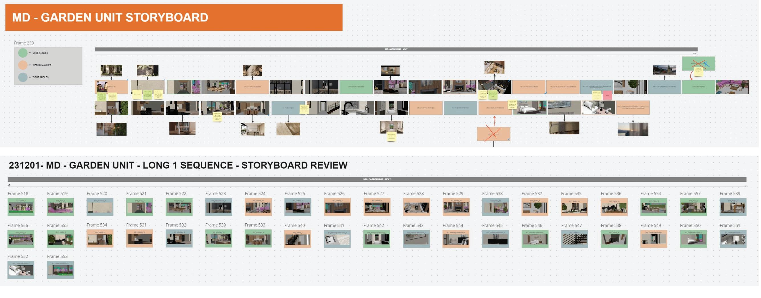 Similar to our static image production work flow, animation analysis and storyboarding is completed in a client facing digital whiteboard, Miro. Film and/ or animation analysis of precedents affords us a better understanding of the cadence and story arc that has been deployed to create the precedent work. Using this information, we can jump-start the design of the animation, using a similar language between our design team and you, the client.