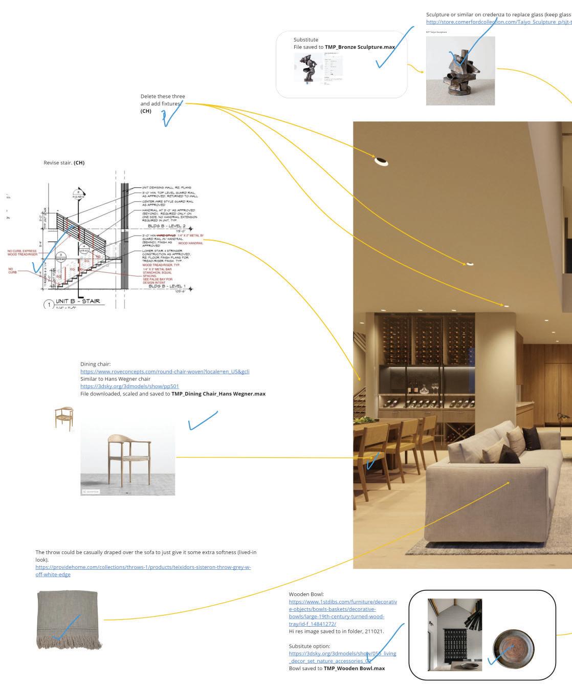 In addition to our formal reviews, we use Miro as a digital whiteboard for client communication. Your team has access to the boards to upload inspiration, material photography, drawings, sketches, and specs. Moreover, everyone with access to the project will see draft images and be able to add comments throughout the project development.