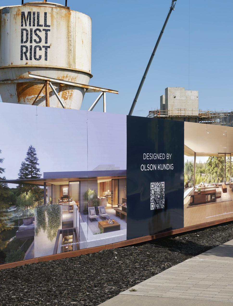 This Page: The Mill District site hoarding and pedestal placards adorn the site during construction.