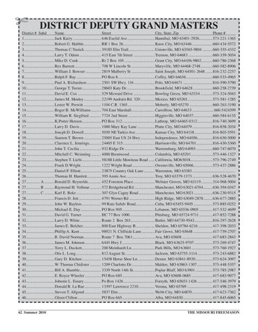 DISTRICT DEPUTY GRAND MASTERS District # Subd Name Street City, State, Zip Phone # 1..............................Jack Kairy ............................ 646 Euclid Ave ...........................Hannibal, MO 63401-2926 .............573-221-1365 2..............................Robert G. Hubble ................. RR 1 Box 26 ...............................Knox City, MO 63446 ....................660-434-5572 3..............................Thomas C.Yunick ................ 39185 Elm Trail..........................Unionville, MO 63565-9804 ..........660-355-4332 4..............................Larry T. Odom ..................... 415 East 7th Street .....................Trenton, MO 64683 ........................660-359-3054 5..............................Mike D. Cook ...................... Rr 2 Box 105 ..............................Grant City, MO 64456-9802 ...........660-786-2368 6..............................Rex Barnett .......................... 708 W Lincoln St .......................Maryville, MO 64468-2748 ............660-582-8906 7..............................William J. Bowser ............... 2819 Mulberry St .......................Saint Joseph, MO 64501-2648 .......816-232-2257 8..............................Ralph F. Ray ........................ PO Box 8 ....................................Coffey, MO 64636 ..........................660-533-4965 9..............................Paul A. Richardson .............. 2501 SW Hwy. 116 ....................Polo, MO 64671 .............................816-590-5790 10............................George T. Teeter................... 28603 Katy Dr ............................Brookfield, MO 64628 ...................660-258-2739 11 ............................David E. Cox ....................... 529 Mcward Drive .....................Bowling Green, MO 63334 ............573-324-5043 12............................James M. Mosley ................. 22199 Audrain Rd. 320 ..............Mexico, MO 65265.........................573-581-1285 13............................Lester W. Prewitt ................. 1104 C.R. 1365...........................Moberly, MO 65270 .......................660-263-3190 14............................Roger B. McWilliams .......... 704 East Marshall.......................Carrollton, MO 64633 ..................... 660-5424399 15............................William R. Siegfried ............ 7724 2nd Street ..........................Higginville, MO 64037...................660-584-6135 16............................K.Porter Hensen................... PO Box 312 ................................Lathrop, MO 64465-0312 ...............816-740-3699 17............................Larry D. Davis ..................... 1000 Mary Kay Lane .................Platte City, MO 64079 ....................816-858-2034 18............................Joseph D. Dowell ................. 5030 NE Tarkio Ave ...................Kansas City, MO 64118 ..................816-803-5591 19............................Stanton T. Brown ................. 25005 East US 24 Hwy ..............Independence, MO 64056...............816-650-5000 20............................Clarence L. Jennings............ 24405 E 315 ...............................Harrisonville, MO 64701 ................816-430-5360 21............................John T. Cecilia ..................... 932 Ridge Dr ..............................Warrensburg, MO 64093 ................660-747-6070 22............................Mitchell C. Weinsting .......... 4000 Brentwood .........................Columbia, MO 65201 .....................573-446-1327 23............................Stephen T. Liebi ................... 58188 Little Moniteau Road ......California, MO65018......................573-796-2749 24............................Frank D.Wright .................... 1222 Wright Road ......................Owensville, MO 65066...................573-437-2886 25............................Daniel P. Elliott .................... 23875 Country Oak Lane ...........Warrenton, MO 63383 .......................................... 26............................Thomas H. Hamlett.............. 395 Annie Ave ............................Troy, MO 63379-1373 ....................636-528-4670 27.............. A ..........Ronald D. Reynolds ............. 452 Foreston Place .....................Webster Groves, MO 63119 ...........314-968-5004 27.............. B ..........Raymond H. Vollmar ........... 572 Bridgebend Rd ....................Manchester, MO 63021-6704 .........636-394-0347 27.............. C ..........Karl E. Beke ........................ 307 Glyn Cagny Road ................Manchester, MO 63021 ..................636-230-9315 28............................Francis D. Jett ...................... 4791 Werner Rd .........................High Ridge, MO 63049-2878 .........636-677-2885 29............................John W. Bayless ................... 99 Rutz Subdv Road...................Cuba, MO 65453-9405 ...................573-885-0252 30............................Michael E. Day .................... PO Box 905 ................................Lebanon, MO 65536-0905 .............417-532-4699 31............................David G. Turner ................... HC 77 Box 1000.........................Pittsburg, MO 65724-9711 .............417-852-7288 32............................Larry D. White ..................... Route 2 Box 263........................Butler, MO 64730-9543..................816-297-2628 33............................James E. Belcher.................. 800 East Highway B...................Sheldon, MO 65784-6216 ..............417-398-2033 34............................Phillip A. Kent ..................... 98921 N. Cliffside Lane .............Fair Grove, MO 65648 ...................417-759-2707 35............................R. David Norman ................. Route 7 Box 7061......................Ava, MO 65608 ..............................417-683-2843 36............................James M. Johnson ................ 6445 Hwy J .............
