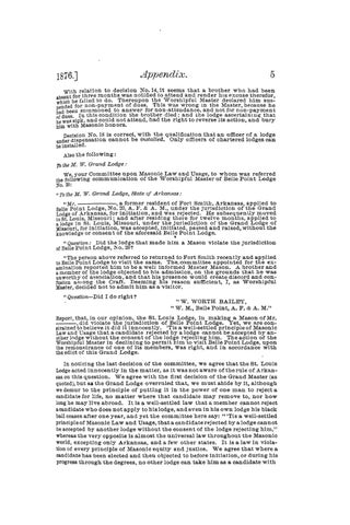 Also the following: To the llf. lV. Grand Lodge: We your Committee upon Masonic Law and Usage, to whom was referred the foliowing coromunication of the Worshipful Master of Belle Point Lodge No. 20: " To the M. W. G'J'and Lodge, State of A1'kansas: "Mt.. - - - - - , a former resident of Fort Smith, Arkansas, applied to Belle Point Lodge, No. 20, A. F. & A. M., under the jurisdiction of the Grand Lodge of Arkansas, for initiation, and was rejected. He sUbsequently moved to St. Louis, Missouri; and after residing there for twelve months, applied to a lodge in St. Louis, Missouri, under the jurisdiction of the Grand Lodge of Missouri, for initiation, was accepted, initiated, passed and raised, without the knowledge or consent of the aforesaid Bel~ Point Lodge.