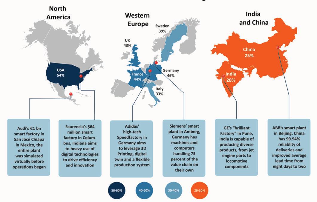 According to Capgemini Smar t Fac tories rep or t the US and Western Europe in par ticular have made an early head star t in adopting a smar t fac tor y business model. Nearly half of the man ufac turers in the US , France, G ermany, and UK have an ongoing smar t fac tor y initiative These early adopters have collectively invested over a $100M in these initiatives.4