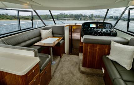 The enclosed flybridge offers panoramic views, lounge seating, Smart TV, fridge, and optional double bed. The aft flybridge deck with its new extended hardtop, provides an all-weather retreat with wet bar, joystick station, lounge, and optional enclosures. At the helm, advanced touchscreen displays, leather helm chairs, and Twin Disc Express Positioning deliver fingertip control with GPS and thrusters. A third helm chair is optional.