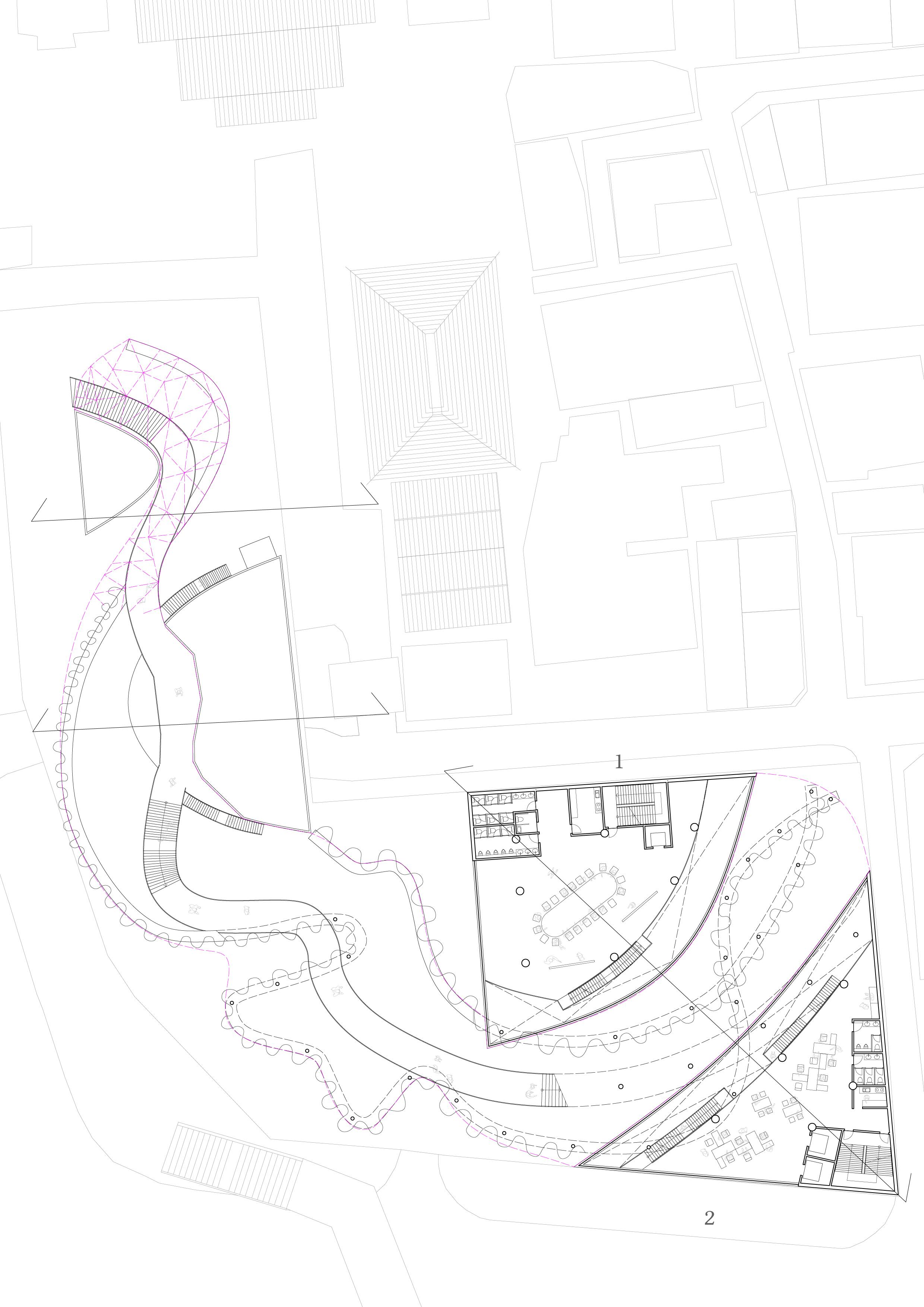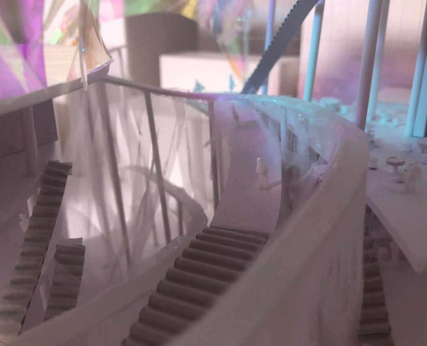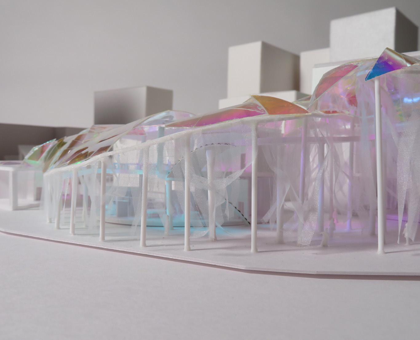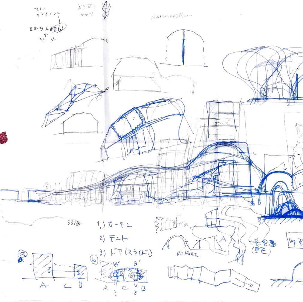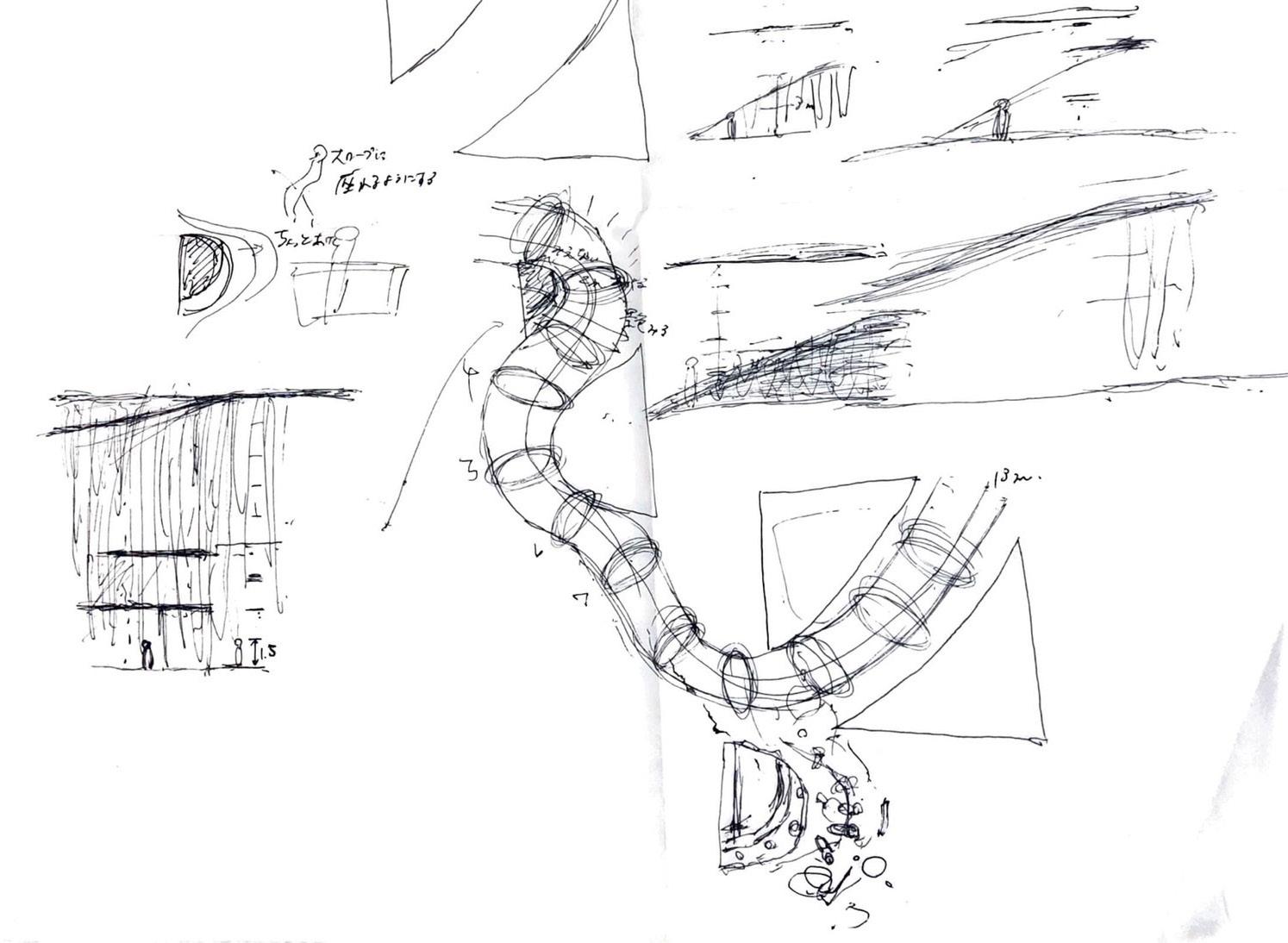 建物の中で行われていた行為が、 膜・カーテン・スロープがある外側へと 投げ出されていく。