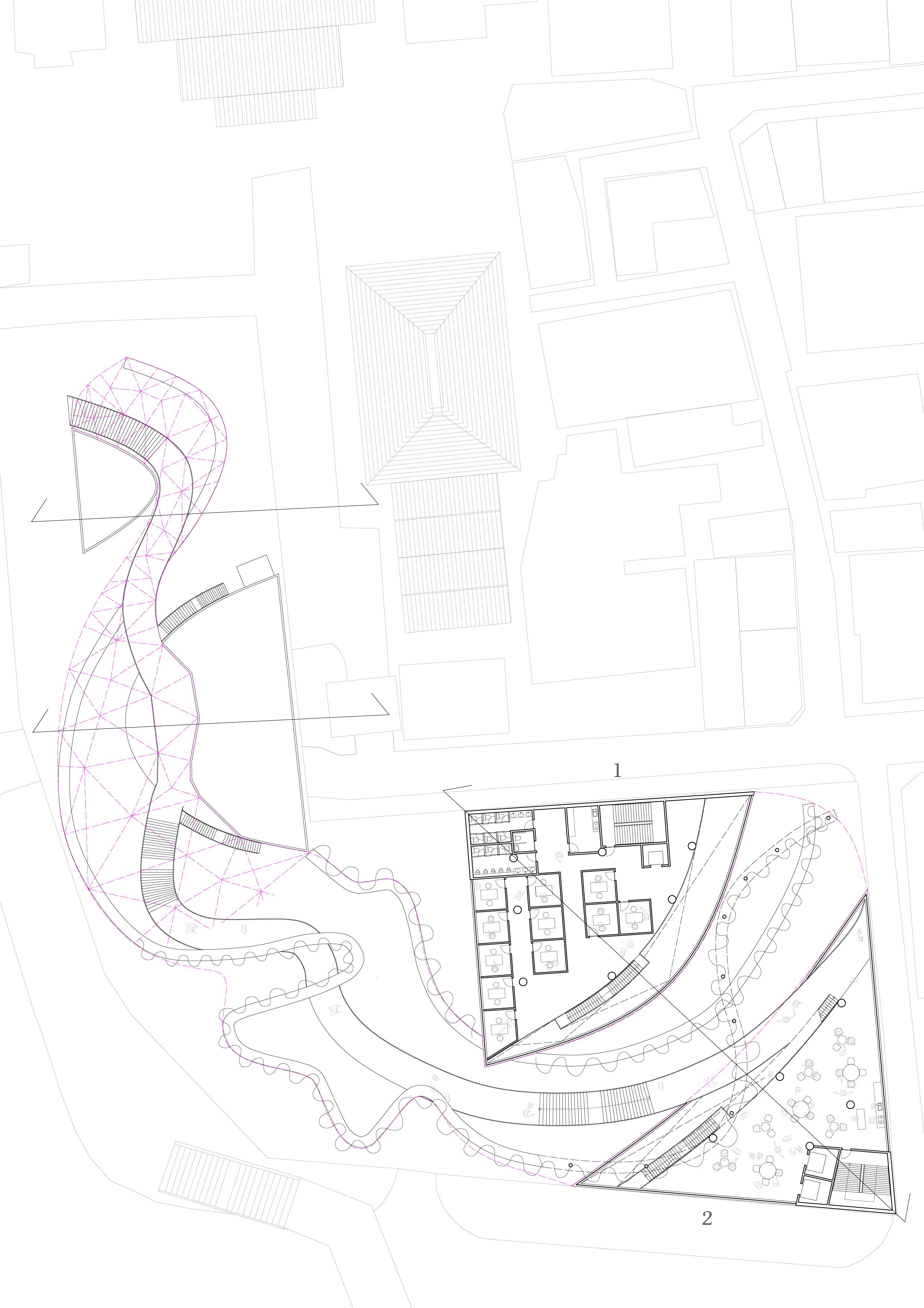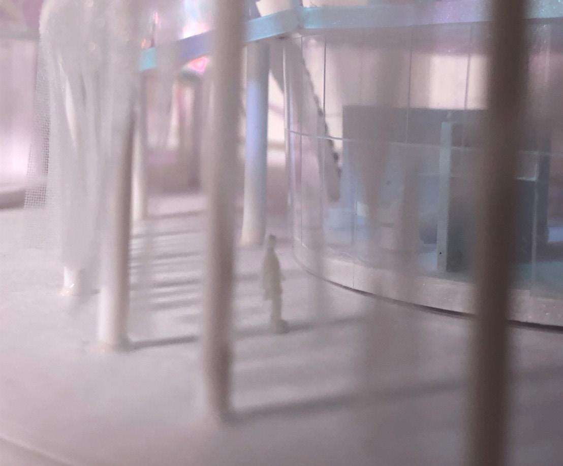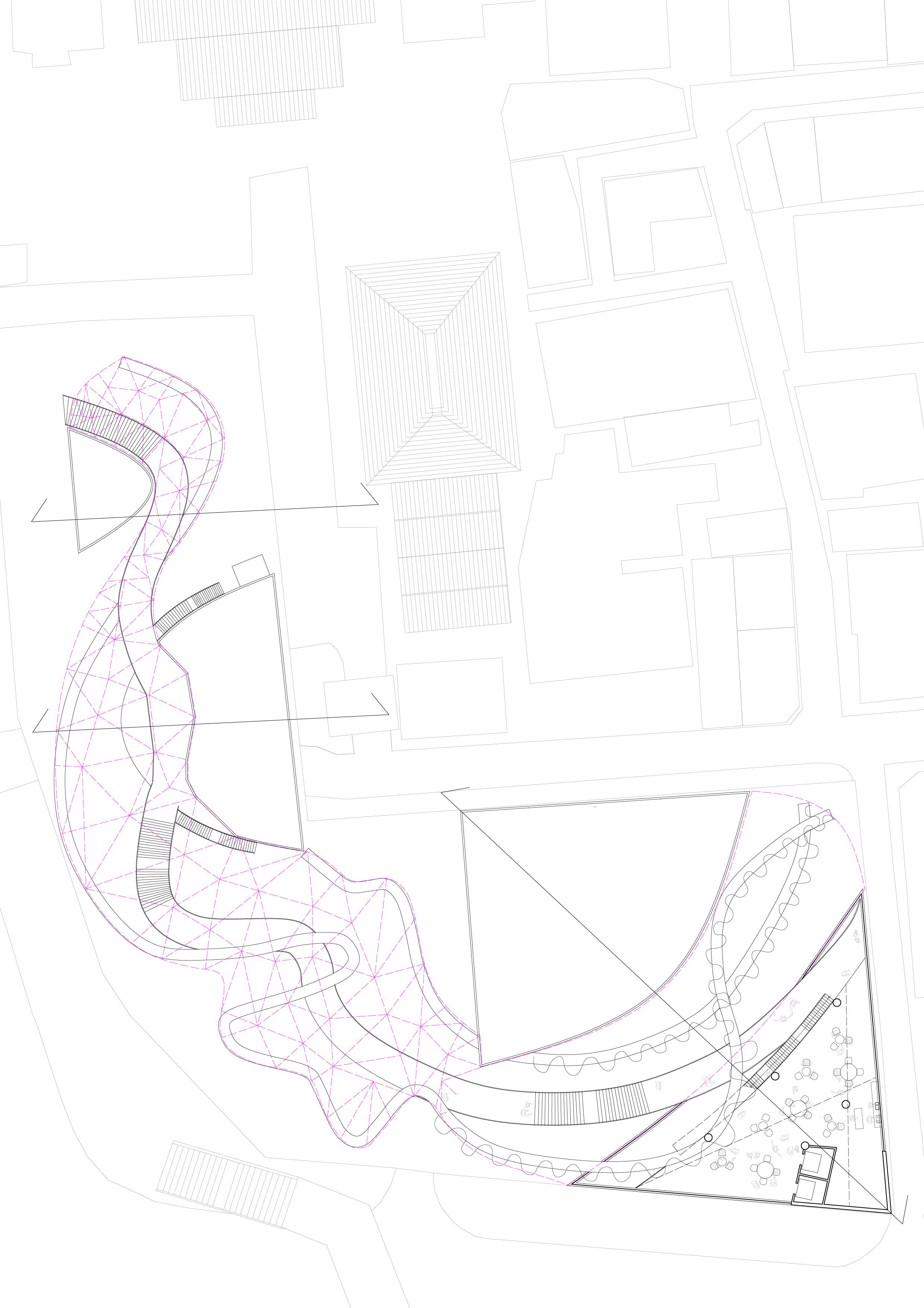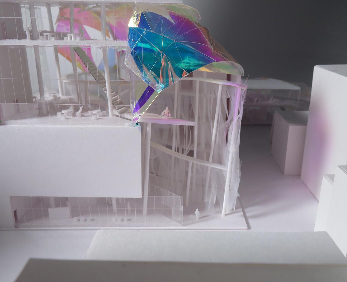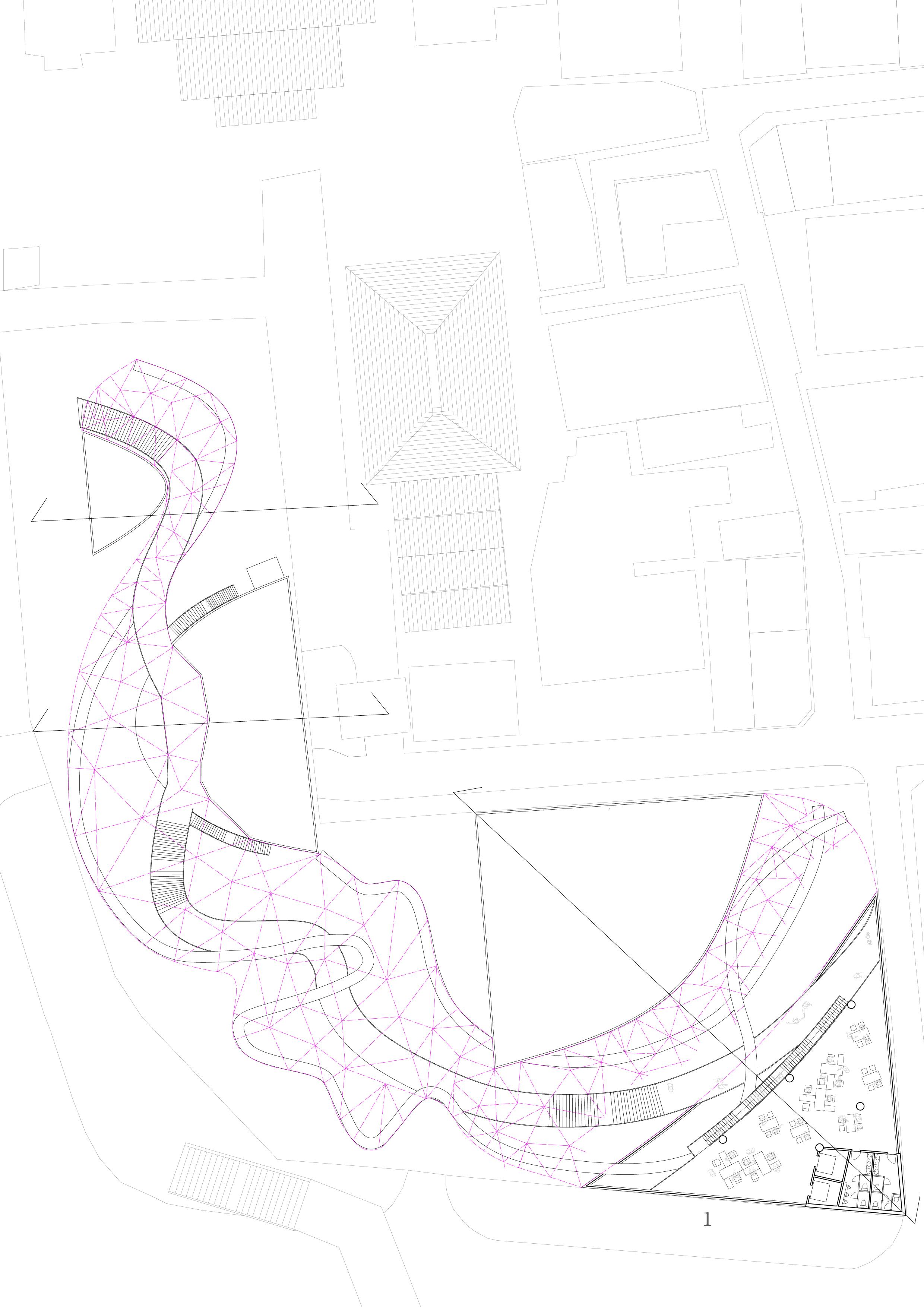 建物の中で行われていた行為が、 膜・カーテン・スロープがある外側へと 投げ出されていく。