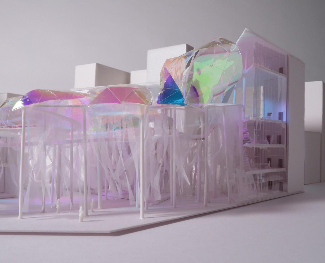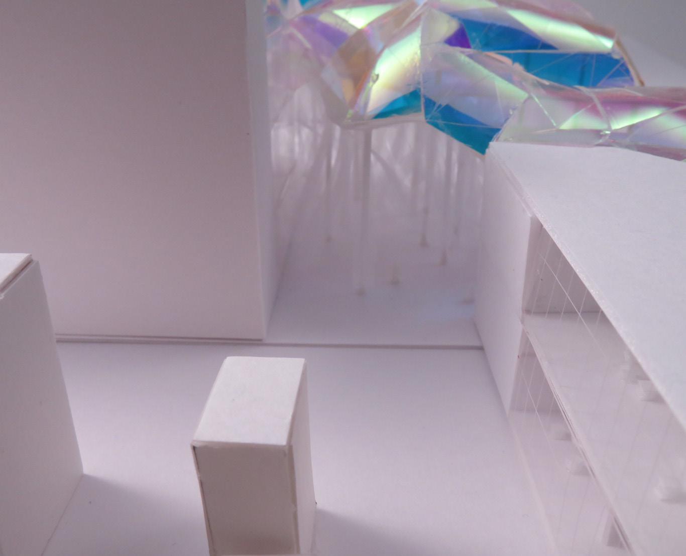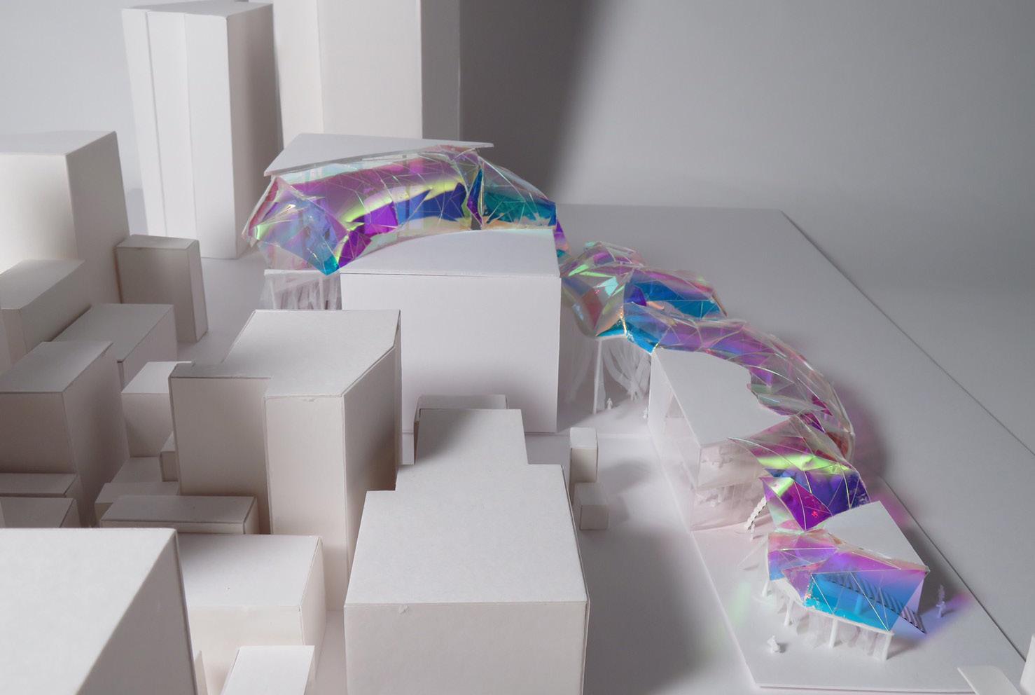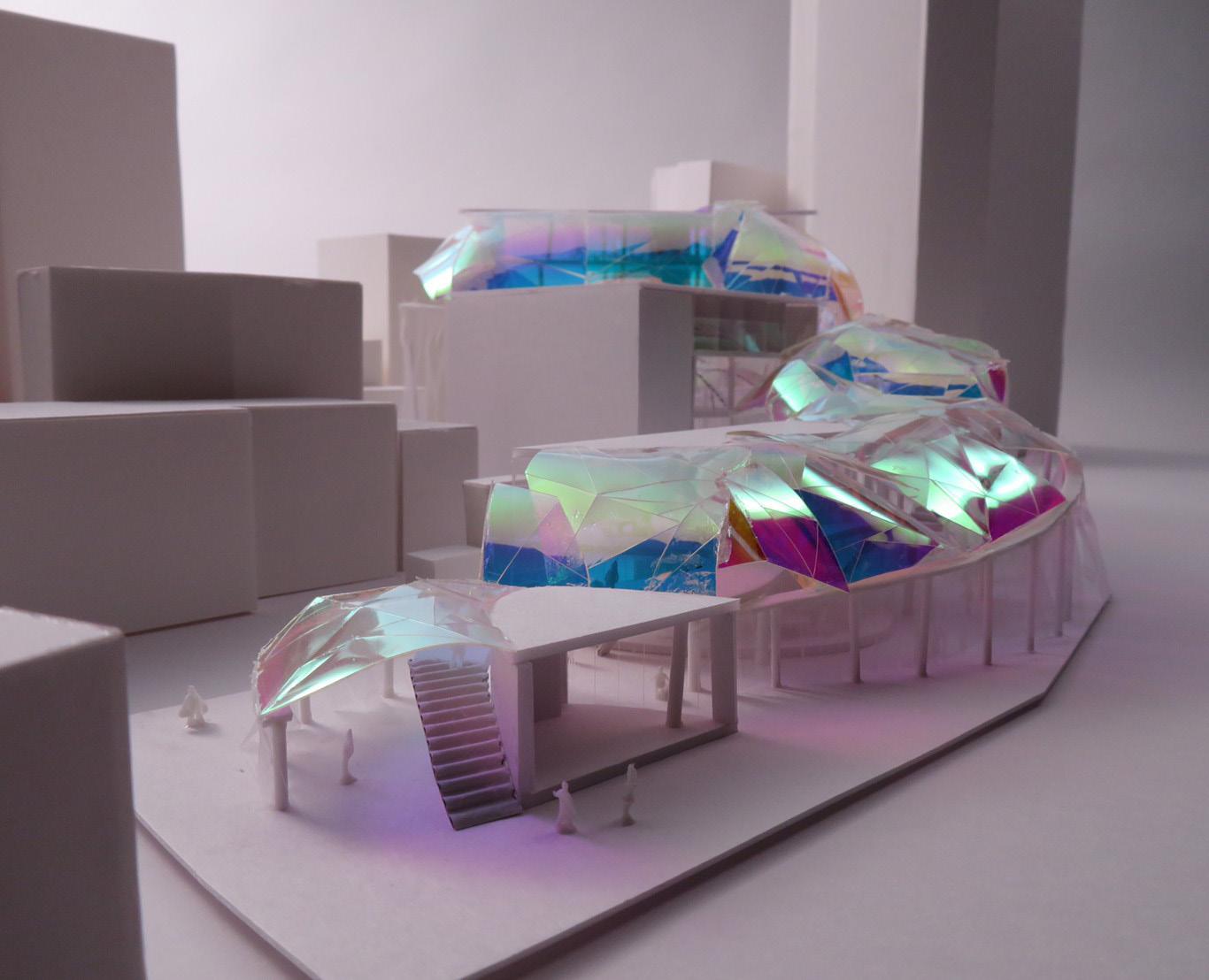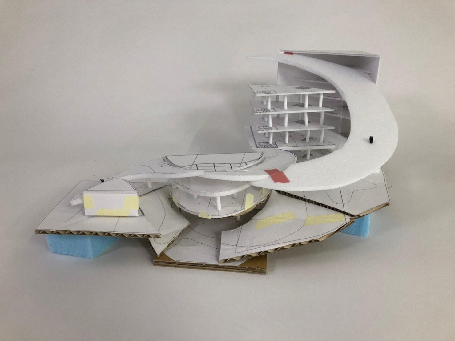 建物の中で行われていた行為が、 膜・カーテン・スロープがある外側へと 投げ出されていく。