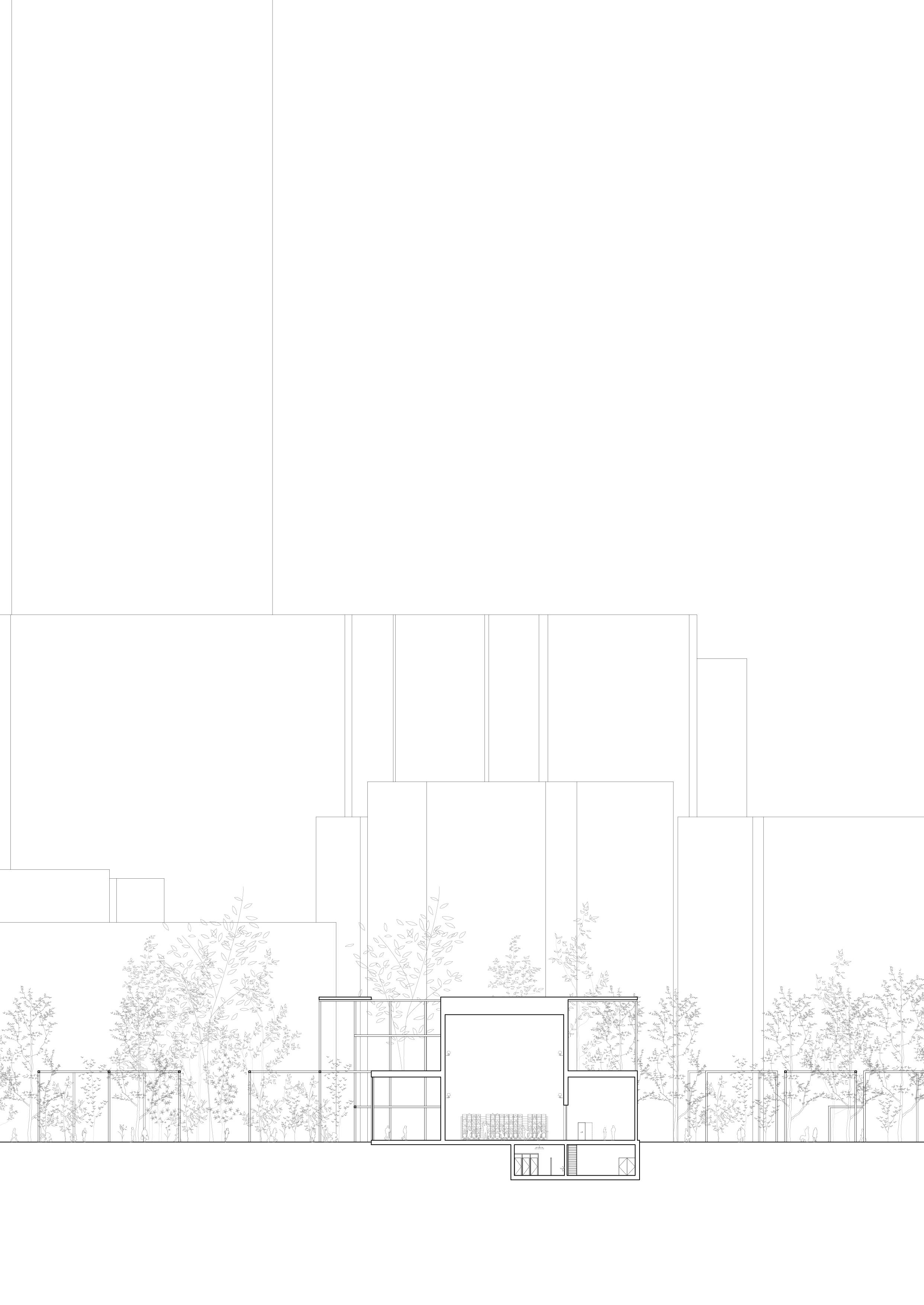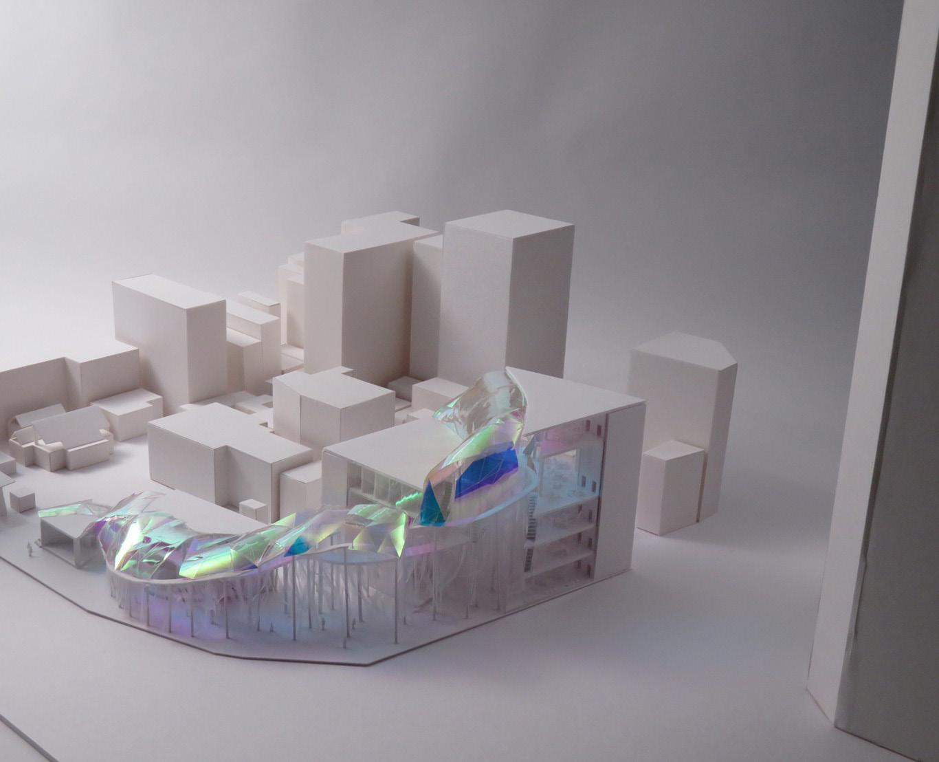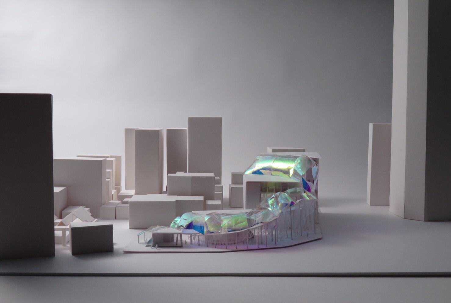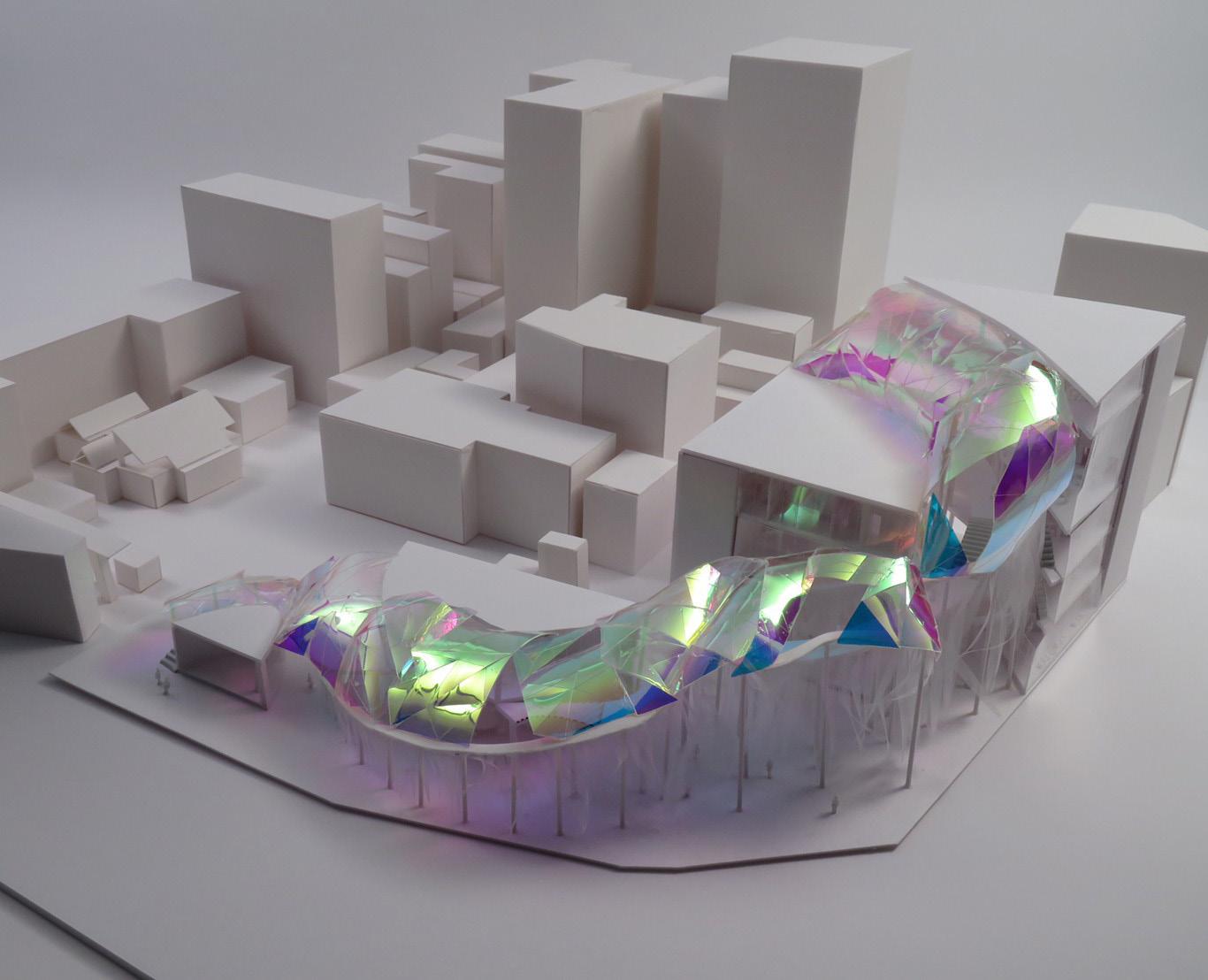 巨大な大ホールは公園内の奥に配置 周囲のビル群との連続性を担保