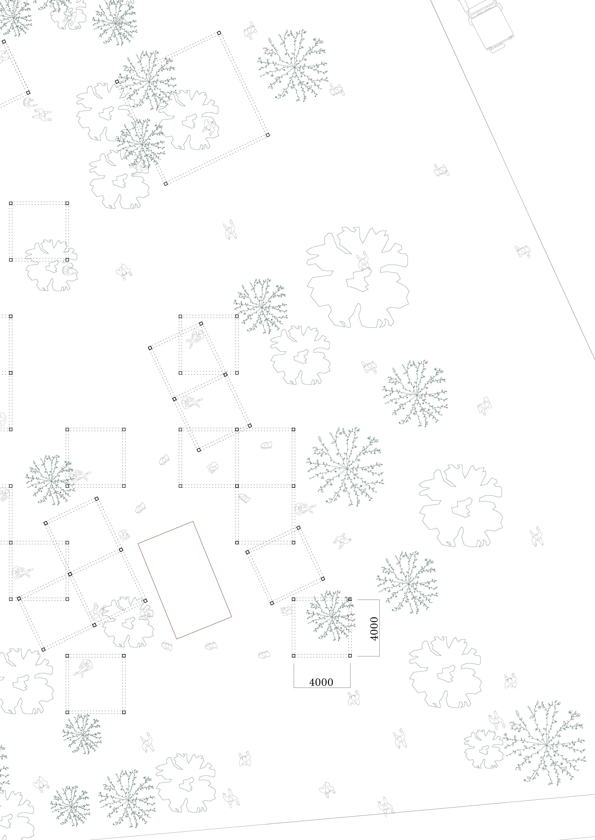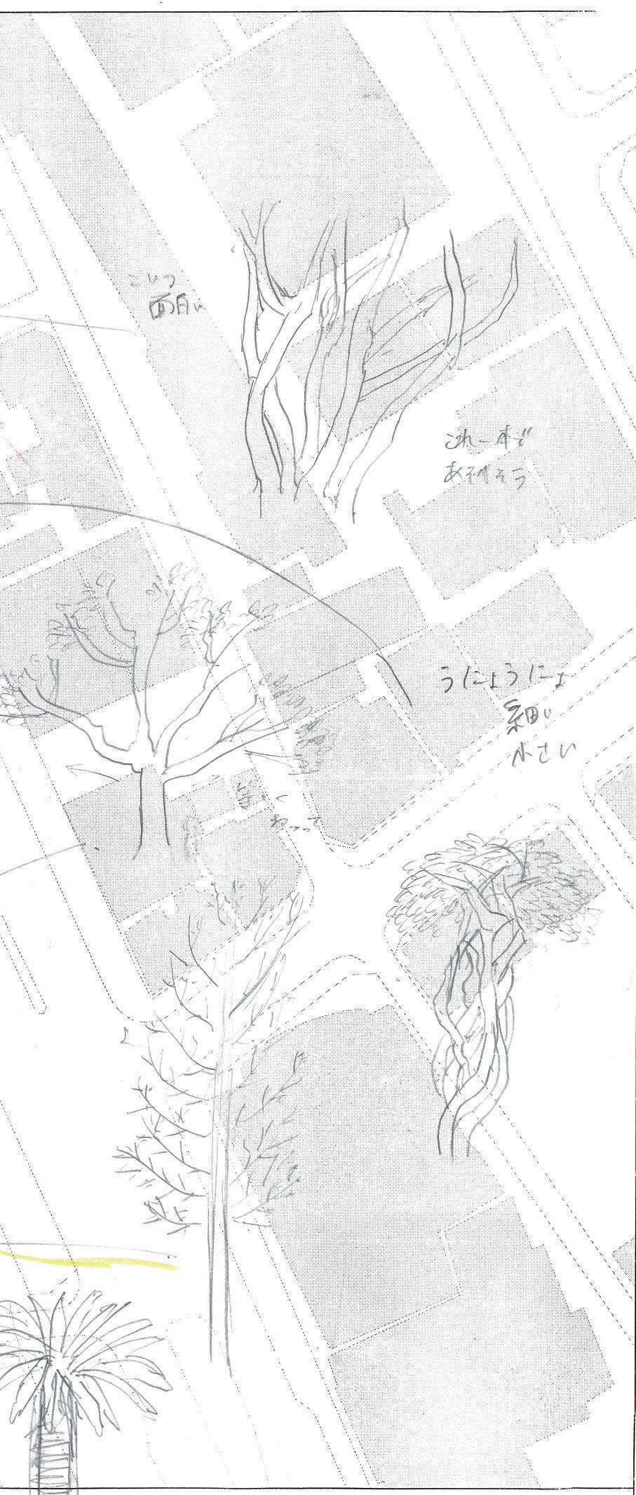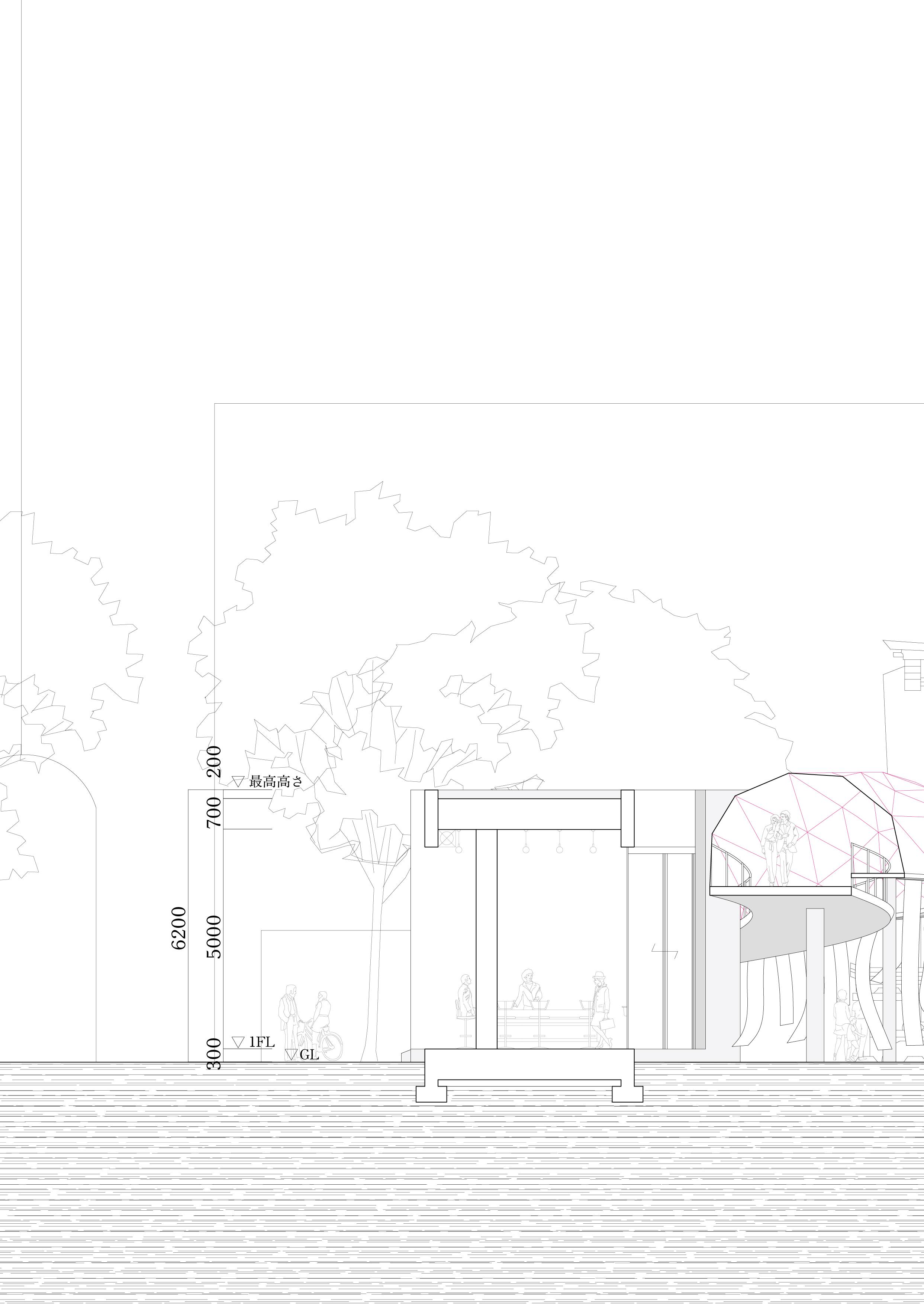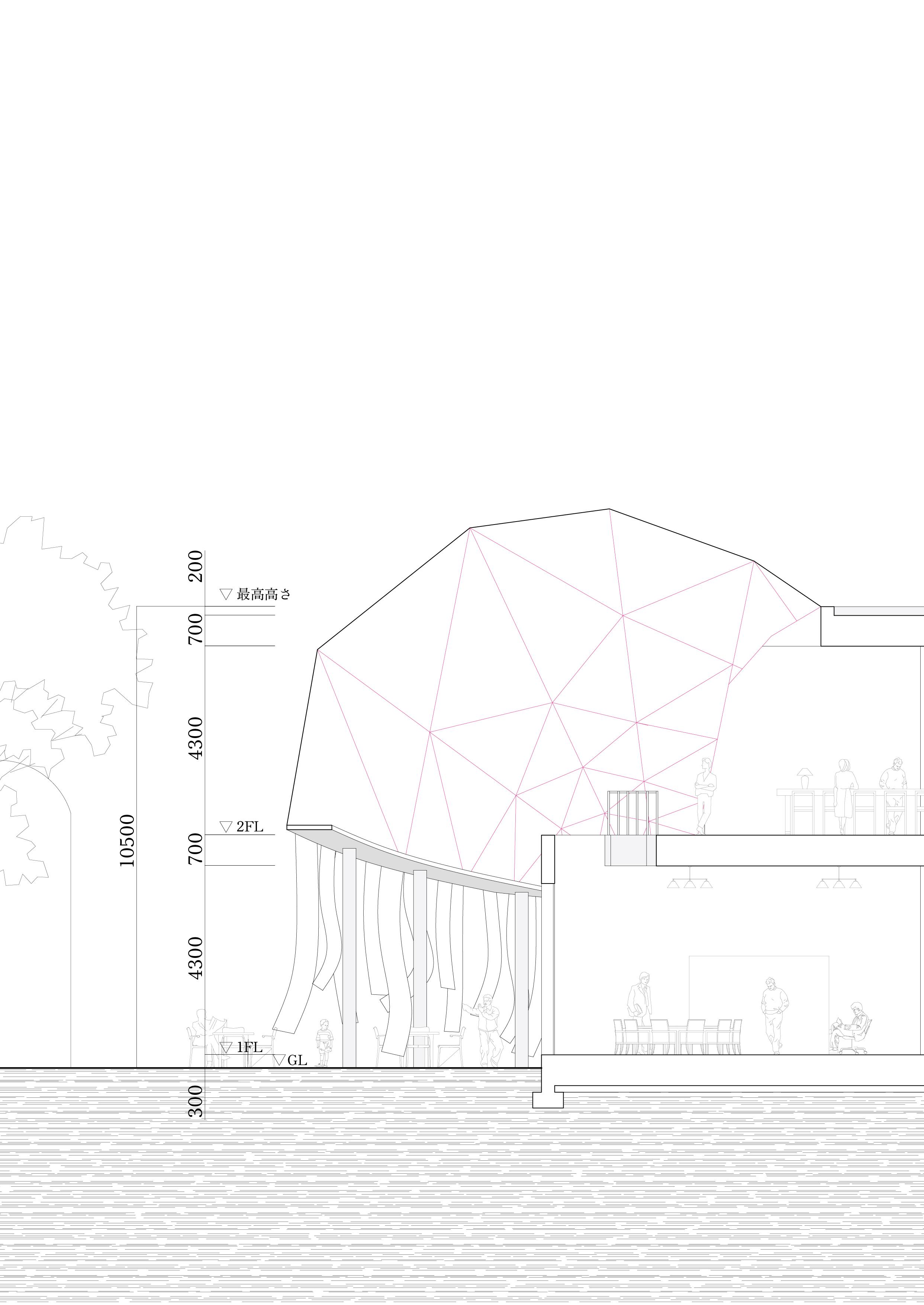 屋根をつくりすぎない 木が屋根となるように 建物を変形する