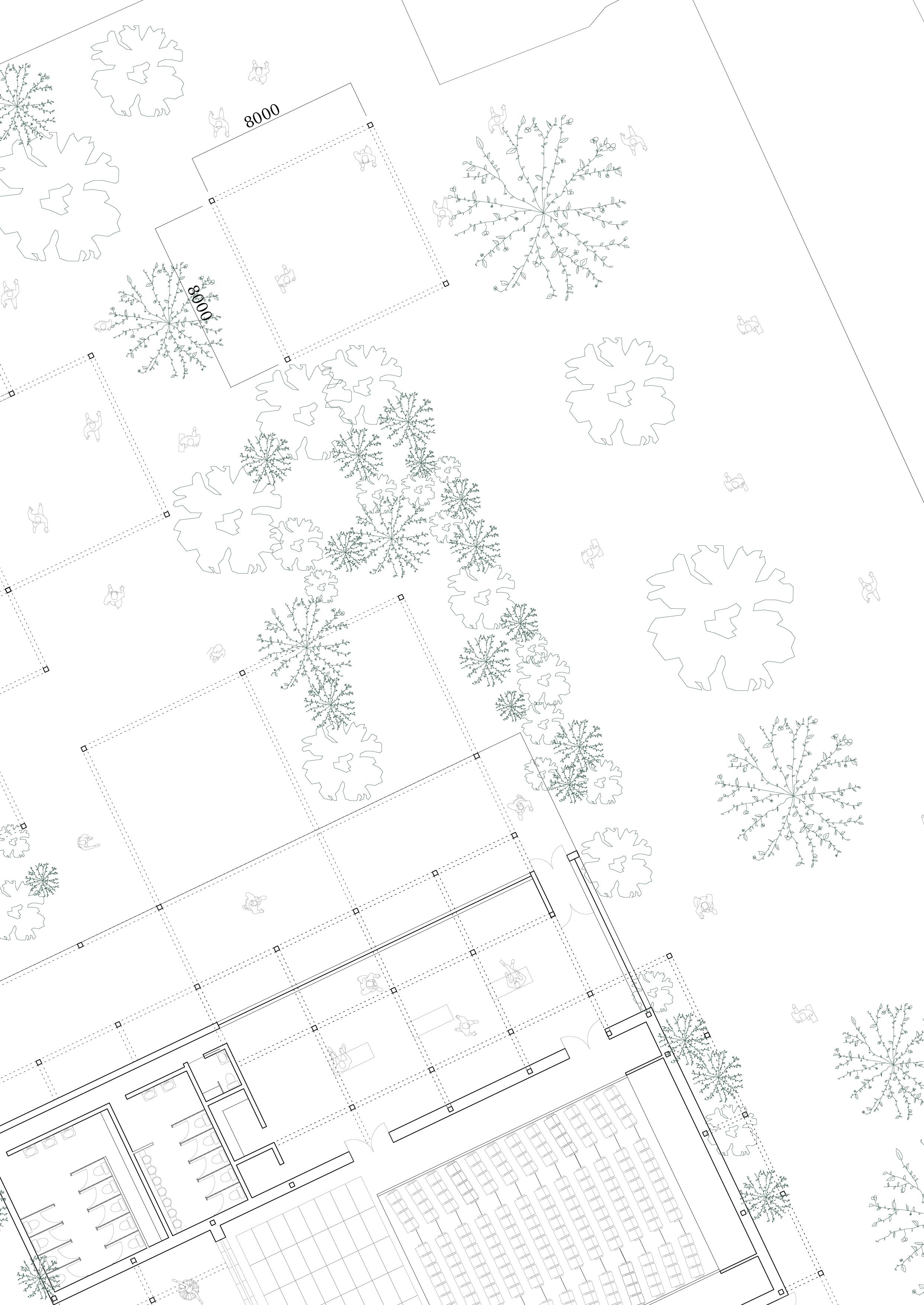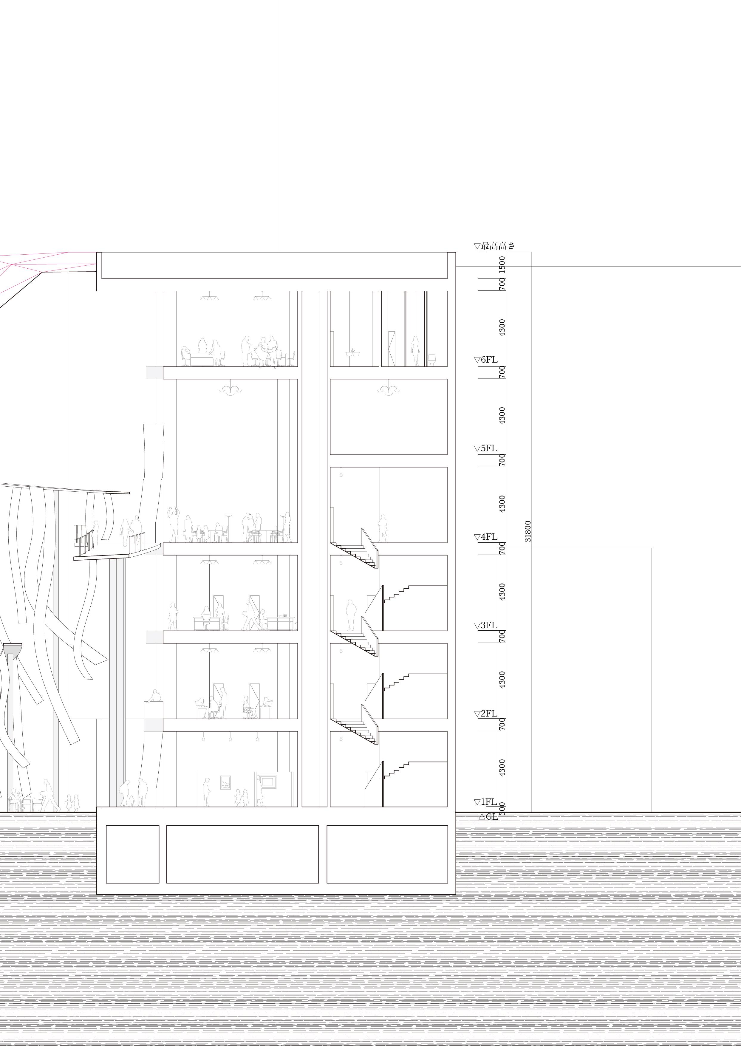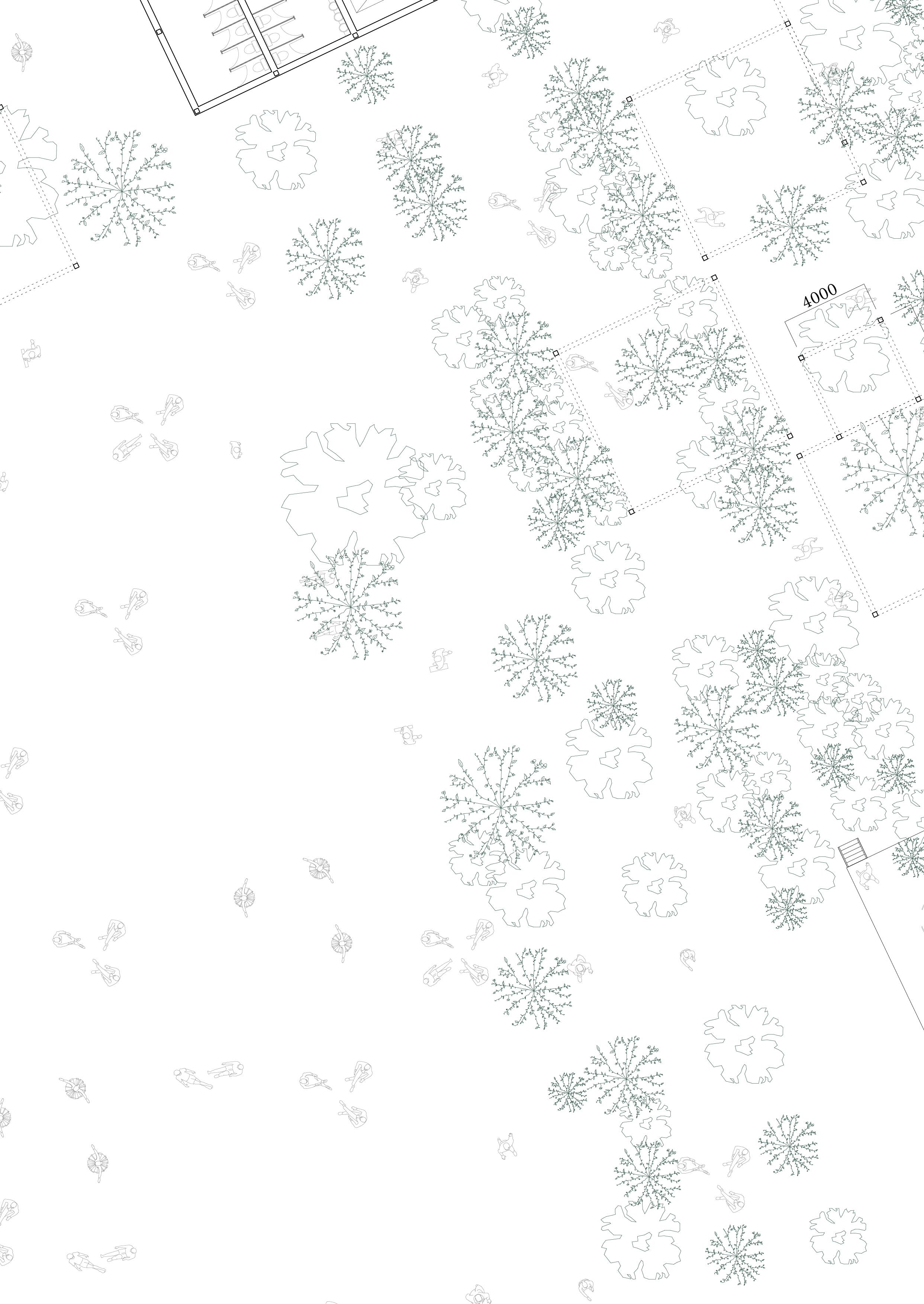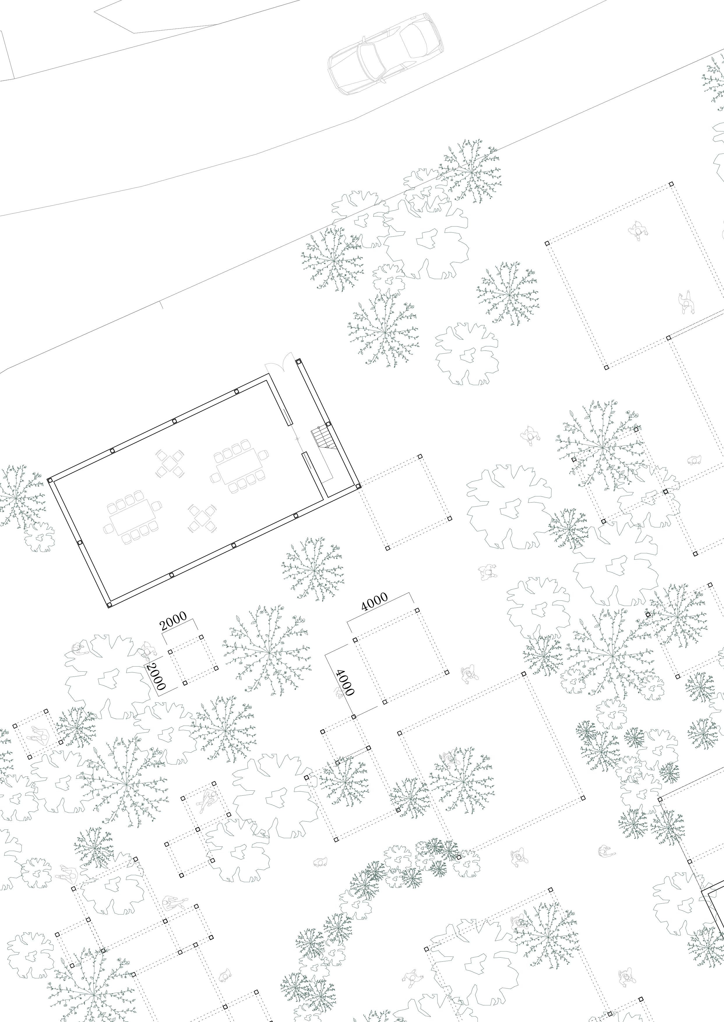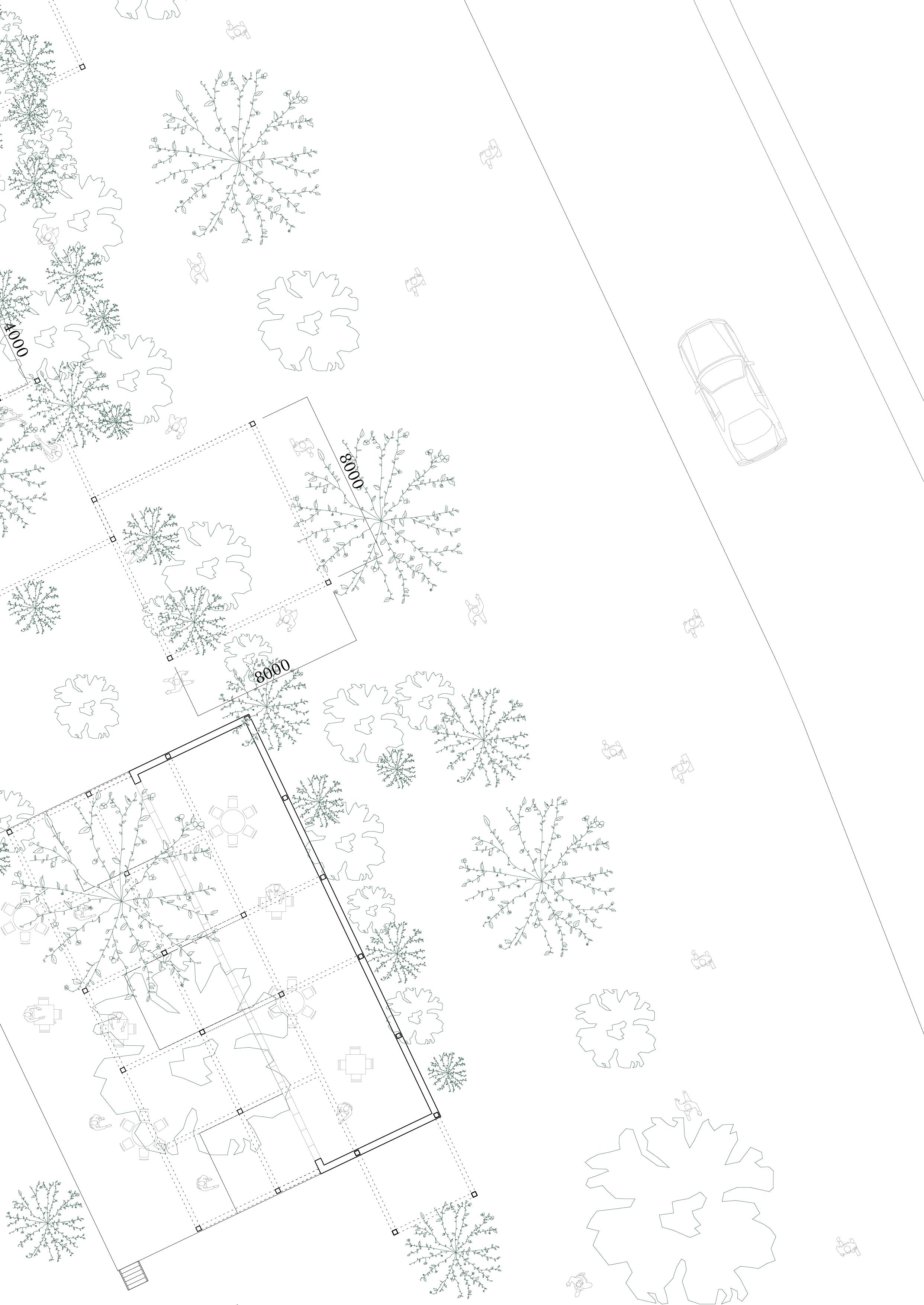 屋根をつくりすぎない 木が屋根となるように 建物を変形する
