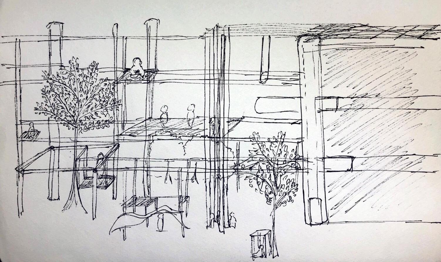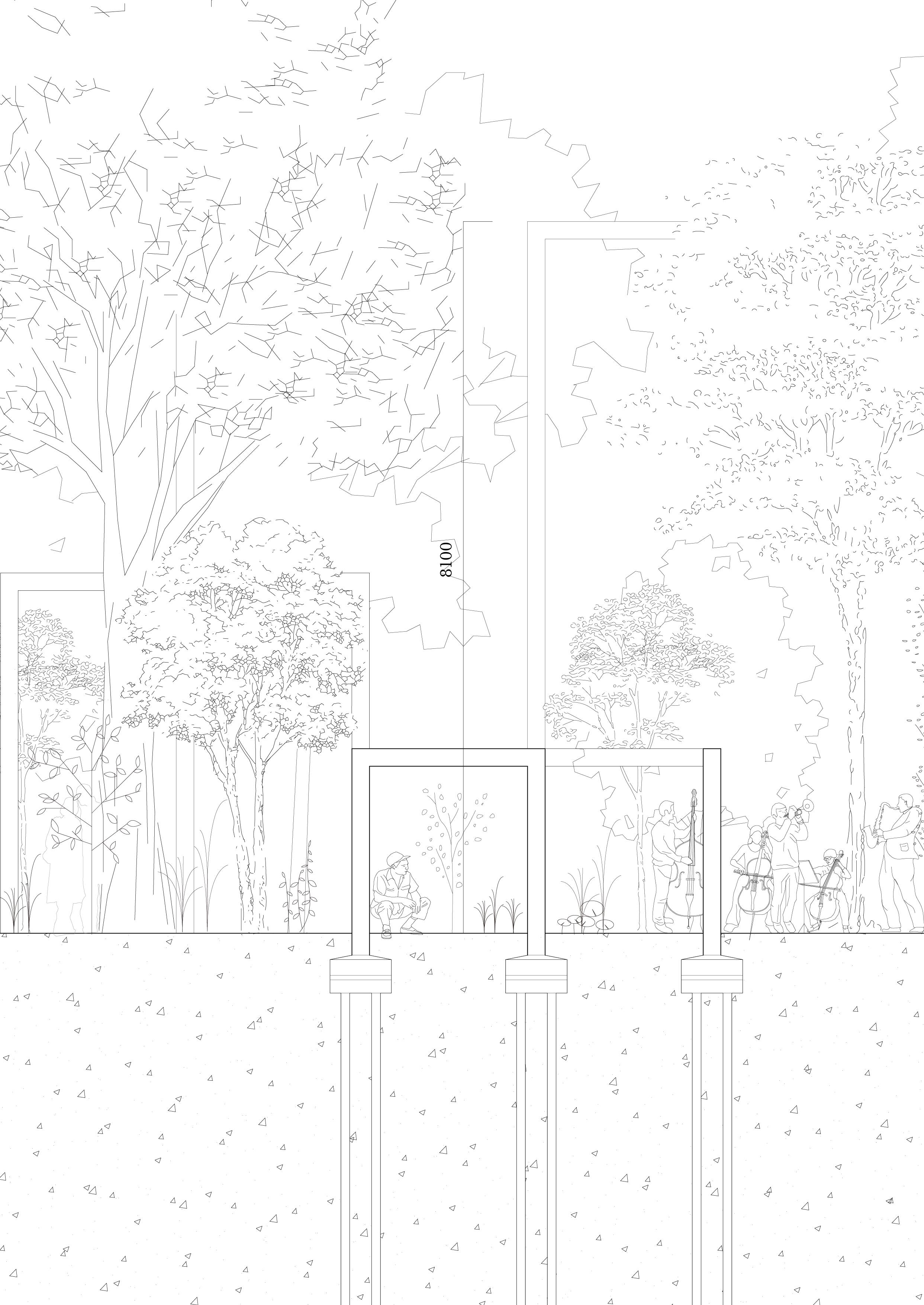 建築の柱と、自然の木。全てを等価に扱い、それらの調和を目指した。