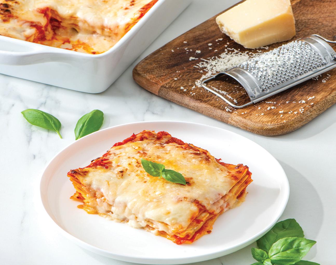 In large, deep, oven-proof casserole dish, ladle small amount of pasta sauce followed by small amount of bechamel sauce. Sprinkle some Par migiano Reggiano cheese over sauces and layer with three lasagna noodles. Continue pattern until dish is complete. Top final layer of noodles with remaining bechamel sauce and grated Par migiano Reggiano.