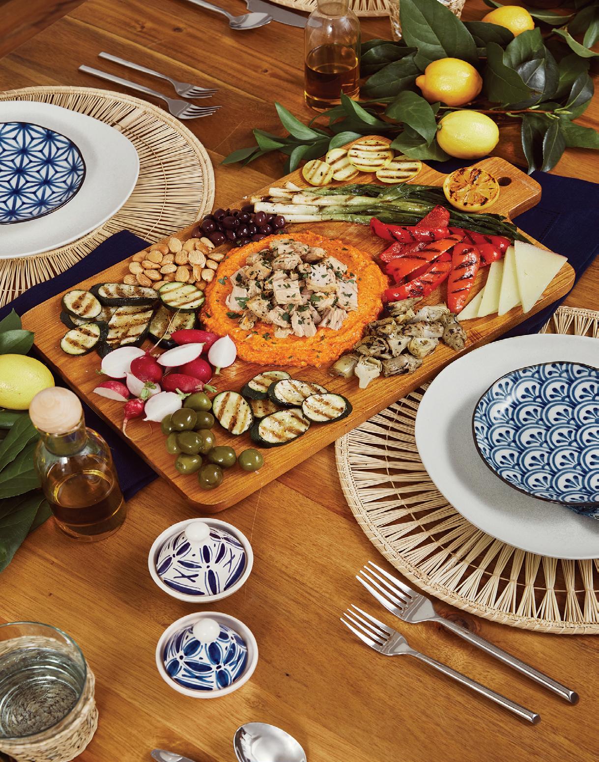 HOST A THEMED PARTY To host a fun and fresh Mediterra nean-themed party, decorate your table with blue and white patterned plates, delicate olive oil and vinegar bottles, cutting boards and fresh ingredients such as lemons and greenery instead of traditional centerpieces. When paired with a flavorful seafood recipe, like this Tuna Romesco Salad Board, your guests will feel like they’re enjoying the Mediterranean with every bite.