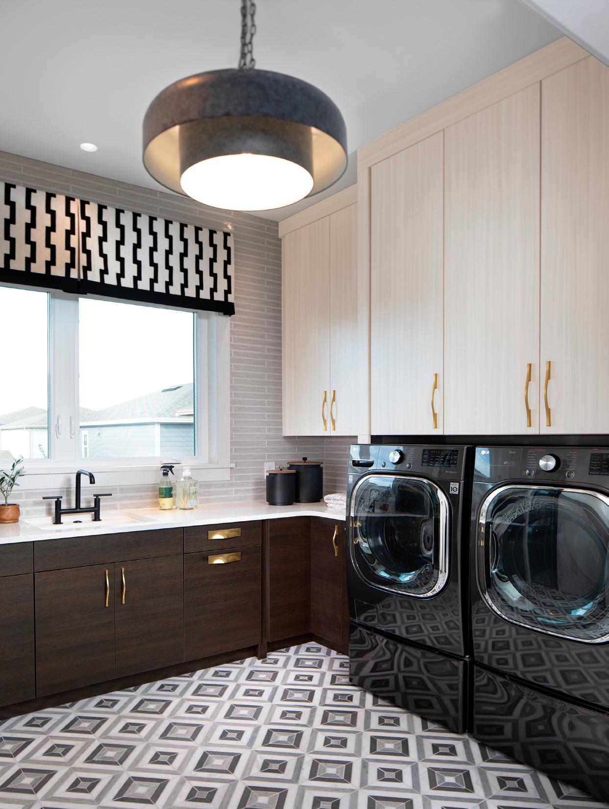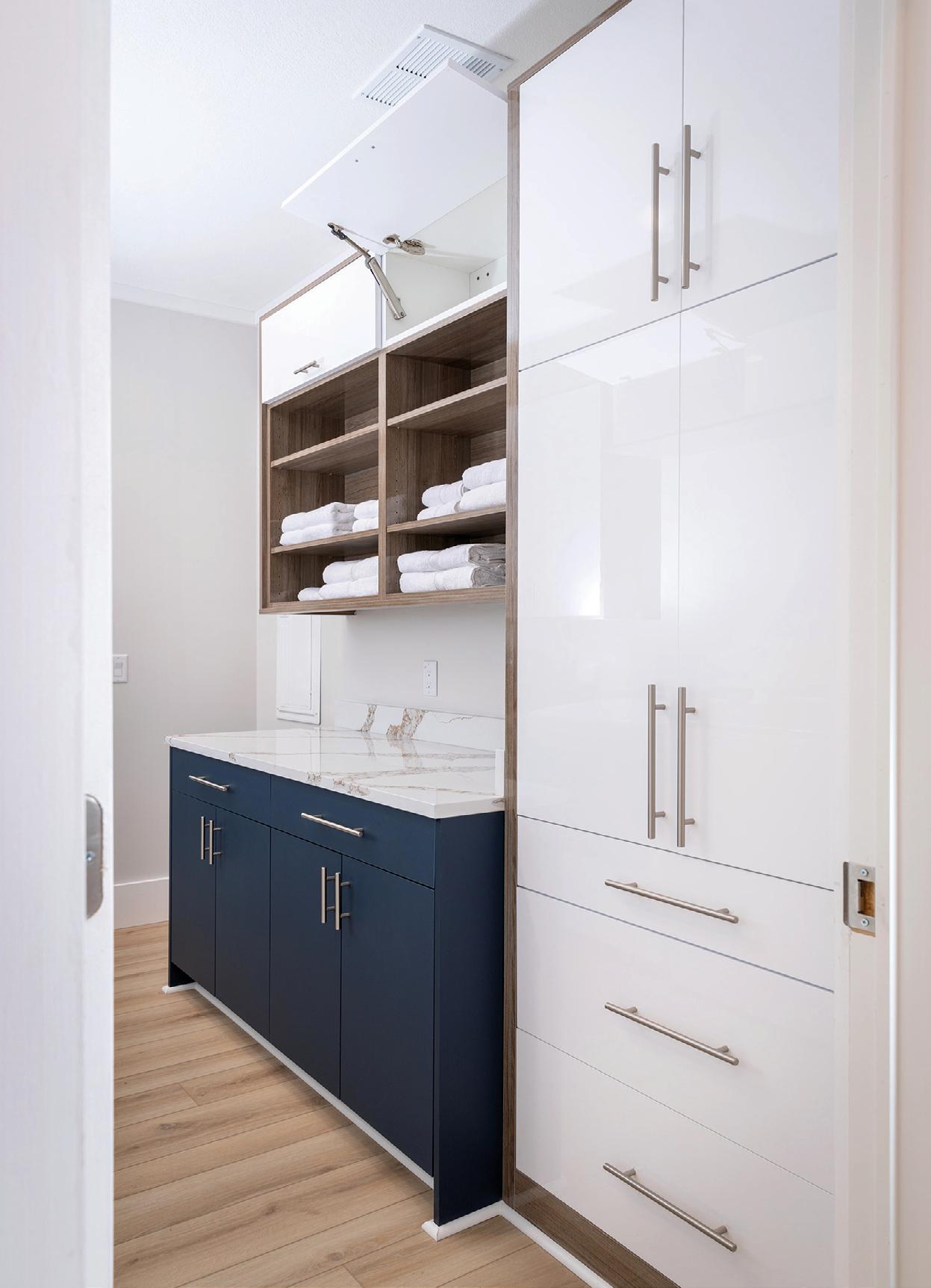 LAUNDRY ROOM— Getting motivated to do chores like laundry is easy when you have a beautiful setting for getting to work. Introducing pops of color in nontraditional places, like the cabinetry, adds a high-end elegance. Water-inspired and earthy hues like Midtown Matte Tide water or Arcadia Chiffon Cypress are perfect for the laundry space. Both are options in Well born Cabinet, Inc.’s Aspire Series, which features concealed hinges with self-close functionality and matching interiors for a high-class look, even when the doors are open for business.