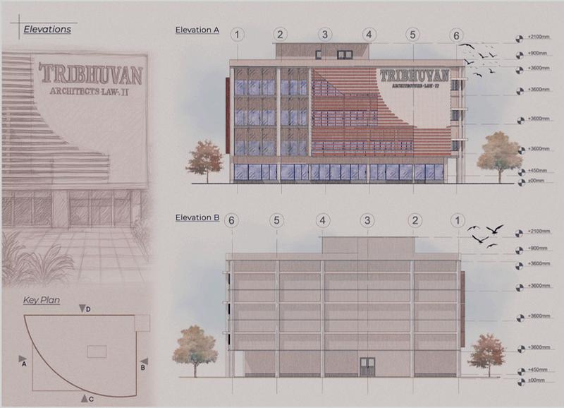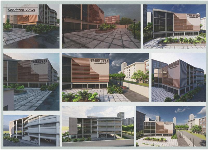 This project, "Tri Bhuvan," proposes the design of a multi-tenant office building intended to foster collaboration and innovation amongst three distinct yet interconnected professional fields: Architecture, Information Technology, and Law. Recognizing the inherent synergy between these disciplines - design's creative vision, technology's transformative power, and law's structural framework - Tri Bhuvan aims to create a dynamic and adaptable workspace that caters to the specific needs of each tenant while encouraging cross-disciplinary interaction.