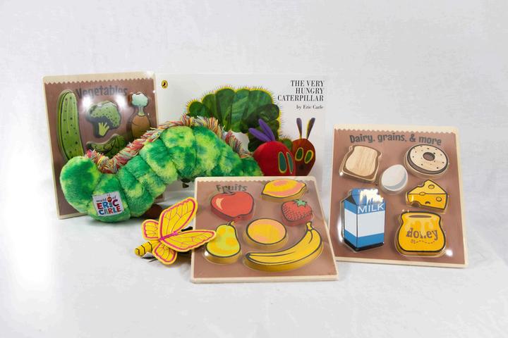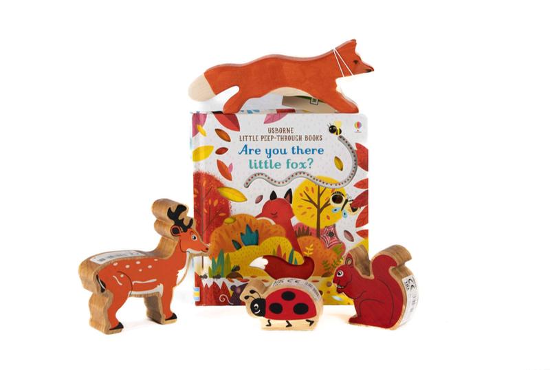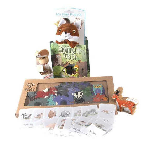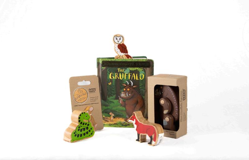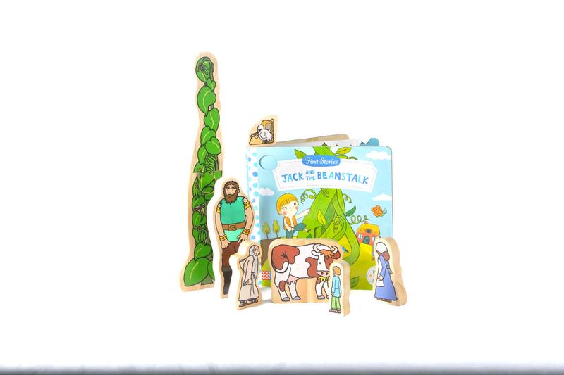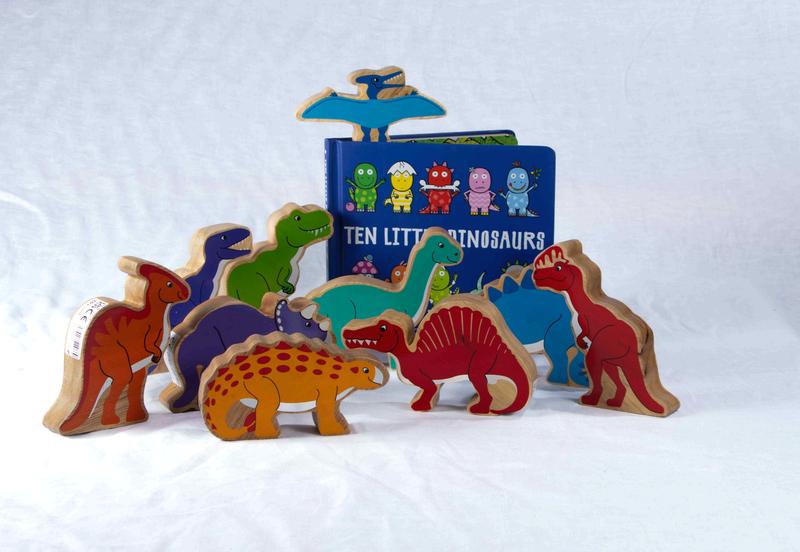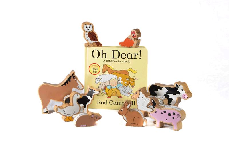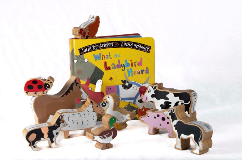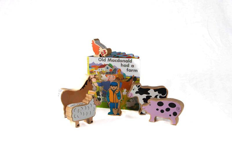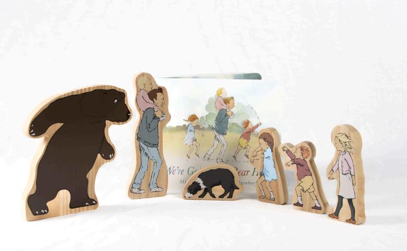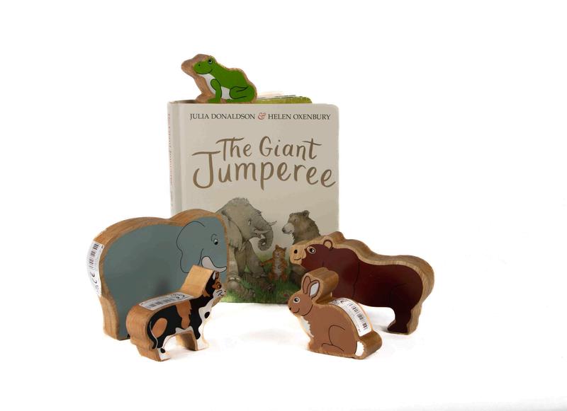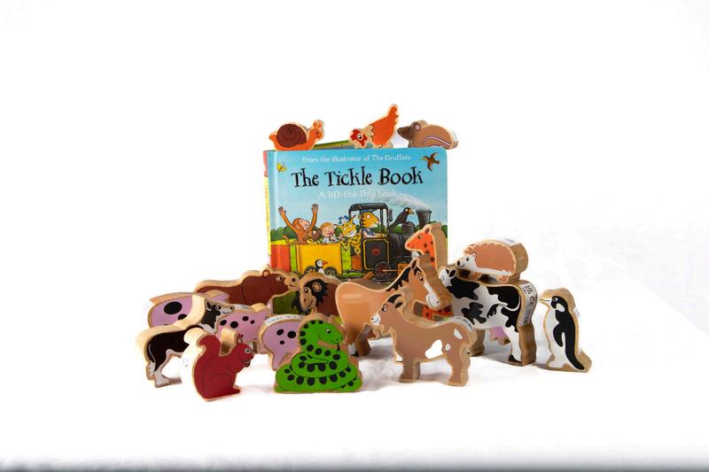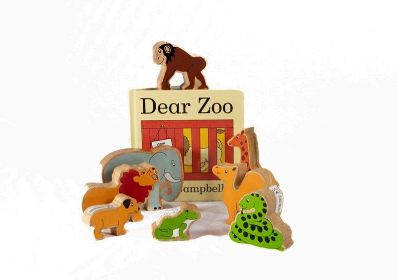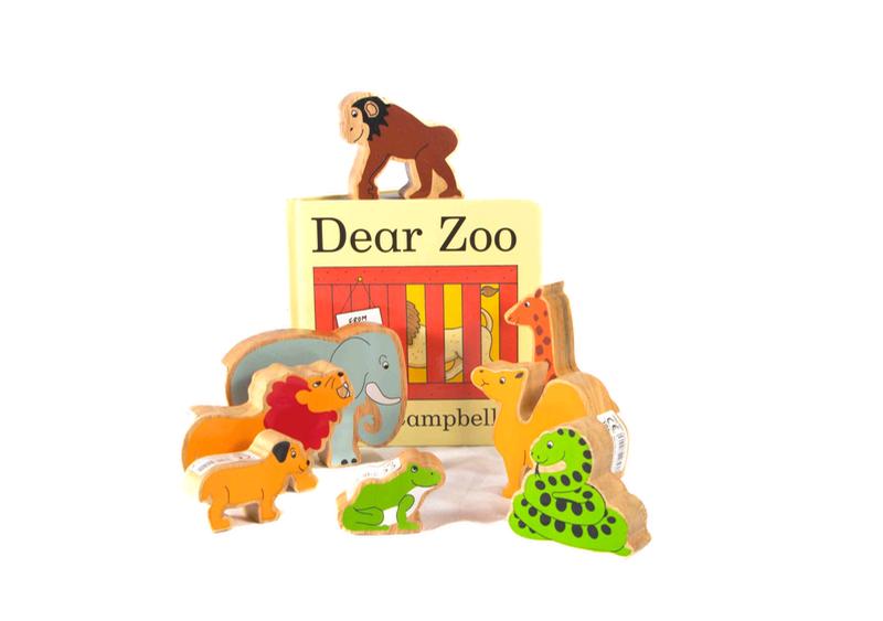 Wooden characters from the story including elephant, giraffe, lion, camel, snake, frog, monkey & puppy
